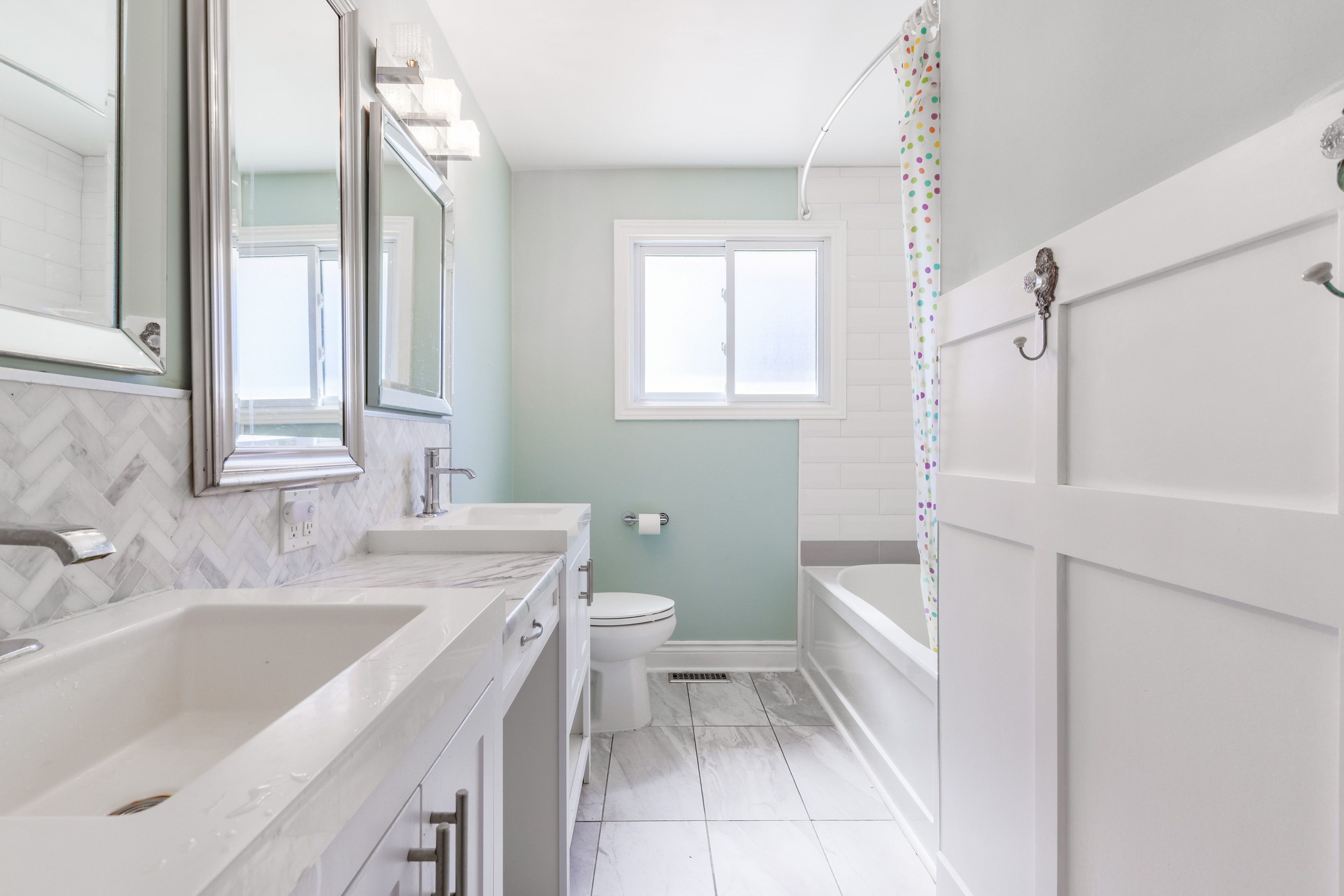 • Main floor features a bath with double vanity and tiled shower.