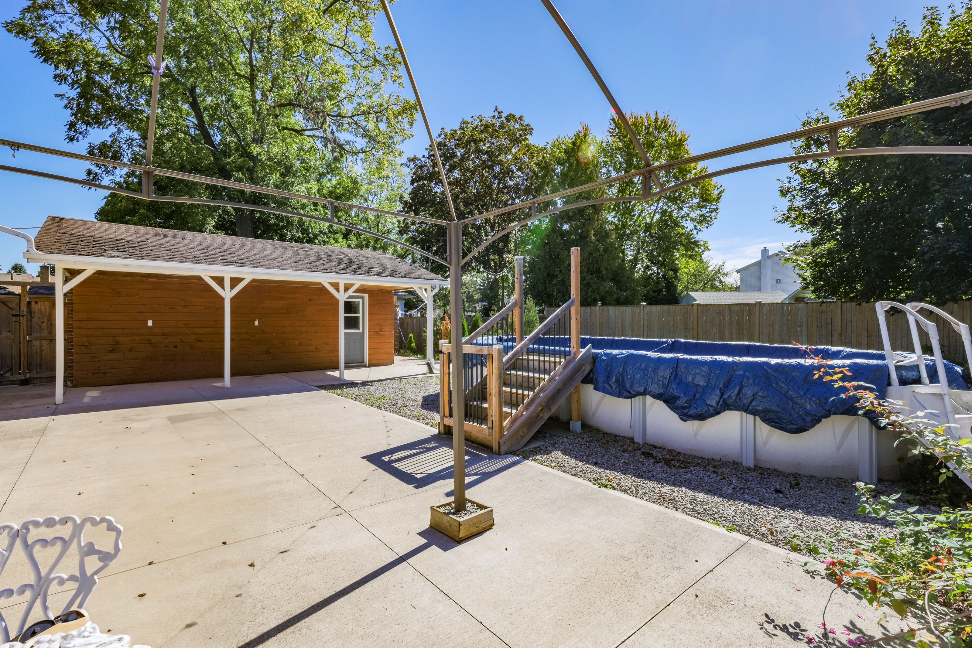 • Detached oversized garage, fenced yard, above ground pool, and patio area.