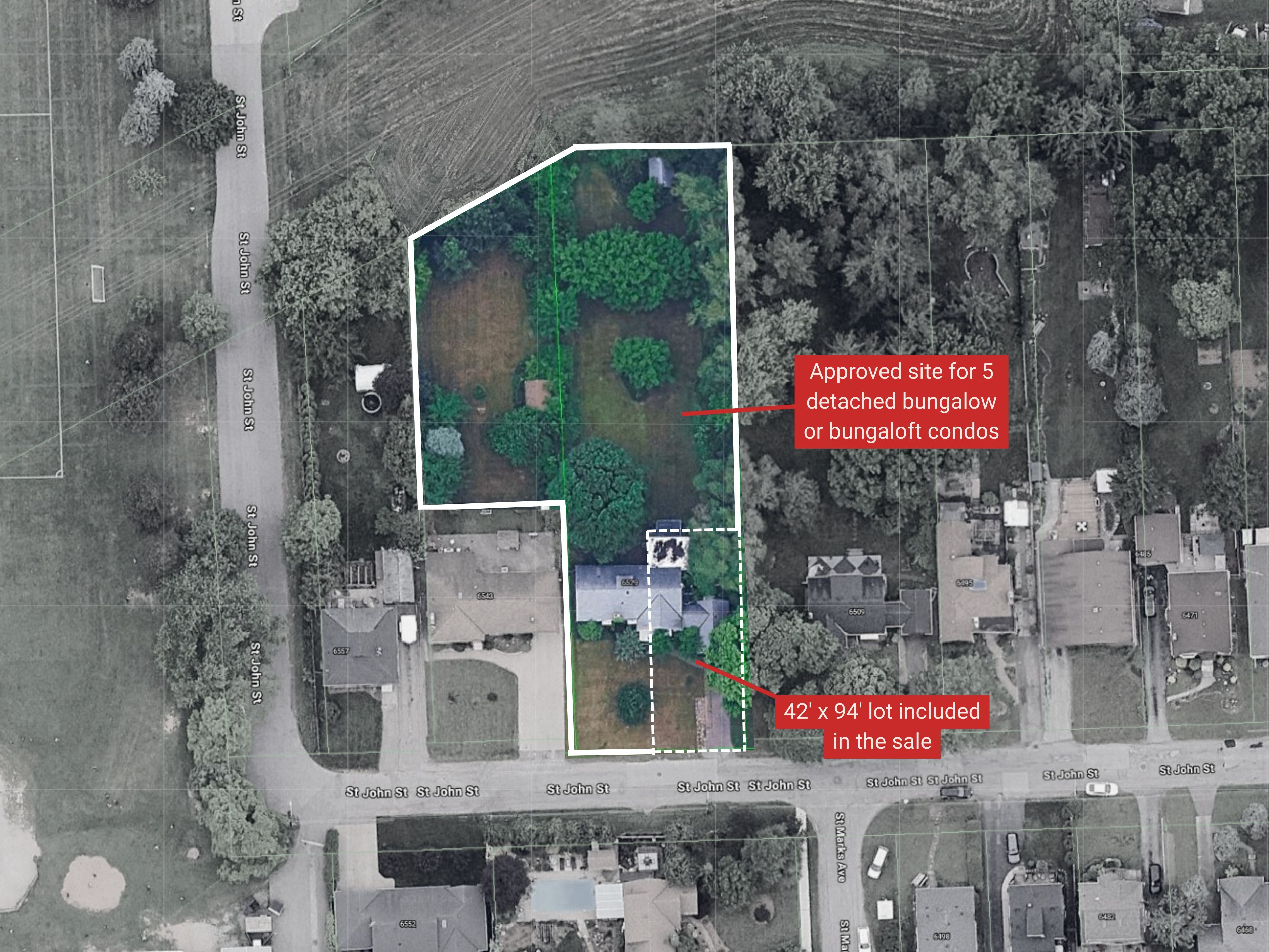 Prime development opportunity in a desirable niagara falls neighbourhood close to great schools, parks, shopping necessities and highway access. This 0. 831-acre parcel offers approved plans to build five (5) detached vacant land condominium units, ideal for bungalow or bungaloft designs. The approved concept includes the creation of an 41. 95 ft. X 94 ft. Building lot, that fronts onto st. John st on the eastern edge of the property - see the attached siteplan. The total parcel measures 83. 65 feet of frontage on st. John street with a depth of approximately 296 feet, expanding to a maximum width of 156 feet, allowing for a well-designed, low-density residential development. The successful purchaser will be required to proceed with either a plan of subdivision or plan of condominium with the city of niagara falls.