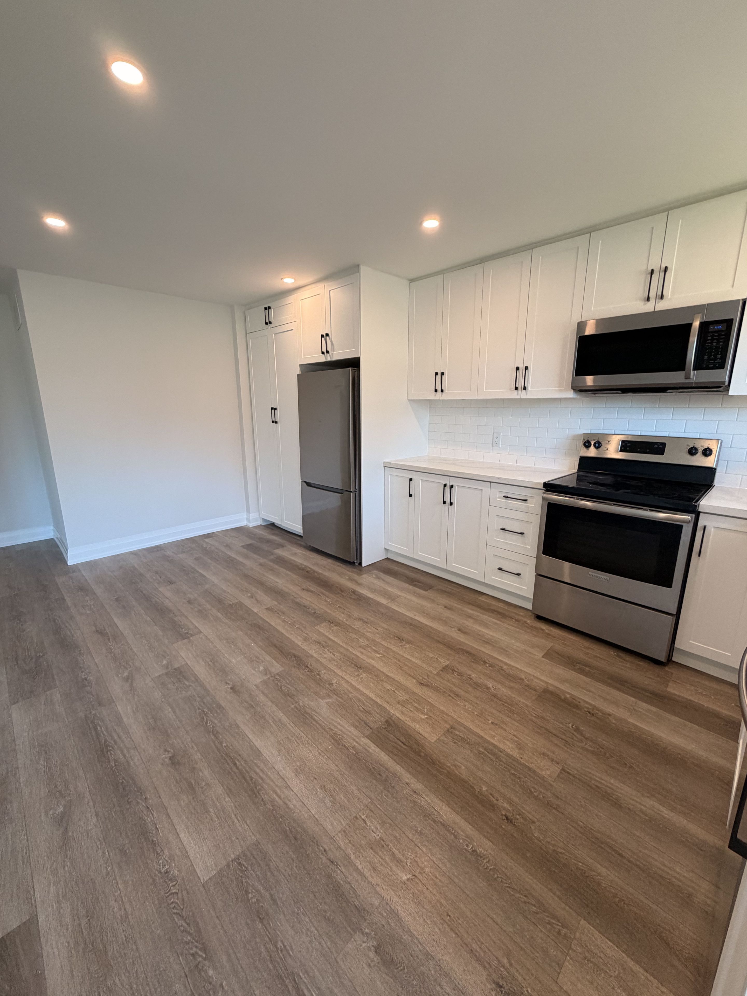 • Sun-filled kitchen with stainless steel appliances and modern finishes.
