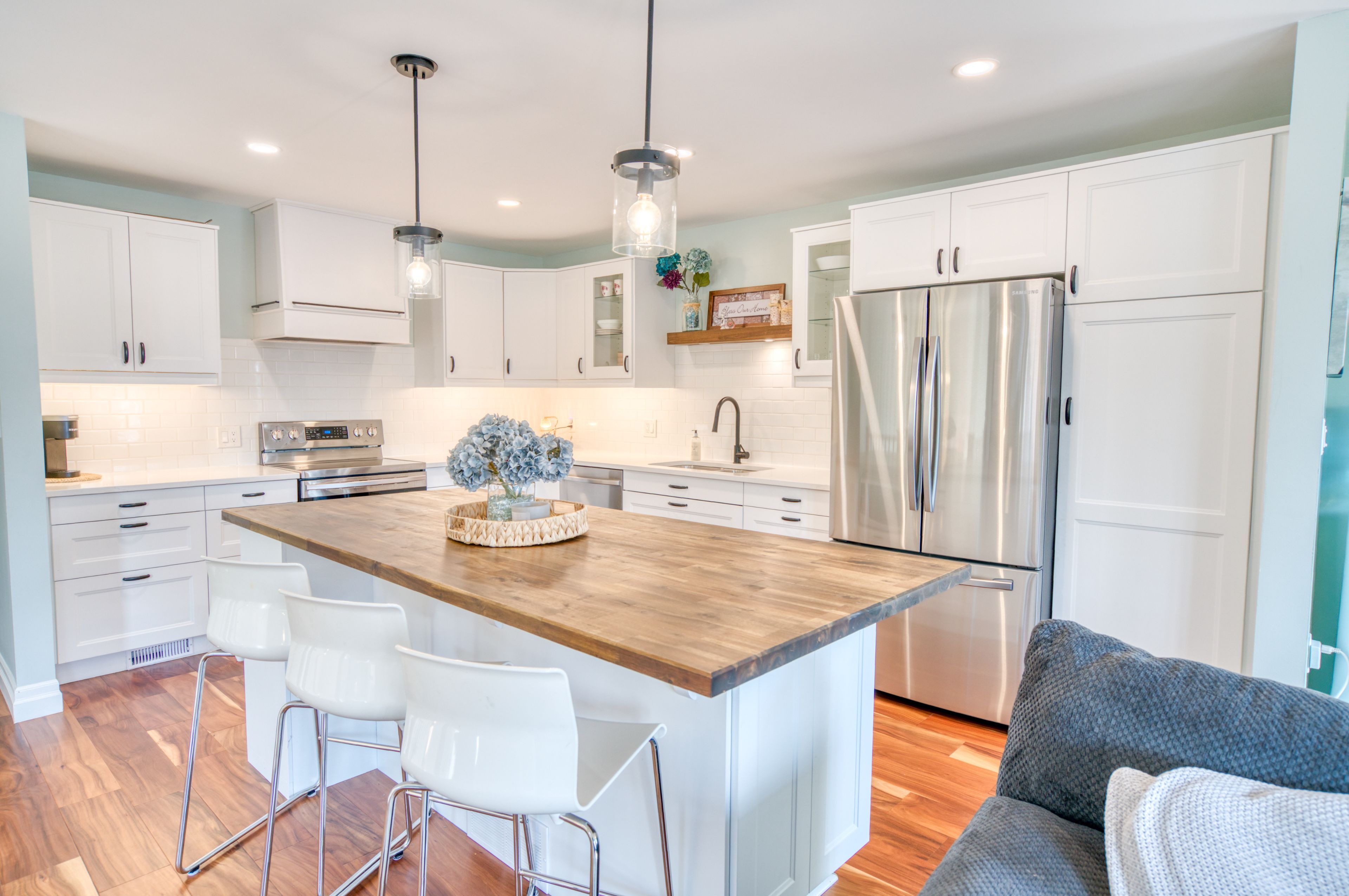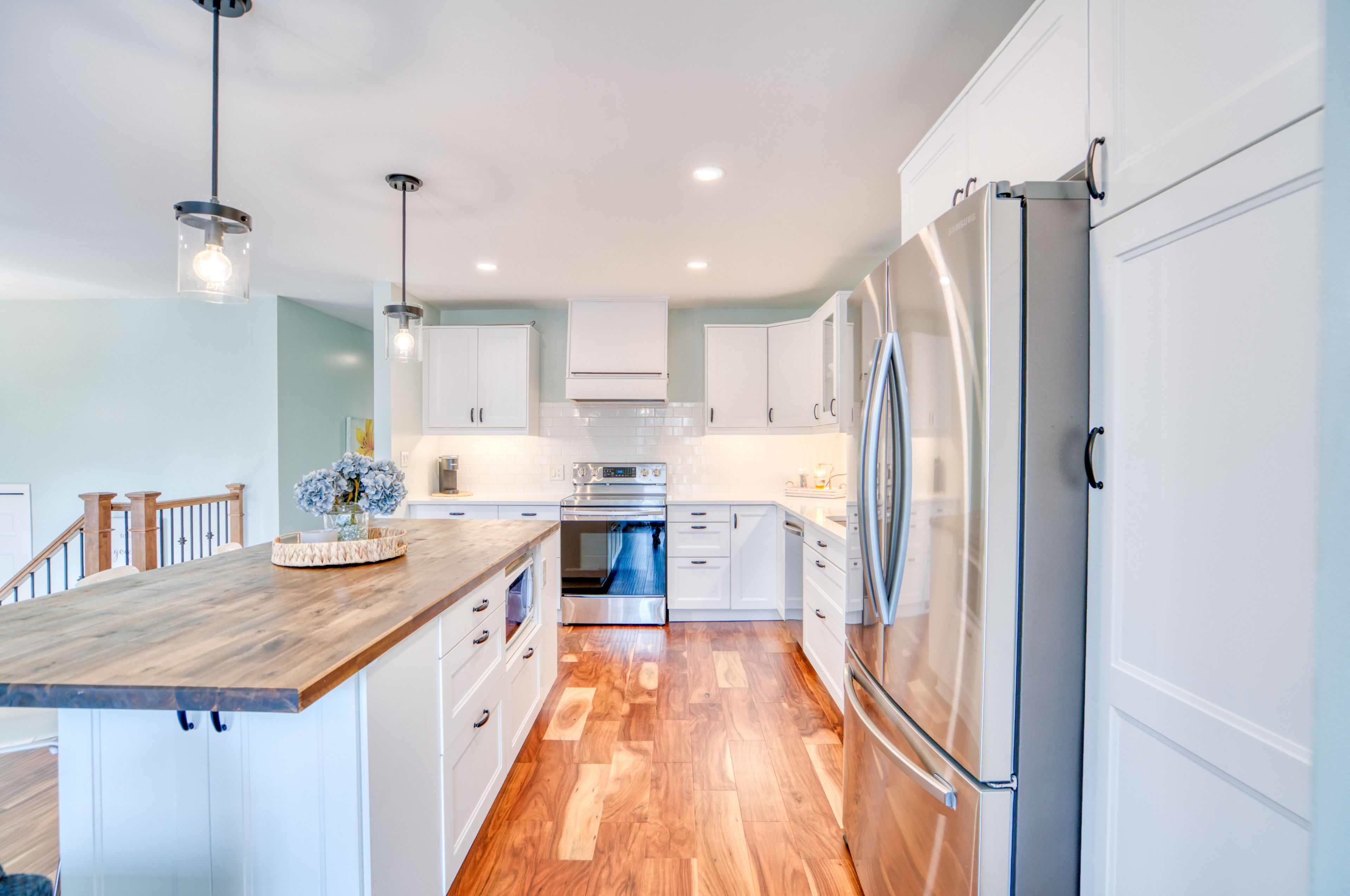 • Impressive kitchen with quartz countertops, large island, and stainless steel appliances.