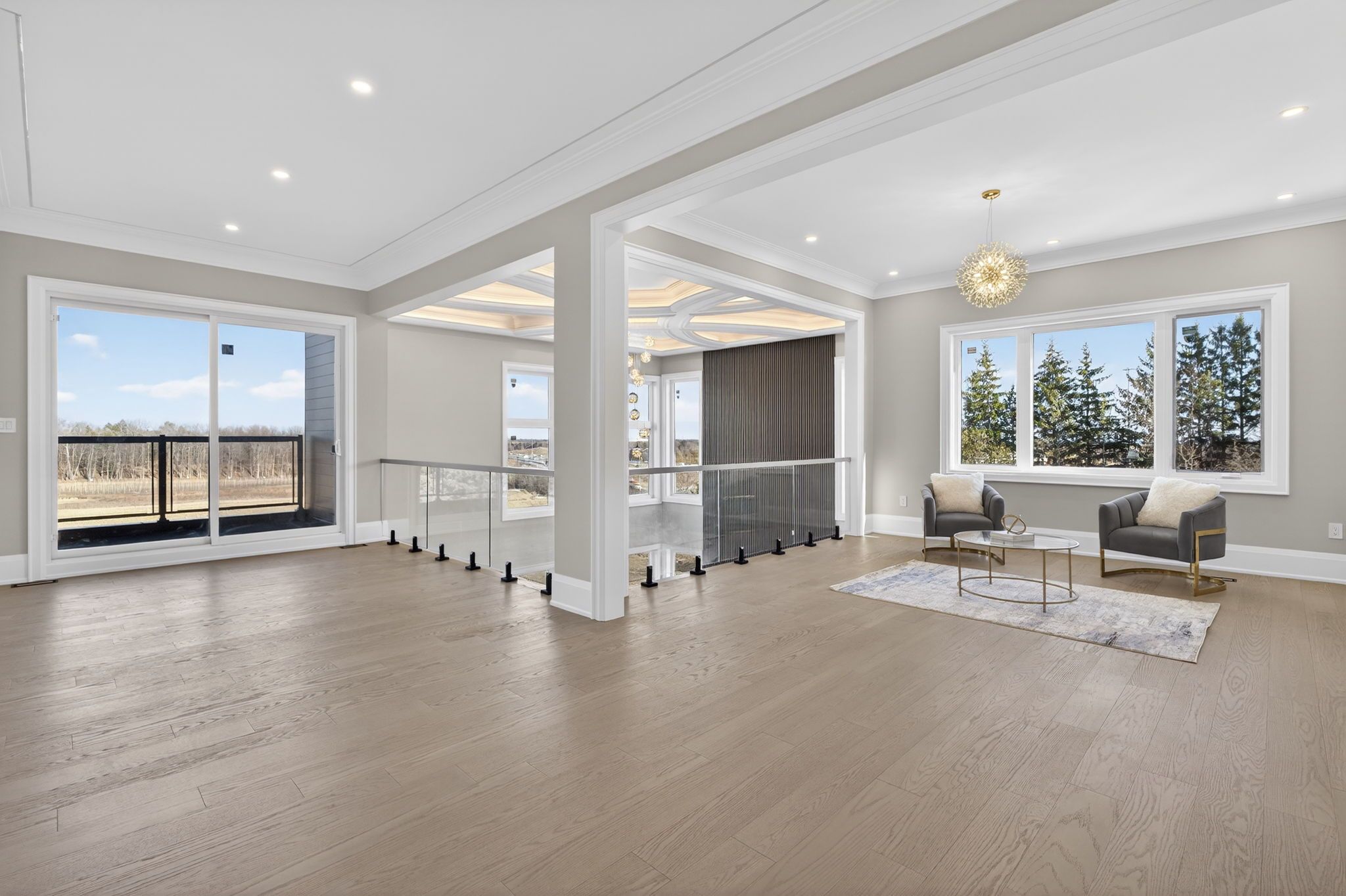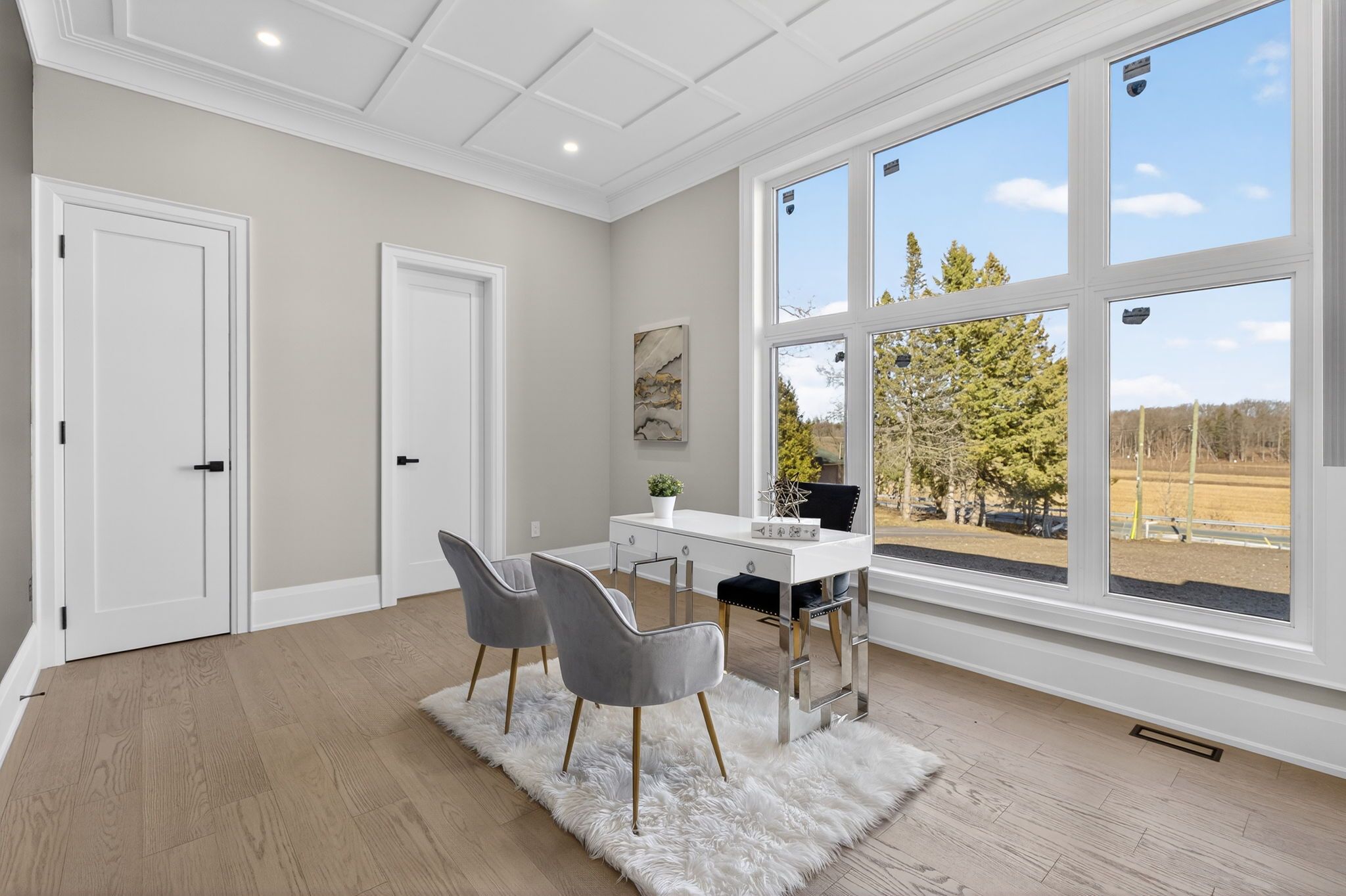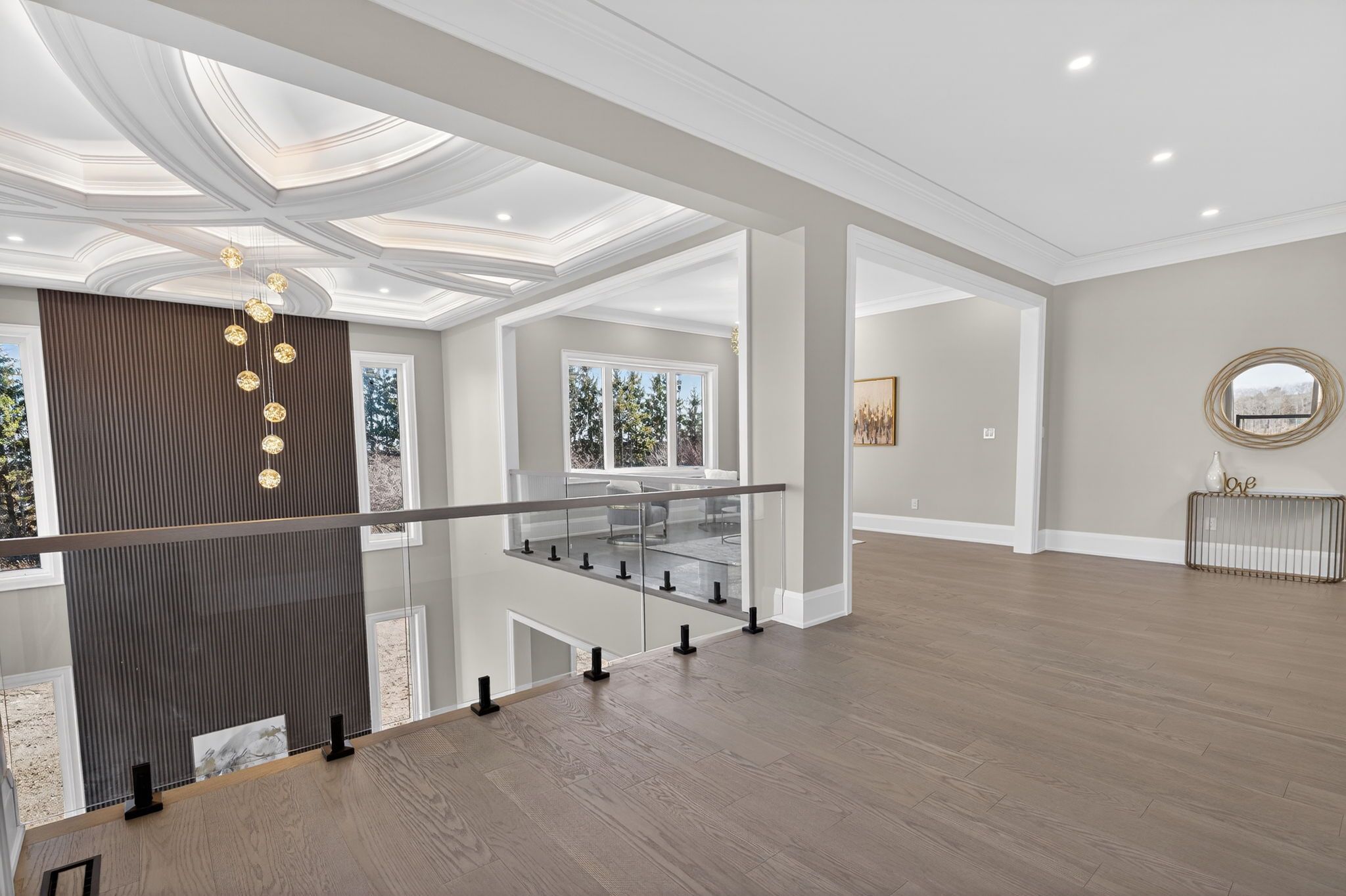 Brand new custom-built luxury estate on premium 2. 25-acre east-facing lot! Approx. 8,500 sq ft of finished living space. Featuring 4+1 bedrooms and 8bathrooms with exceptional craftsmanship and high-end finishes throughout. Main floor offers 12-ft ceilings and grand open-concept layout with stunning24-ft coffered ceiling in living room. Gourmet kitchen with premium appliances and modern finishes open to spacious family room with fireplace and backyard views. Main floor office or bedroom with ensuite. Second floor boasts 10-ft ceilings. Luxurious primary suite with private balcony, 6-piece spa-like ensuite and custom walk-in closet. All additional bedrooms feature ensuites and walk-in closets. Includes sitting area, walkout balcony and second-floor laundry. Fully finished basement with 10-ft ceilings featuring bar, media room, gym and additional bedroom with ensuite. Upgrades include heated floors in all bathrooms, spray foam insulation on exterior walls and modern flat roof design. 3-car garage with extra-height doors and extended driveway accommodating 15-20 vehicles. Conveniently located near hwy 407/412 and golf courses. Must see.....