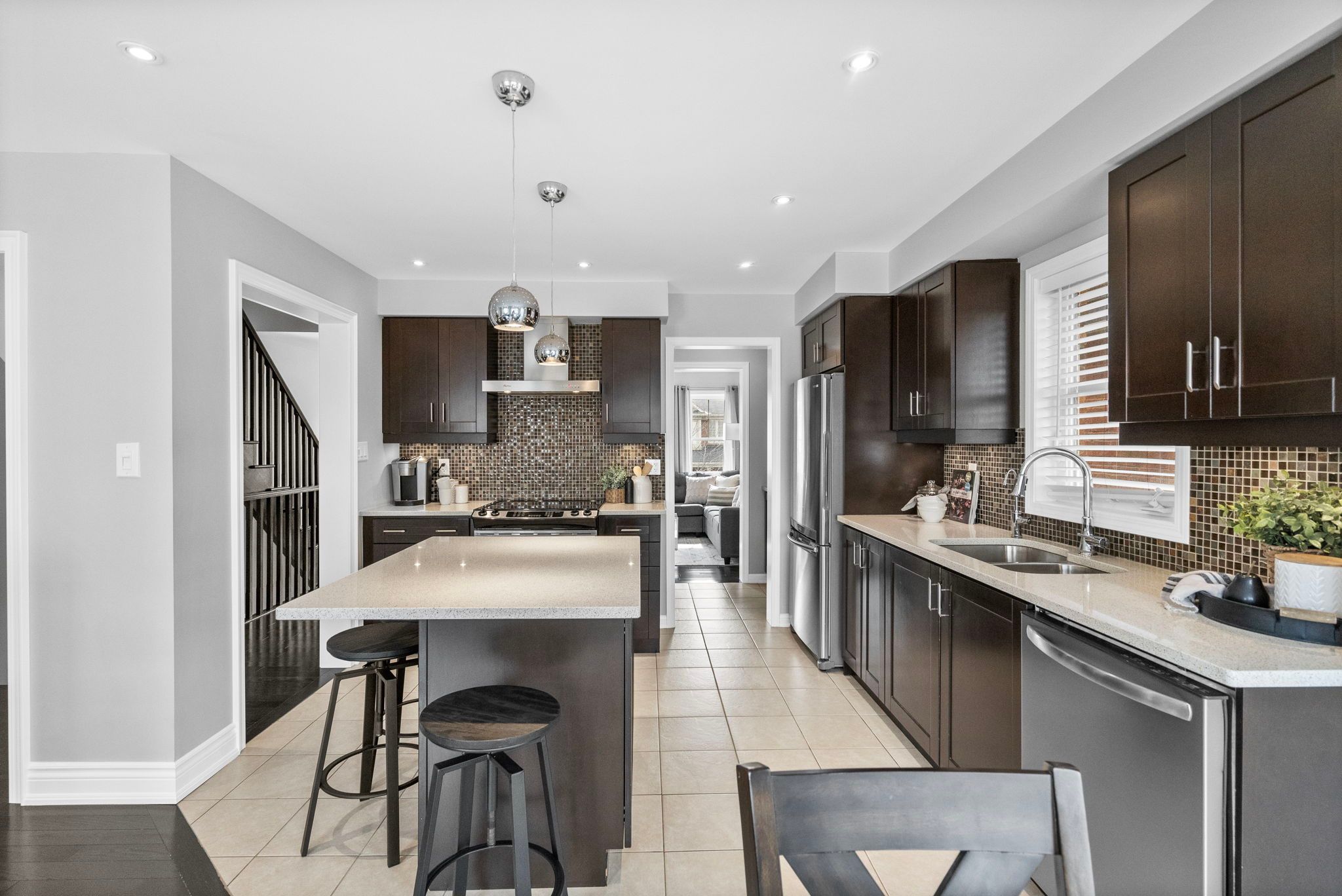 Step into something truly exceptional-this is not your typical townhome. From the moment you enter, you'll notice a layout that stands apart, designed to impress at every turn. Bathed in bright natural light, this home is nothing short of show-stopping. Rich hardwood floors and elegant oak staircases set the tone throughout. The main floor is both functional and inviting, featuring a welcoming foyer, a comfortable family room perfect for relaxing or entertaining, a fully finished laundry room with ample storage, and convenient access to the garage-making everyday living effortless. Upstairs, the heart of the home unfolds with a beautifully designed kitchen and breakfast area that leads to a gorgeous deck-ideal for morning coffee or summer evenings. A butler's pantry provides a seamless transition into the living room, where a second deck extends your livingspace outdoors. A full dining room offers the perfect setting for hosting family and friends. Retreat to the oversized primary suite, complete with a stunning ensuite featuring a soaker tub, updated glass shower, and striking black granite countertops. Two additional bedrooms are bright and spacious, complemented by a well-appointed main bath. And the lifestyle? Just as impressive. Located just moments from coates neighbourhood park, you'll enjoy access to a splash pad, basketball court, walking trails, pond, and playground-plus close proximity to both public and private elementary schools. This is more than a home-it's a rare opportunity to own something truly unique.