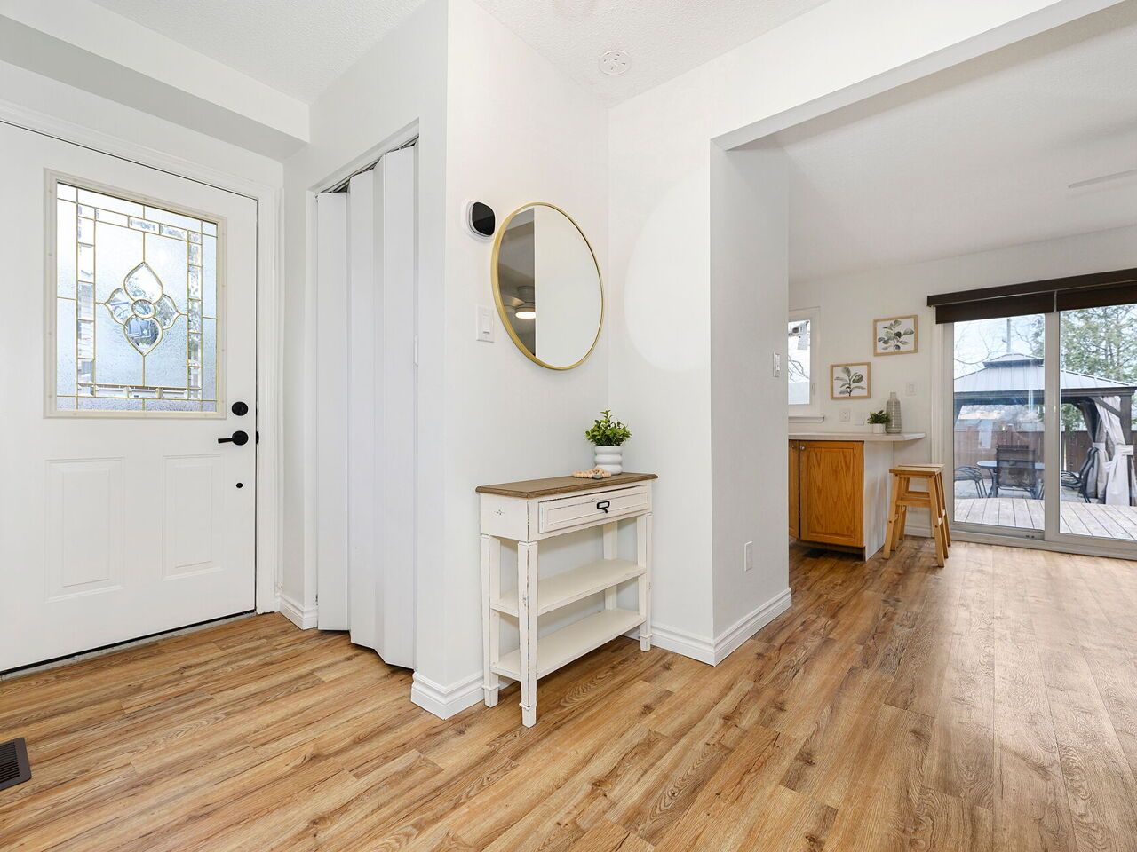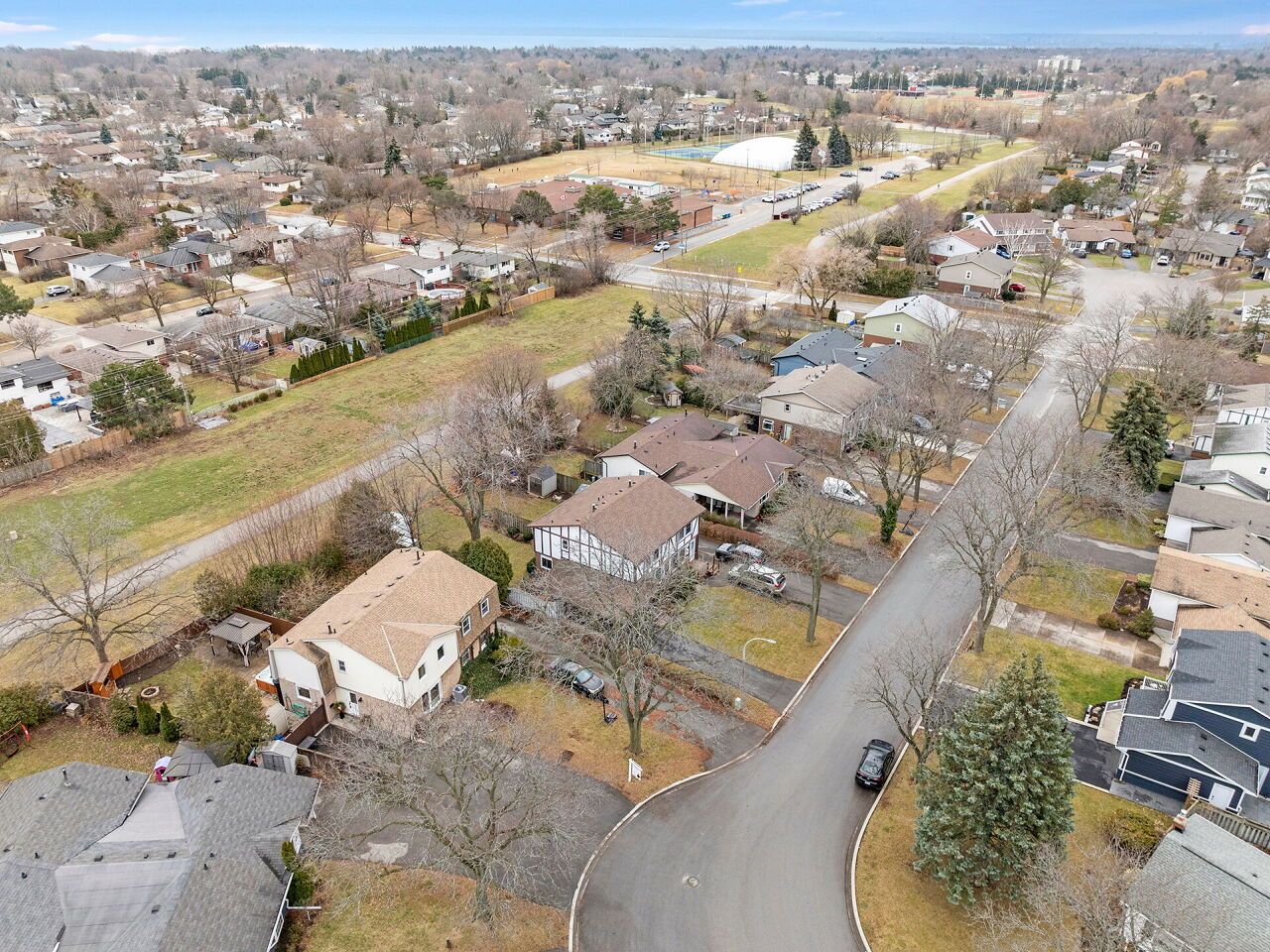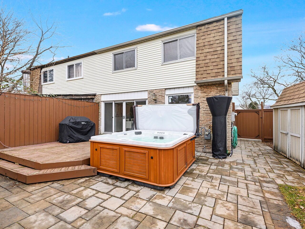 Welcome to this beautiful freehold semi-detached home tucked away on a quiet crescent in south burlington's sought-after longmoor community. Backing onto serene green space and the centennial bikeway, this rare pie-shaped lot offers exceptional privacy and outdoor enjoyment. Inside, the home features 4 bedrooms, 2 full bathrooms, and 1336 square feet of comfortable living space. The spacious and inviting living room is highlighted by an oversized bay window that fills the home with natural light. A functional kitchen with peninsula flows seamlessly into the eat-in dining area, complete with sliding doors to the backyard. The fully finished basement adds incredible value, featuring a modern 3-piece bathroom with stand-up shower and versatile space perfect for a family room, guest suite, or home office. Step outside to an entertainer's dream backyard with a concrete patio, hot tub, and a custom built tv cabinet-ideal for hosting year-round. With parking for up to 6 cars, this home is as practical as it is impressive. Bonus updates include: windows in front bedrooms and kitchen (2025), roof (2017), furnace and ac (2025), driveway (2020), back patio and front steps (2020), hot tub (2021), outdoor tv cabinet (2020), esa certified (2025). Basement and bathroom renovation (2025). This home is conveniently located close to major amenities, highways, parks, schools, and more, this home offers the perfect blend of lifestyle, comfort, and location, you won't want to miss this one!