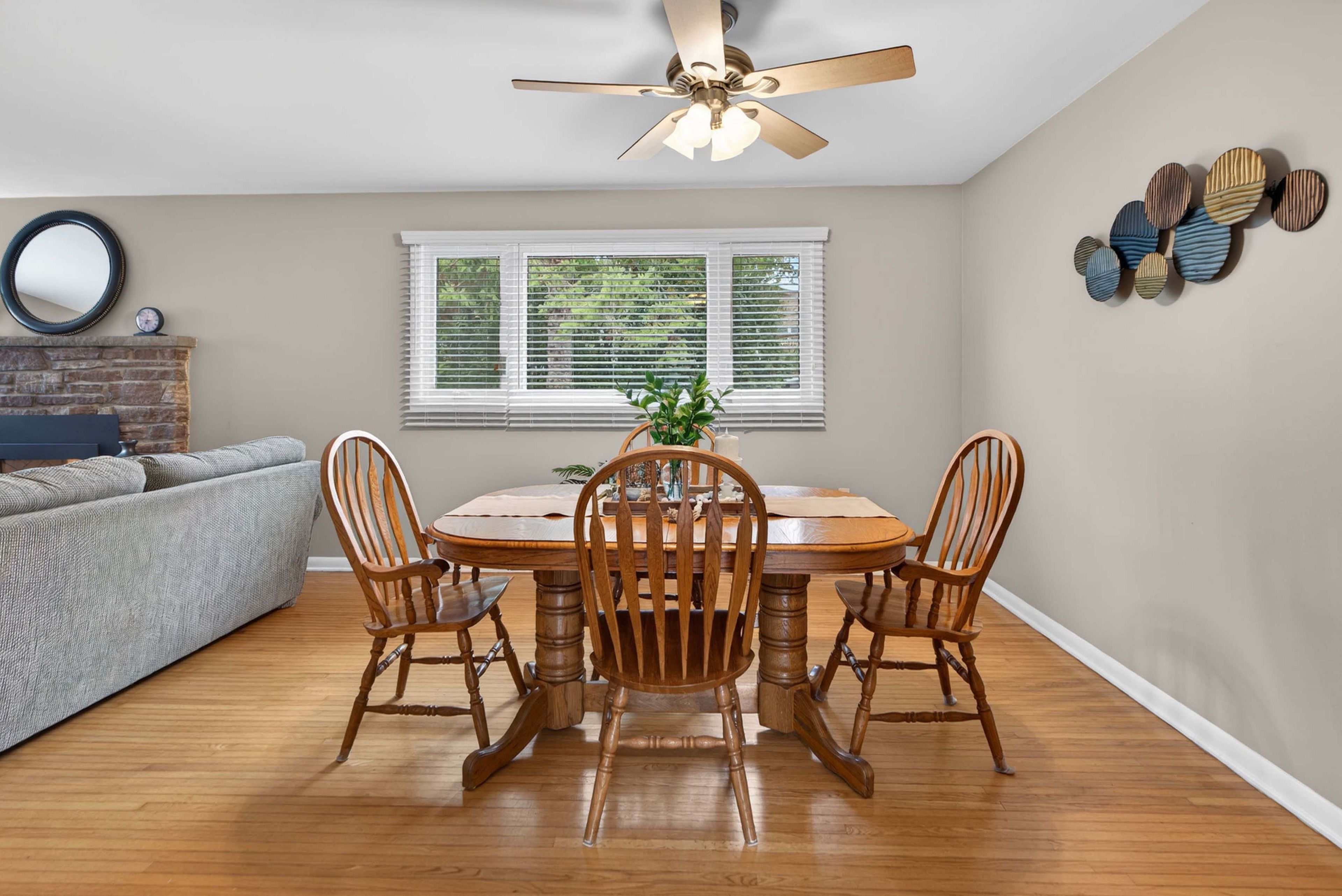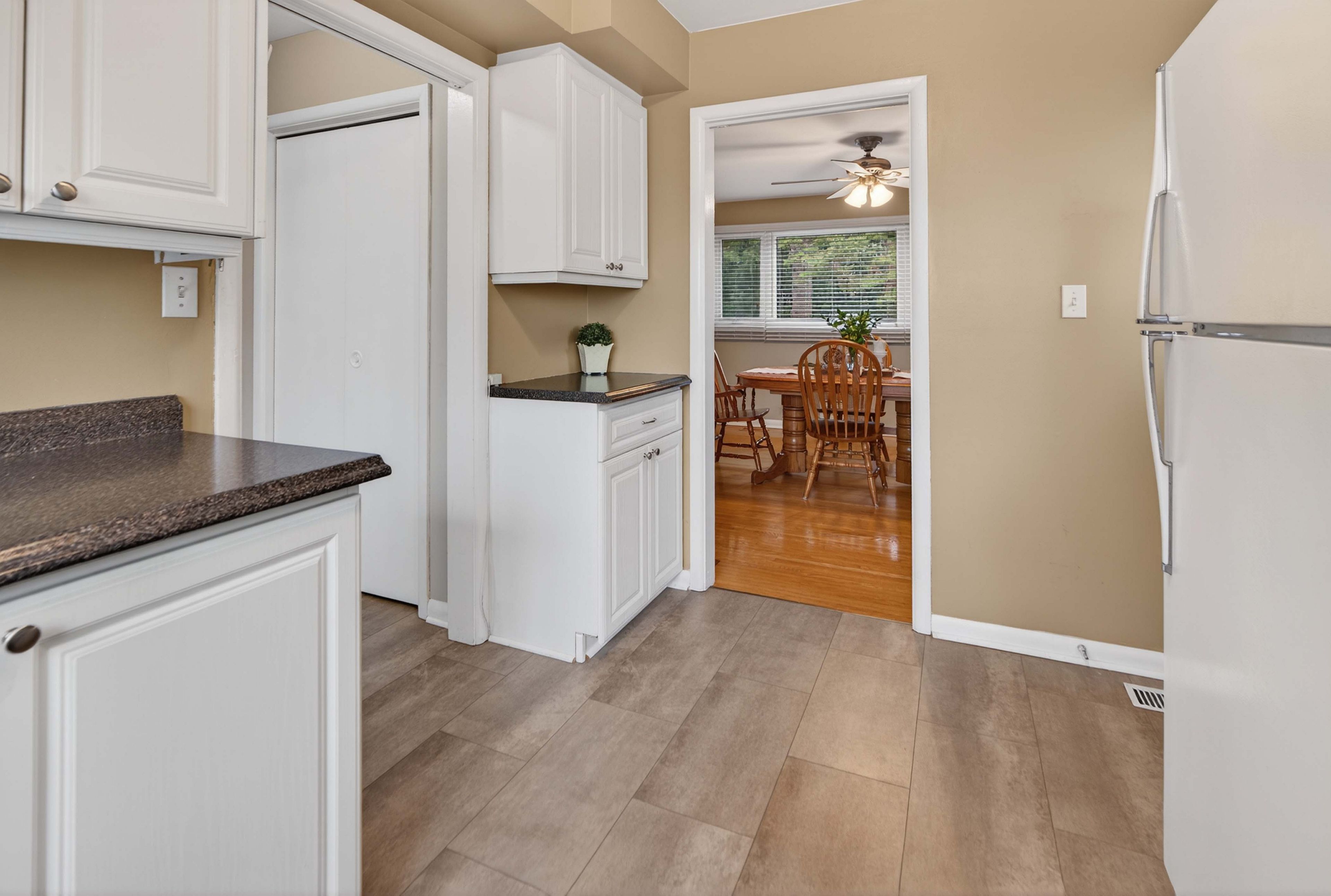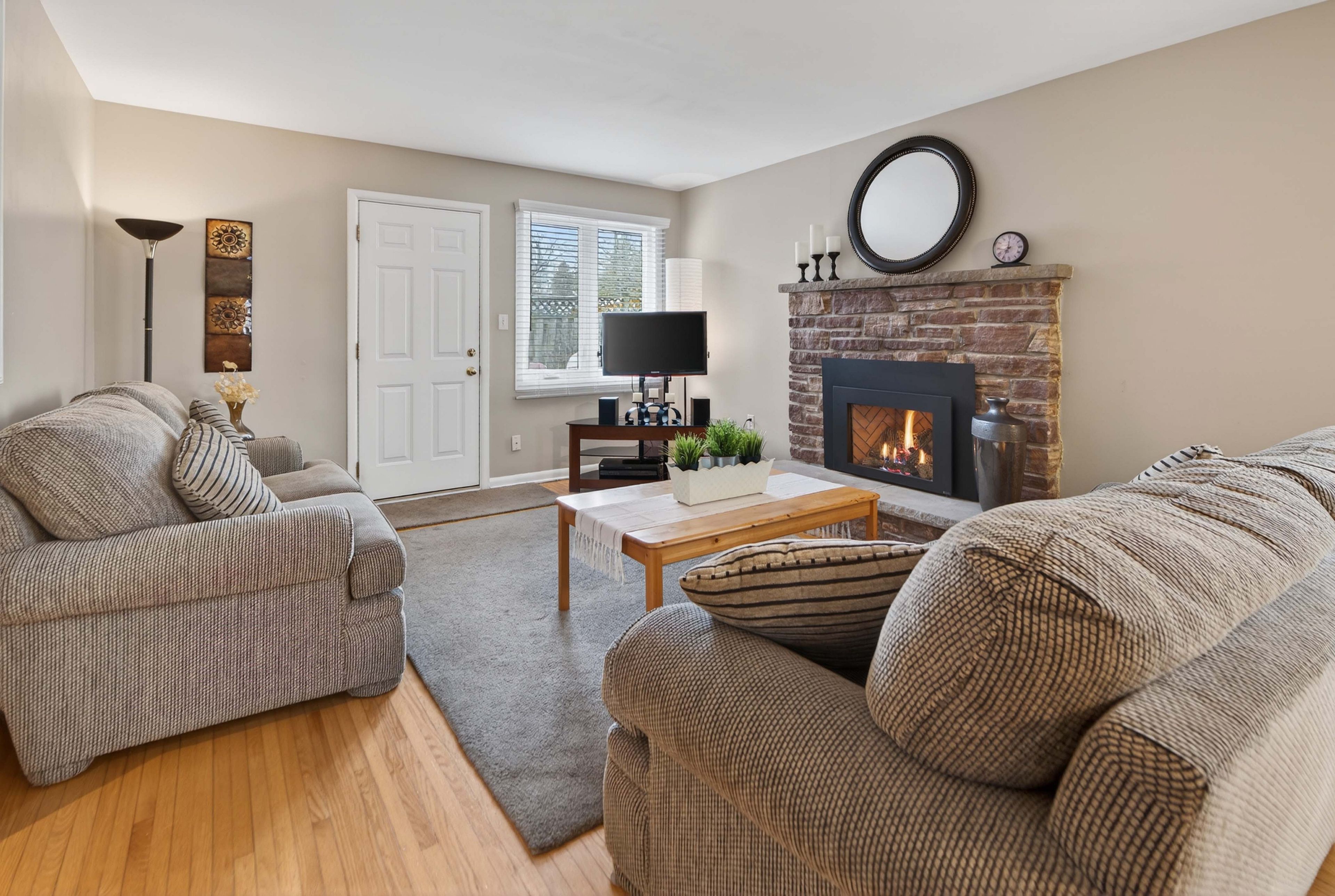 • Bright white kitchen flows into spacious dining and living area with fireplace.