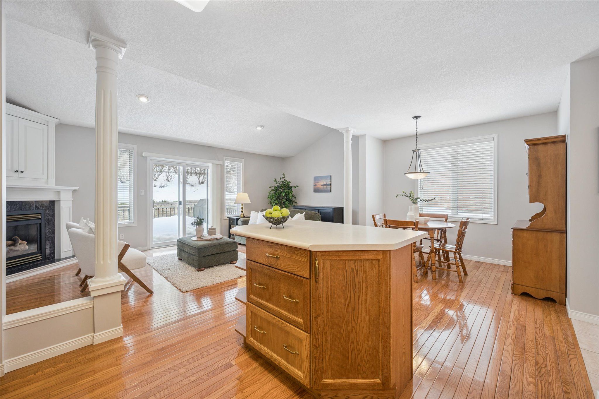 • Open concept kitchen and family room with a moveable island.