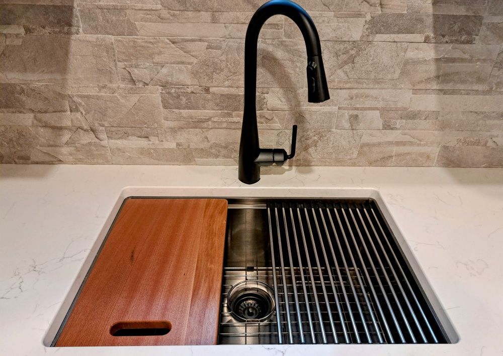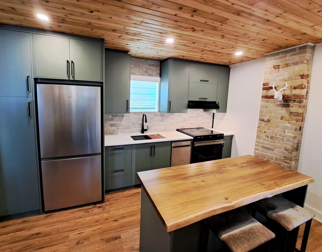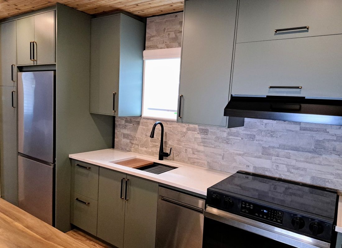 • Modern kitchen with quartz countertops and plenty of natural sunlight.
