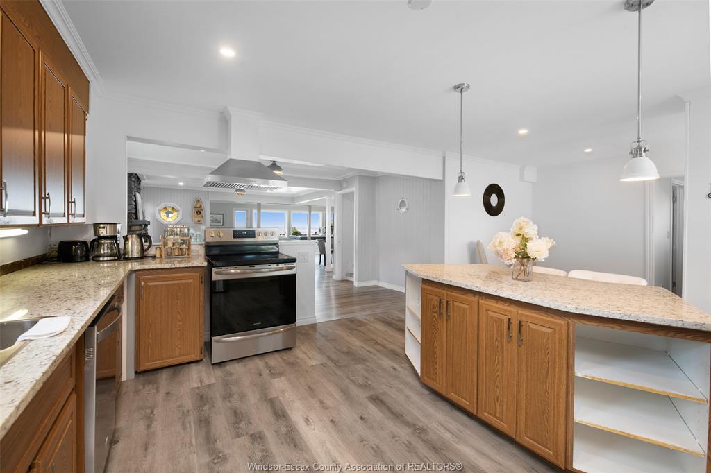 • Modern kitchen equipped with pot lights and sleek quartz countertops.
