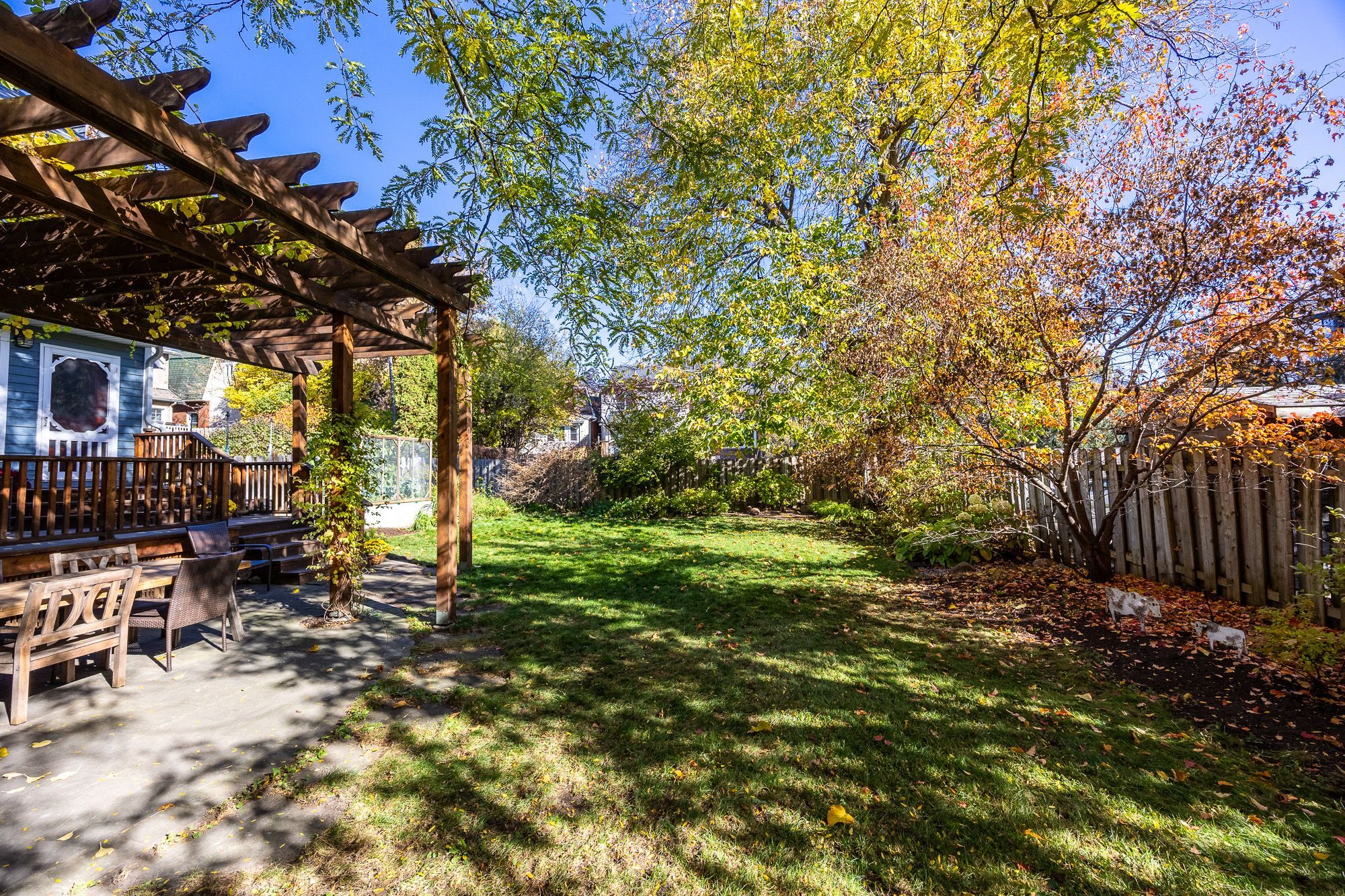 • Spacious backyard retreat with mature trees, patio, and pergola.