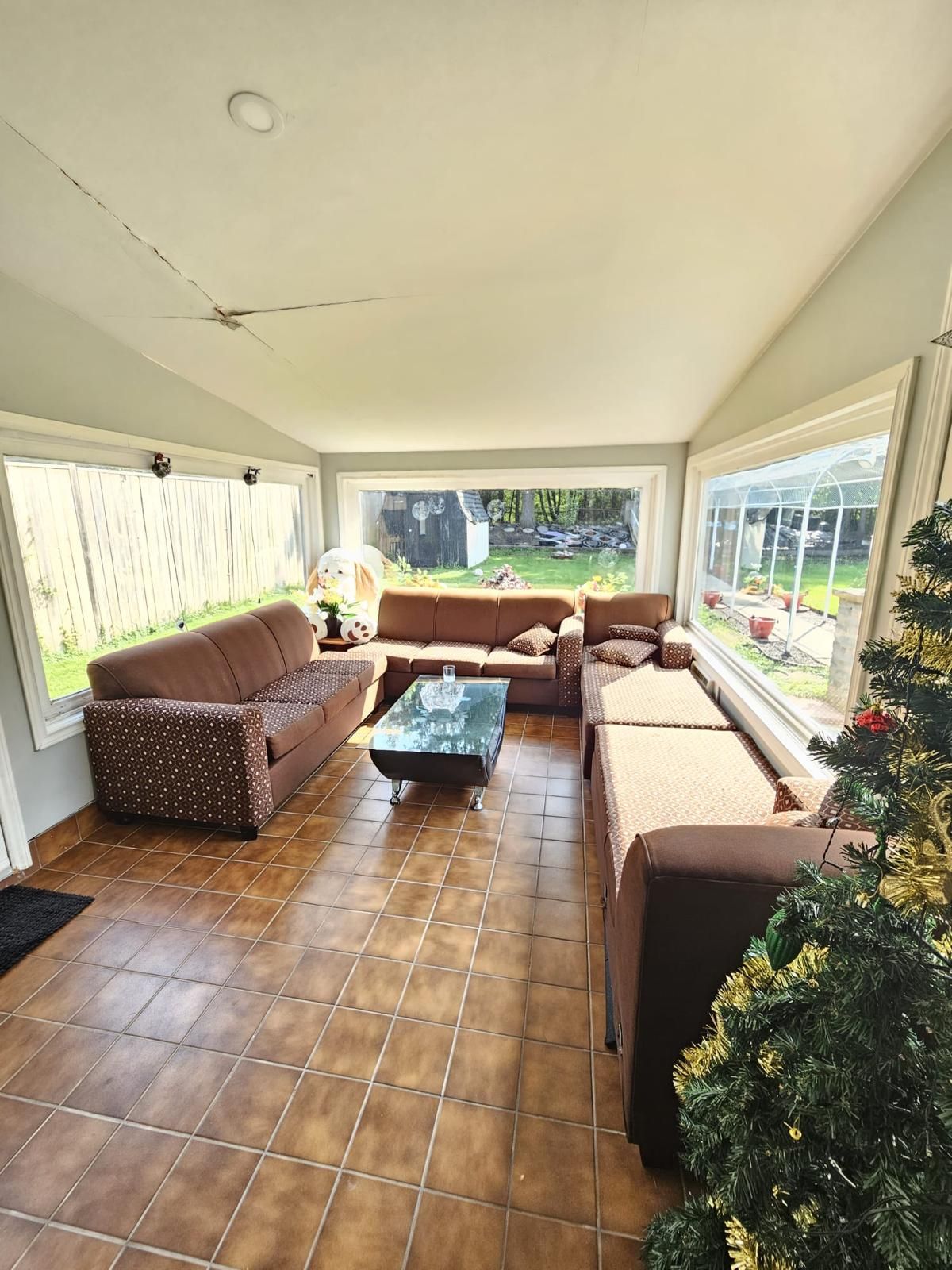 • Bright sunroom overlooking a beautiful backyard garden.