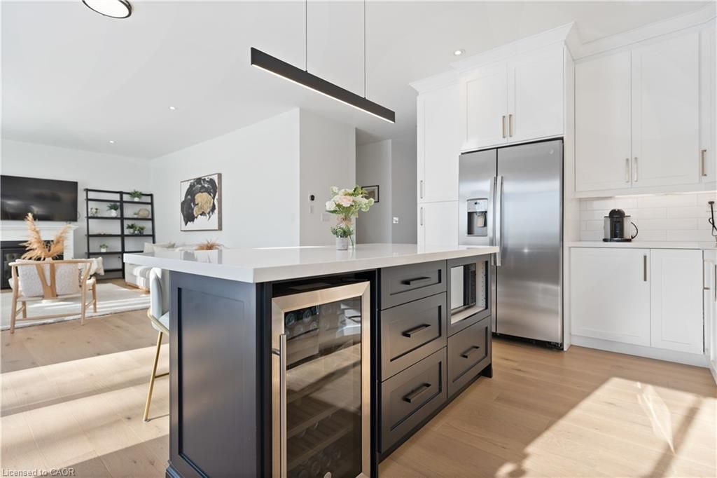 • Large U-shaped kitchen featuring quartz countertops and an oversized breakfast bar.