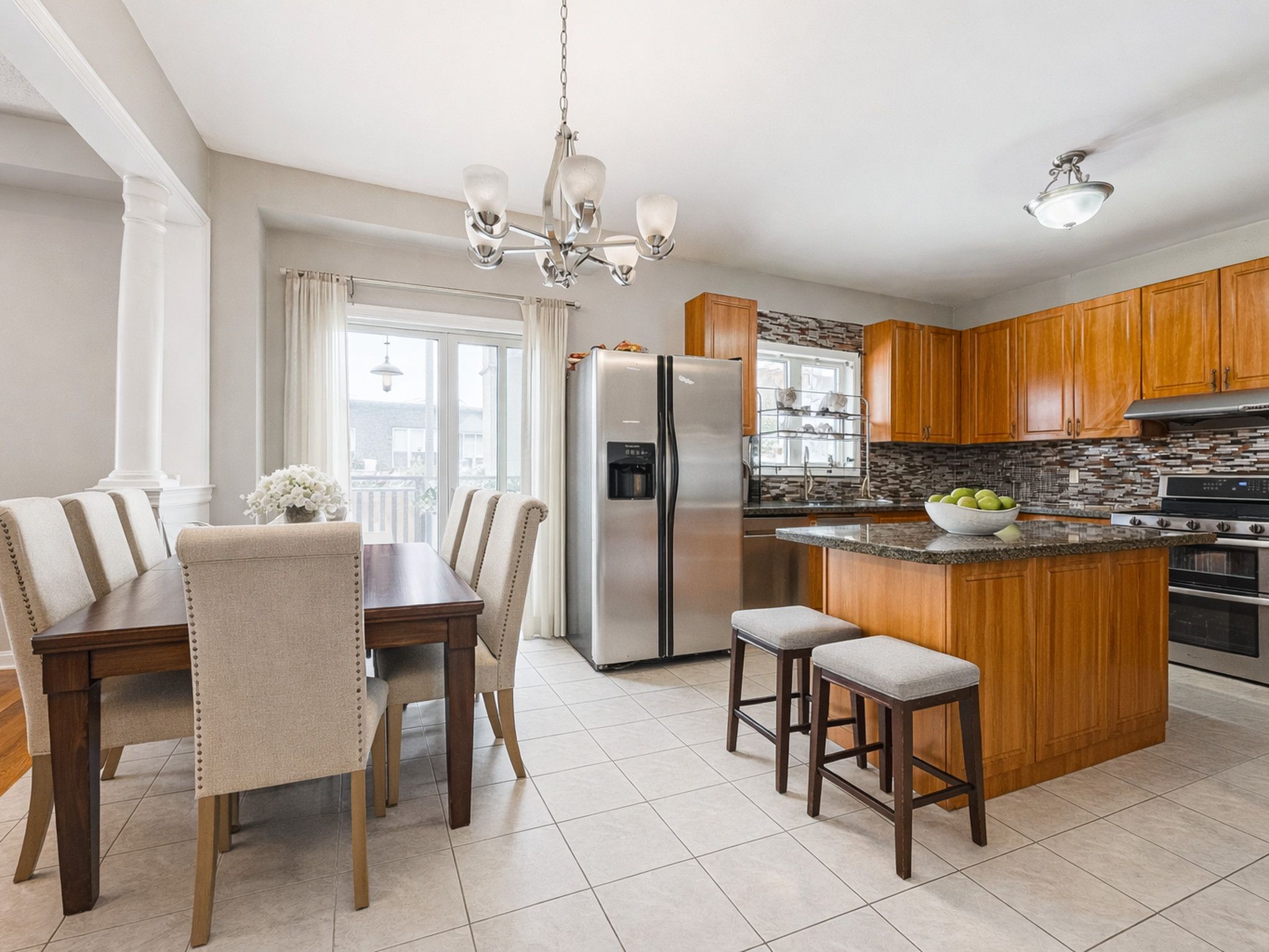 • Gourmet eat-in kitchen features granite counters and potlights.