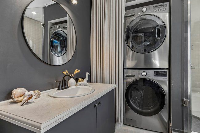 • Unique dual-bathroom layout includes soaker tub and glass rain shower.
