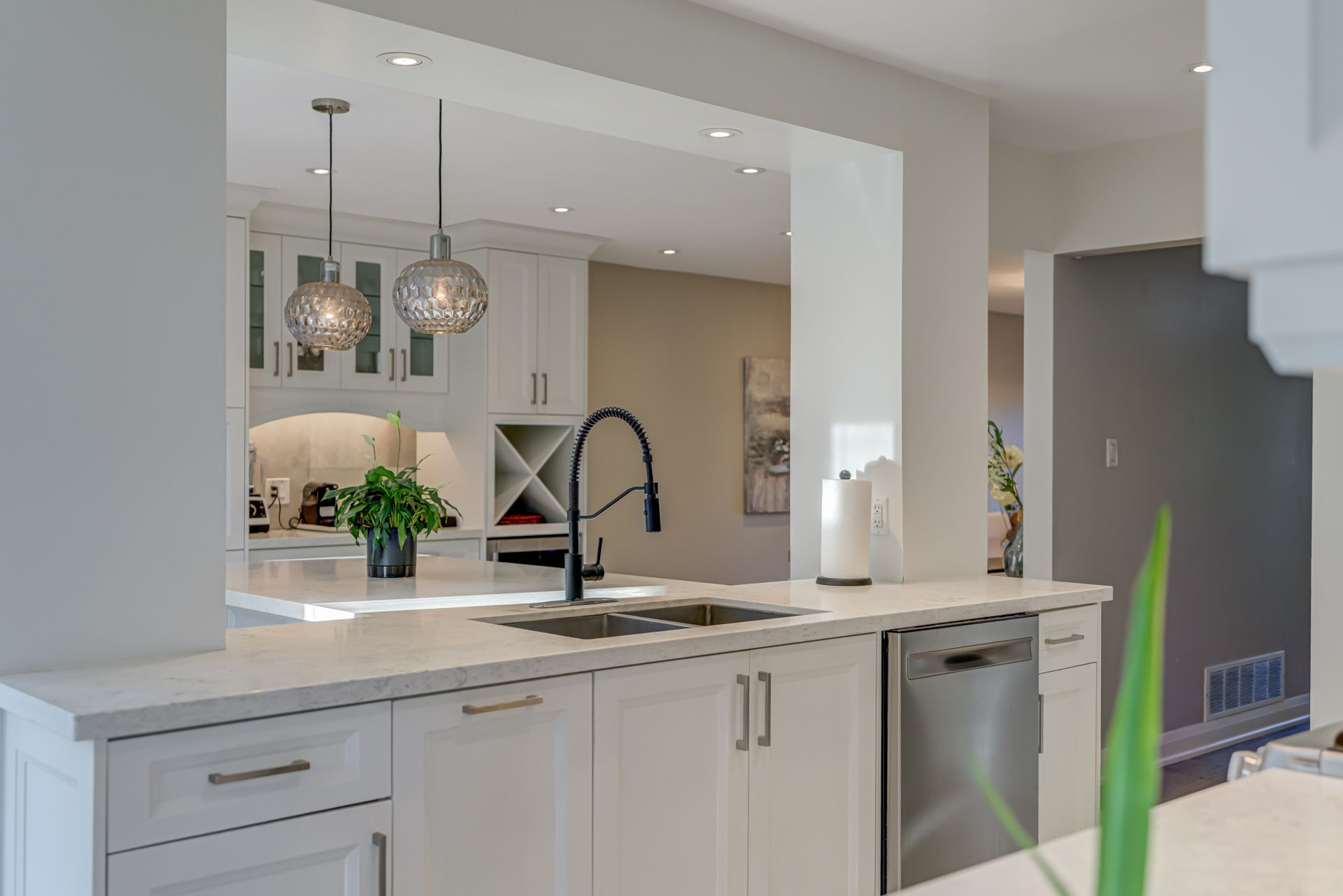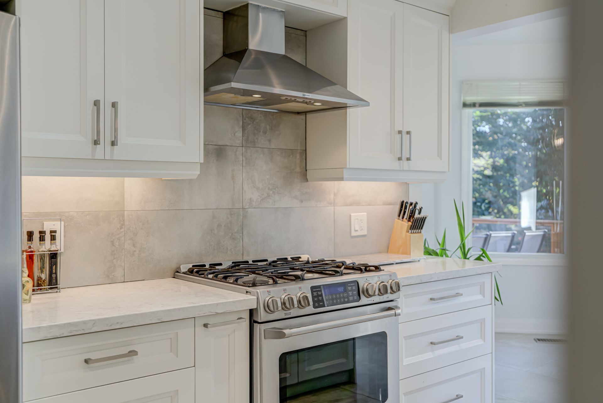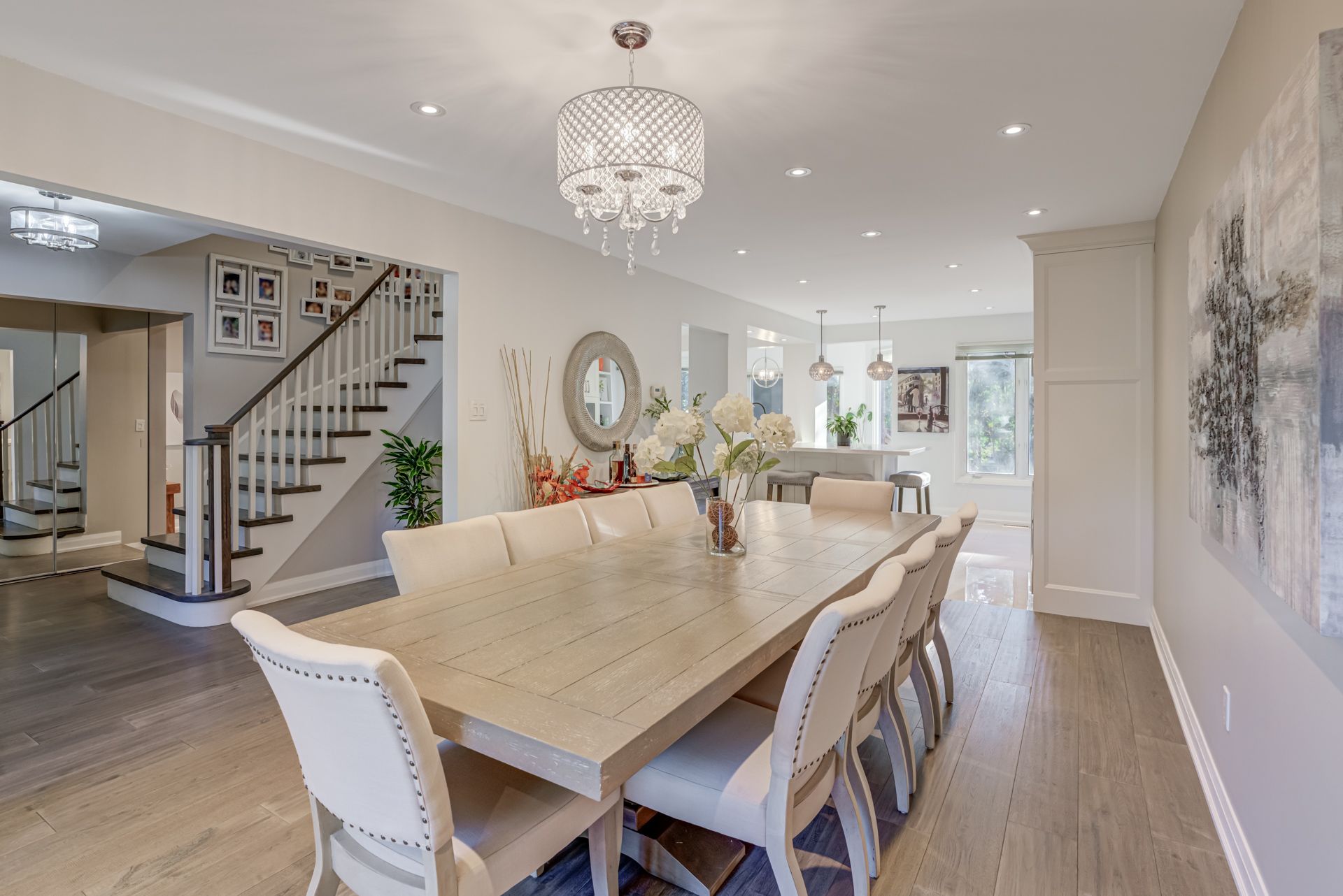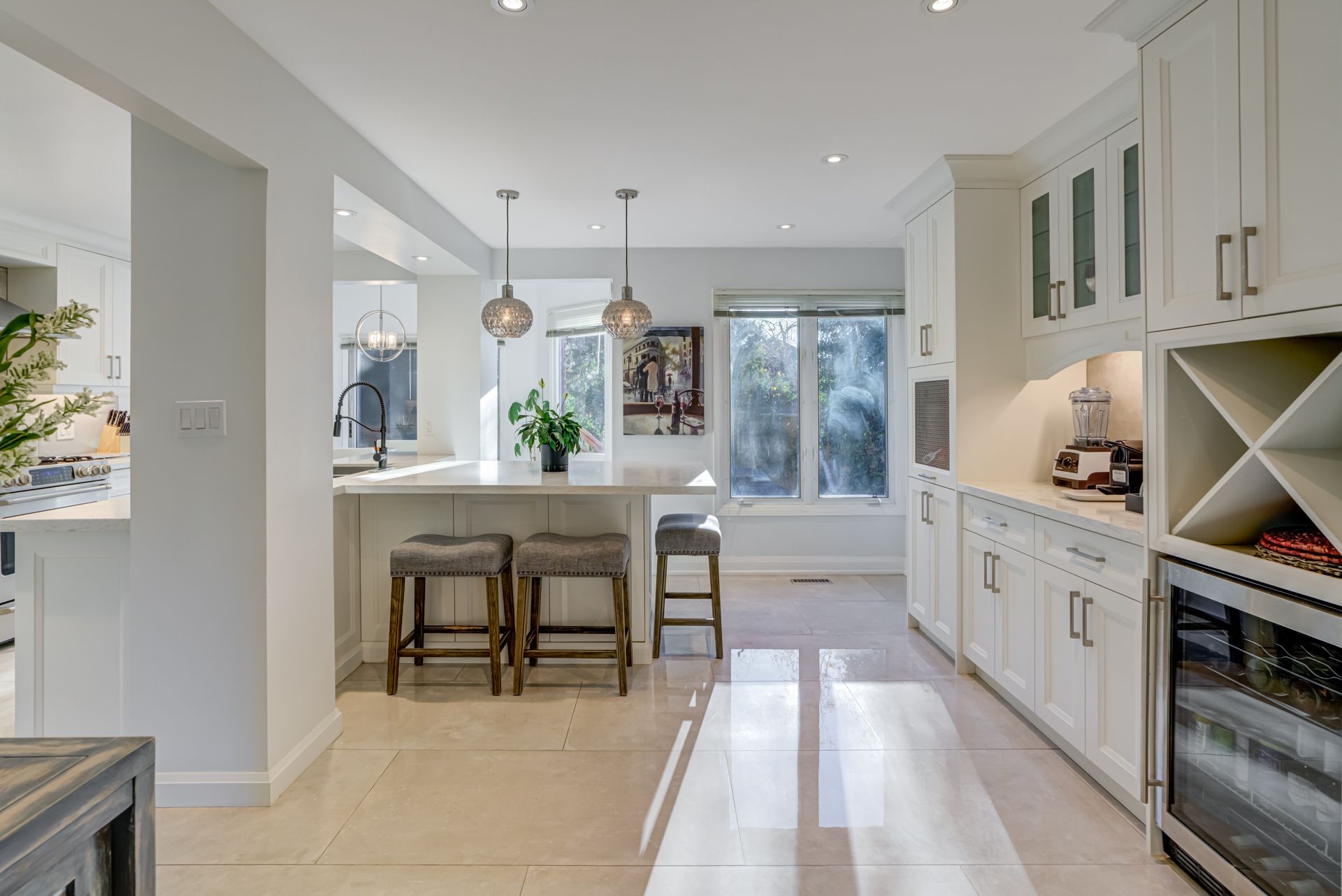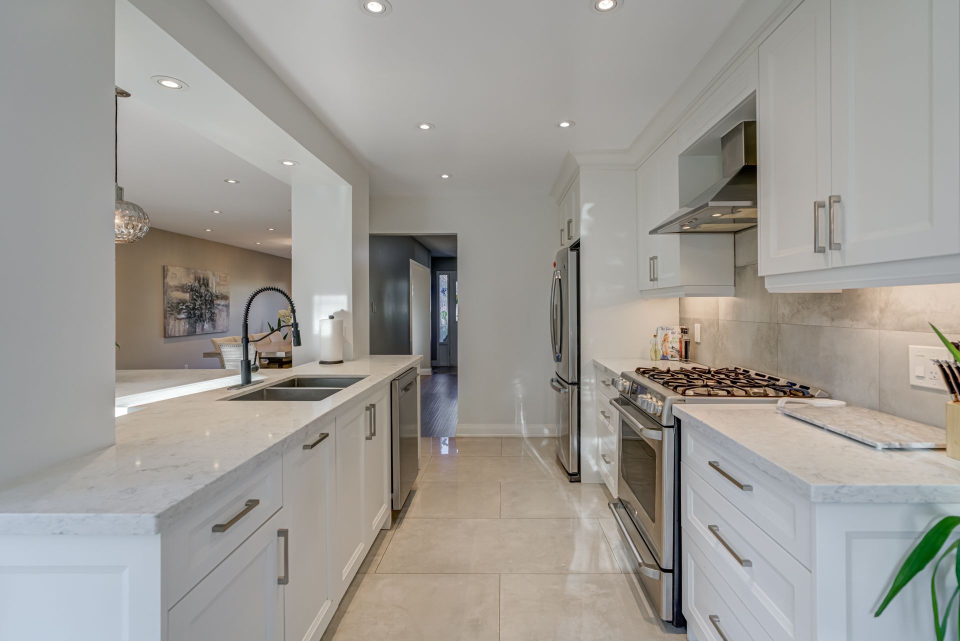 • Modern kitchen with stainless steel appliances and eat-in island for gatherings.