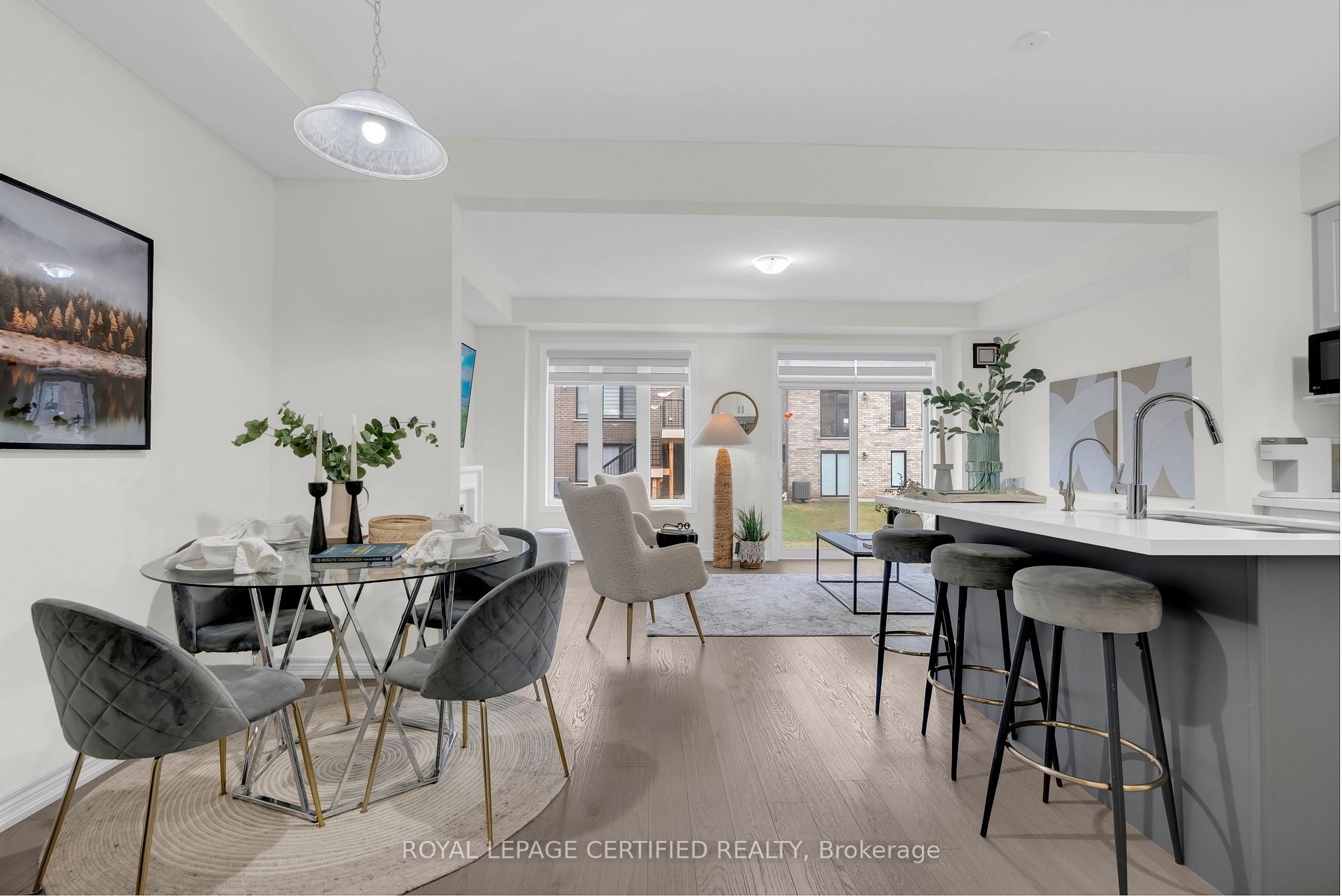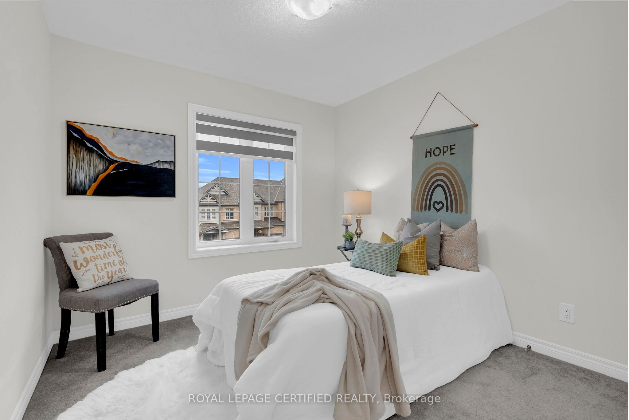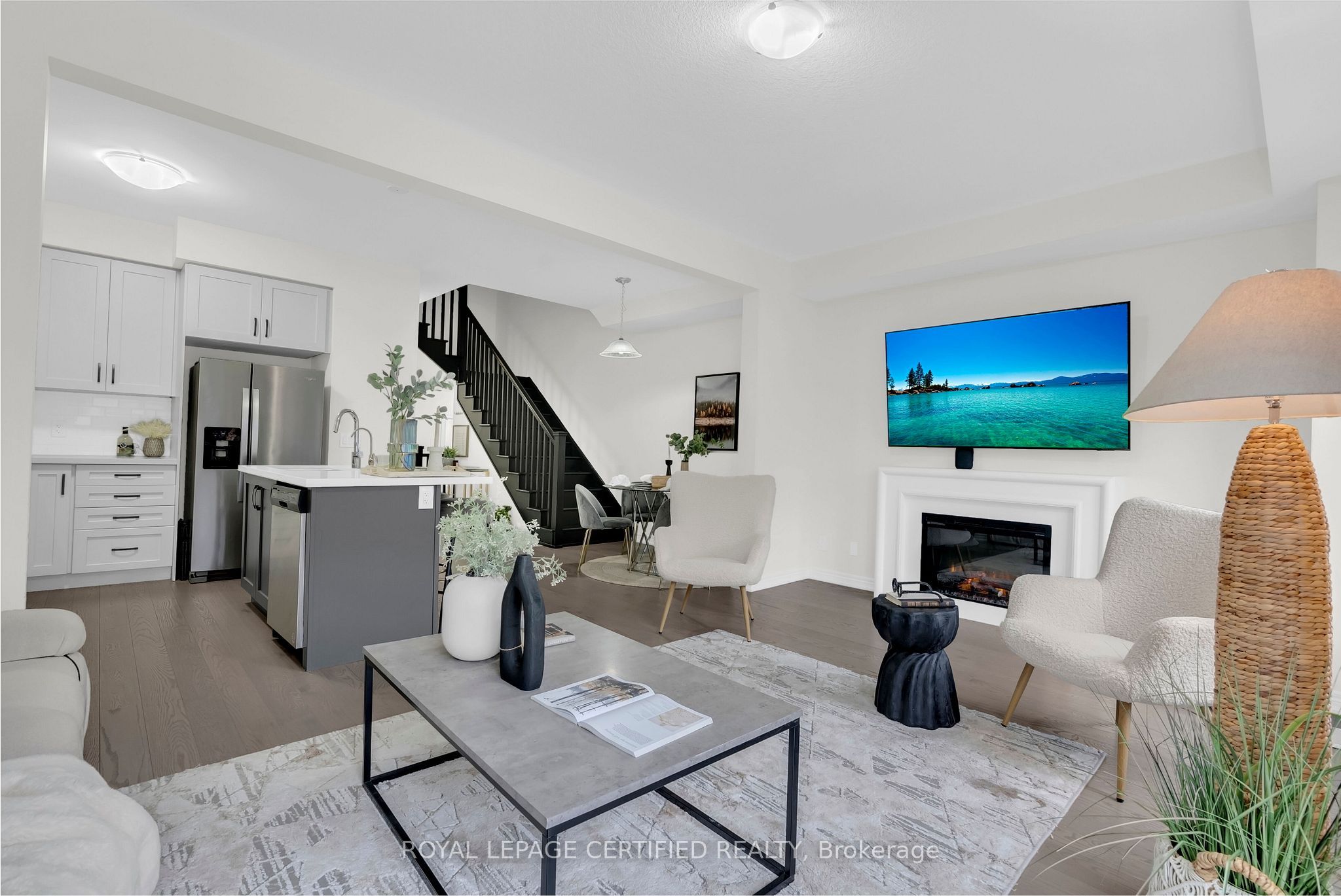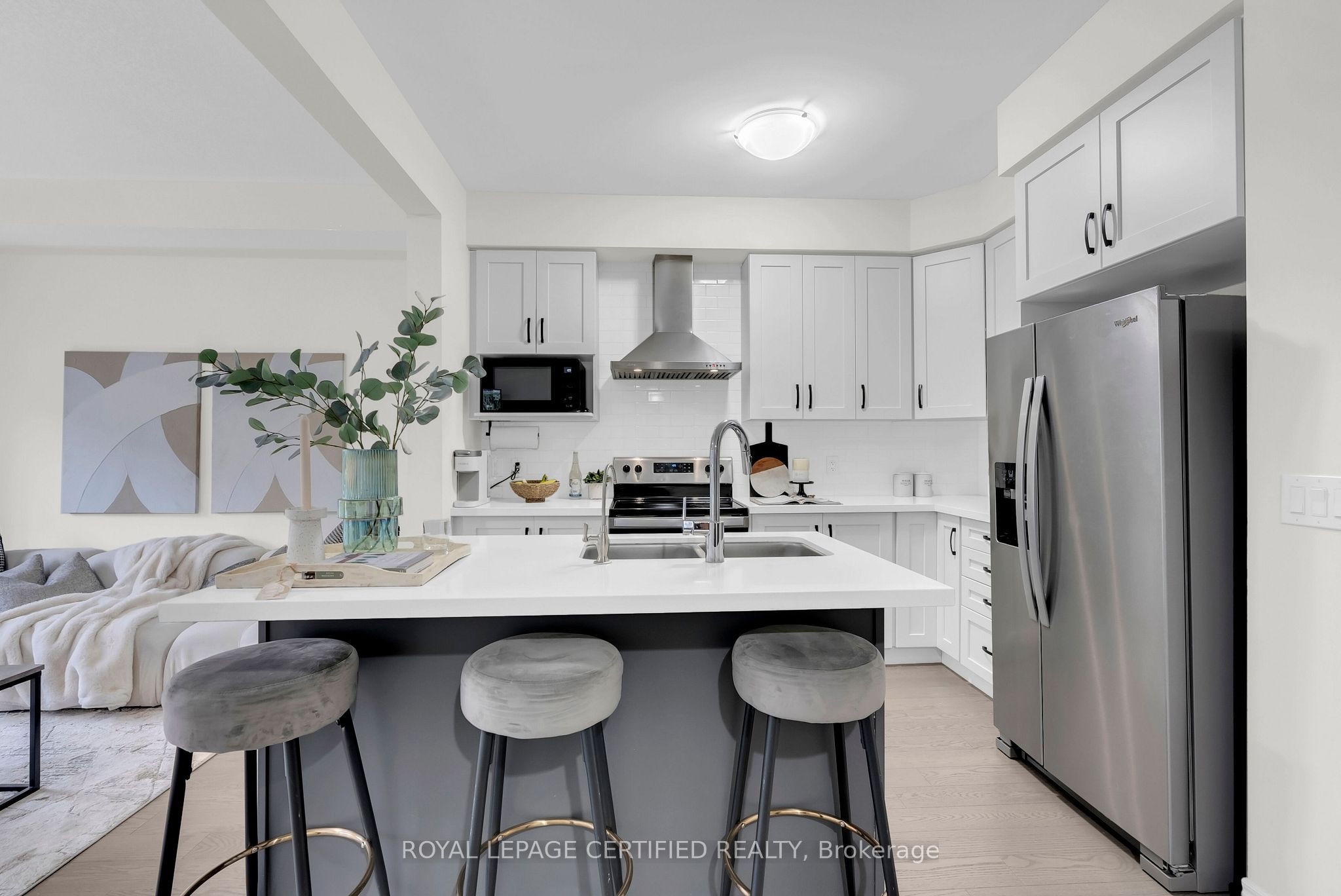 This beautifully maintained freehold townhouse, featuring luxury finishes constructed by renowned builder heathwood, is located in one of kitchener's most desirable, family-friendly neighbourhoods, just minutes from highway 401, shopping, dining, and everyday conveniences. Featuring 3 bedrooms and 3+1 bathrooms, this home offers a fully finished basement, garage, and 9-ft ceilings on the main floor, along with modern finishes throughout. The bright open-concept main level seamlessly connects the living, and kitchen areas, highlighted by large windows, upgraded lighting, and a cozy fireplace. The kitchen is equipped with white cabinetry, quartz countertops, stainless steel appliances, double sinks, and a large eat-in island, plus a convenient pantry. Additional storage is provided with coat closets at both the front entry and garage access. Hardwood stairs lead to the second level, featuring two spacious bedrooms with oversized closets, a full bathroom, and second-floor laundry. The primary suite includes a walk-in closet and a luxurious ensuite with double sinks, a soaker tub, and a glass stand-up shower. The finished basement offers versatile space ideal for a rec room, home office, or potential 4th bedroom, complete with high ceilings and a 3-piece bathroom. Additional features include an owned water softener, water purifier, and garage shelving for extra storage. Located close to top-rated schools, scenic trails, and the highly sought-after rbj schlegel park, which offers sports fields, a cricket pitch, courts, playgrounds, splashpad, and an upcoming state-of-the-art indoor recreation facility, this home delivers exceptional lifestyle and convenience in a rapidly growing community.