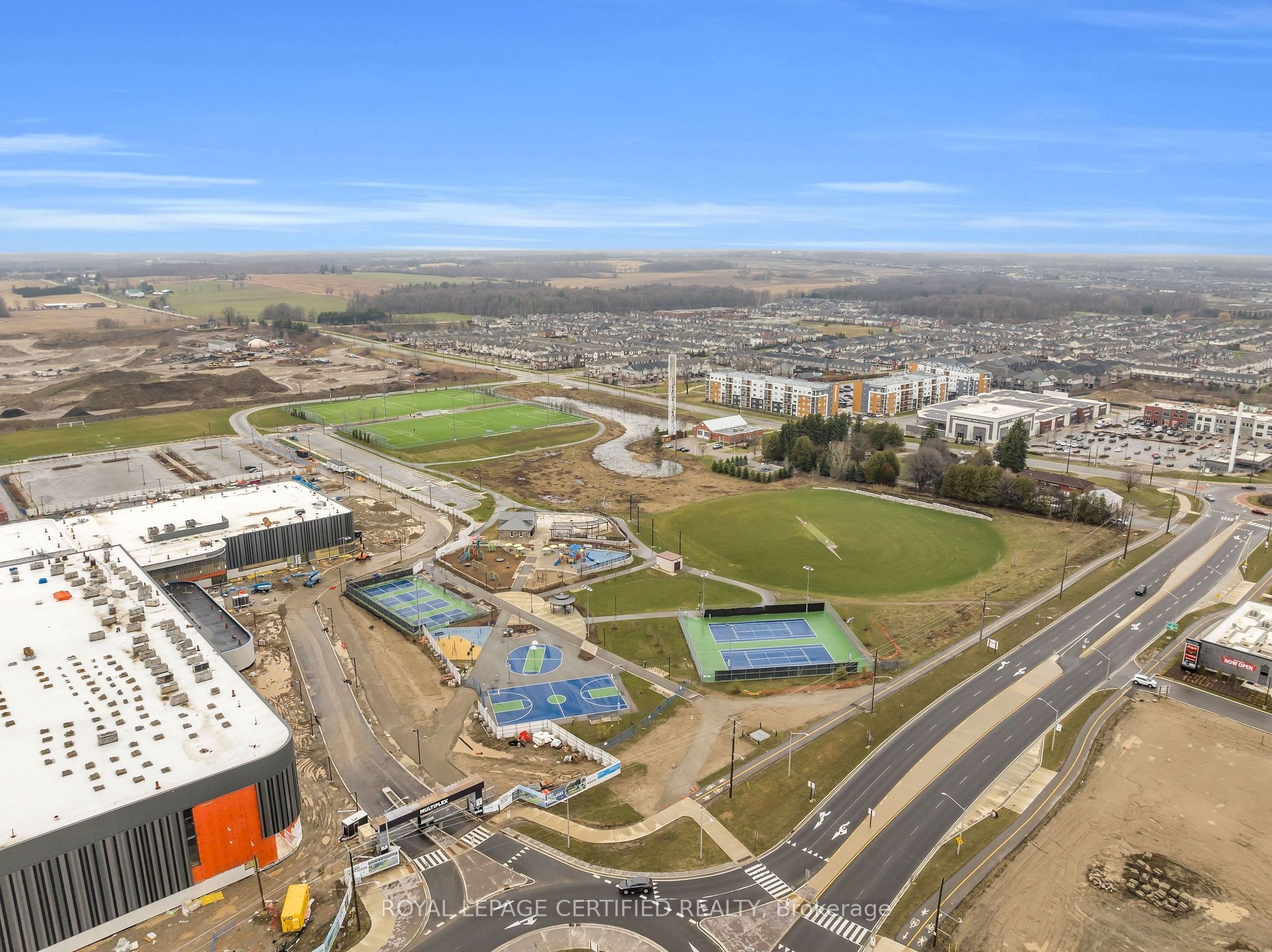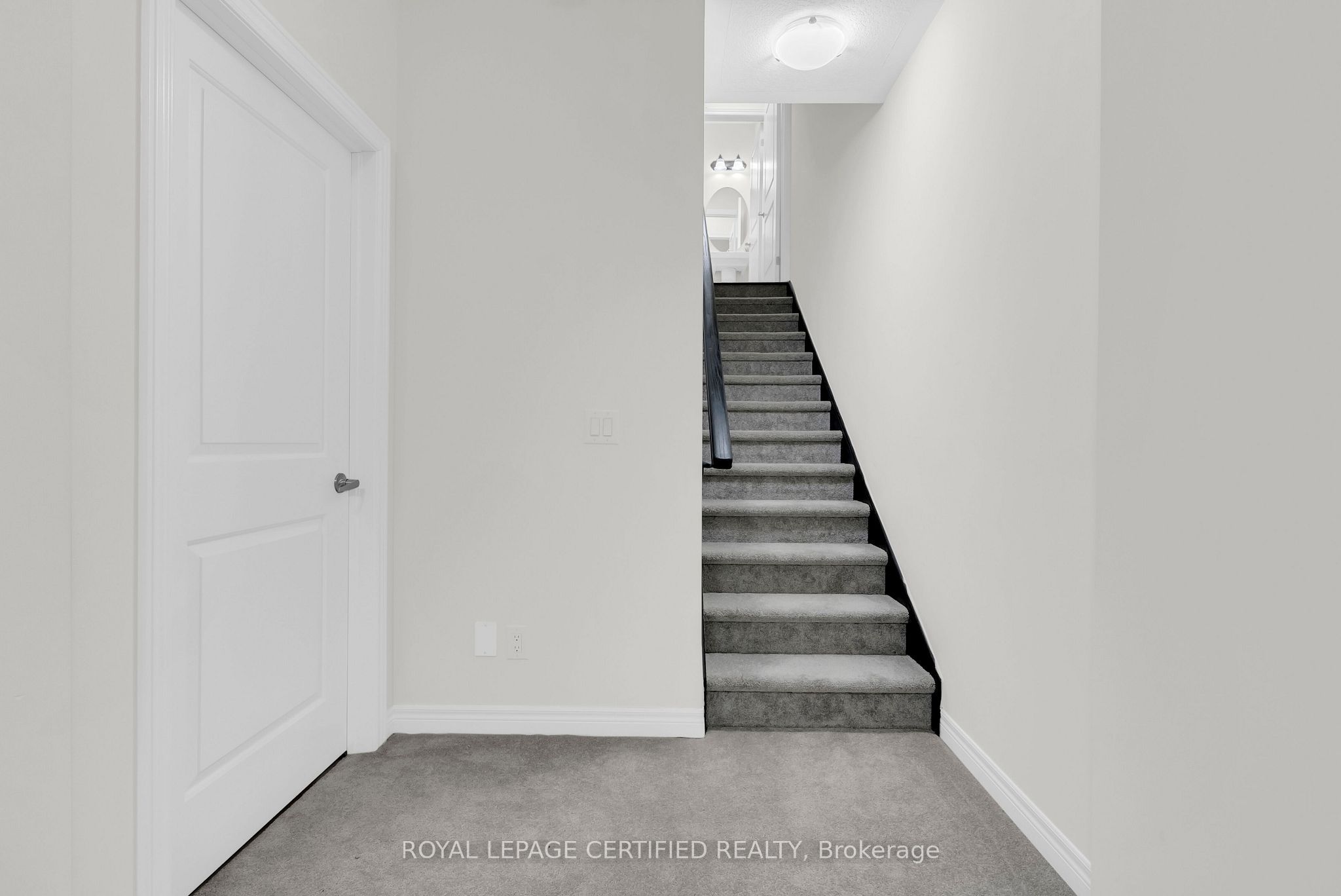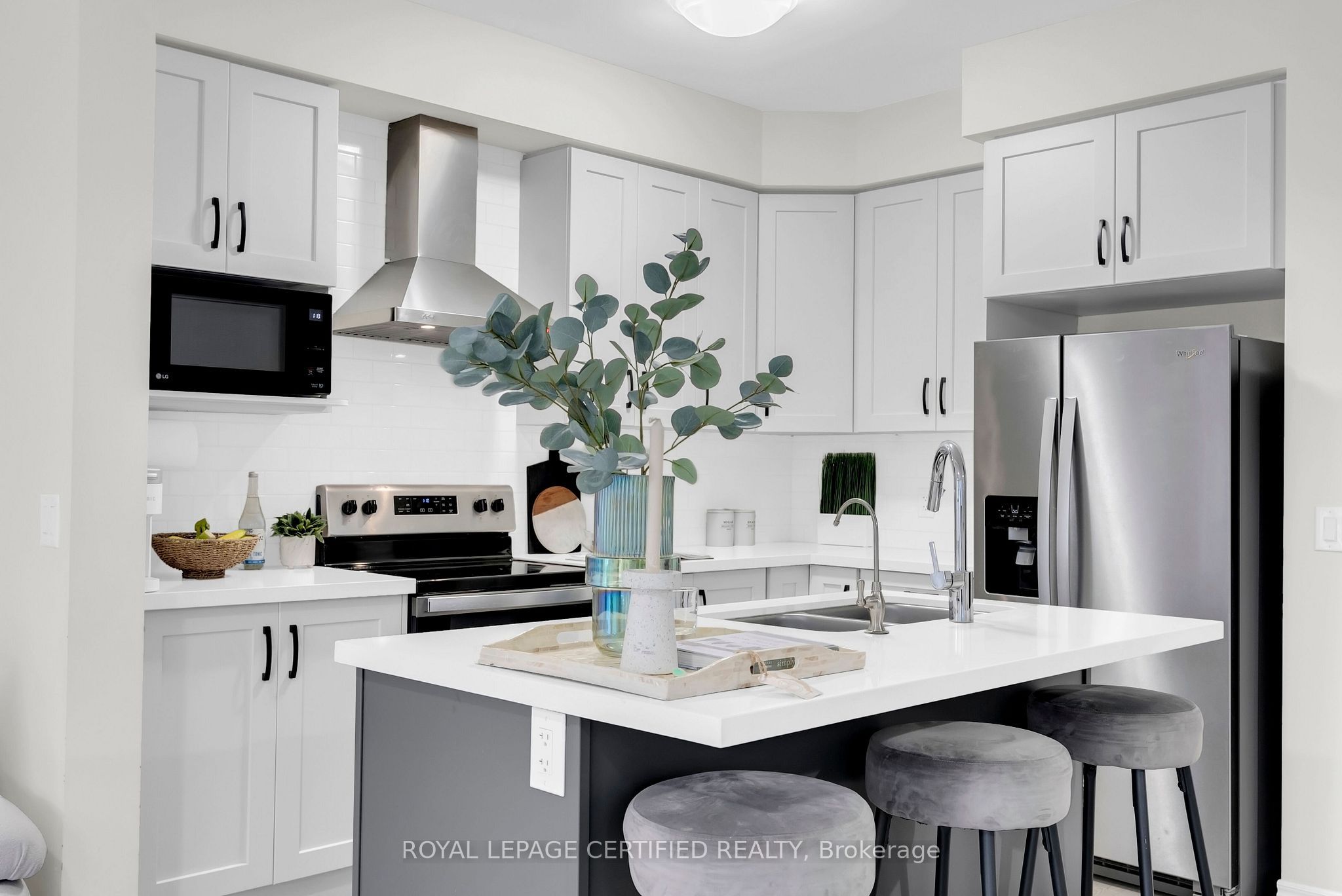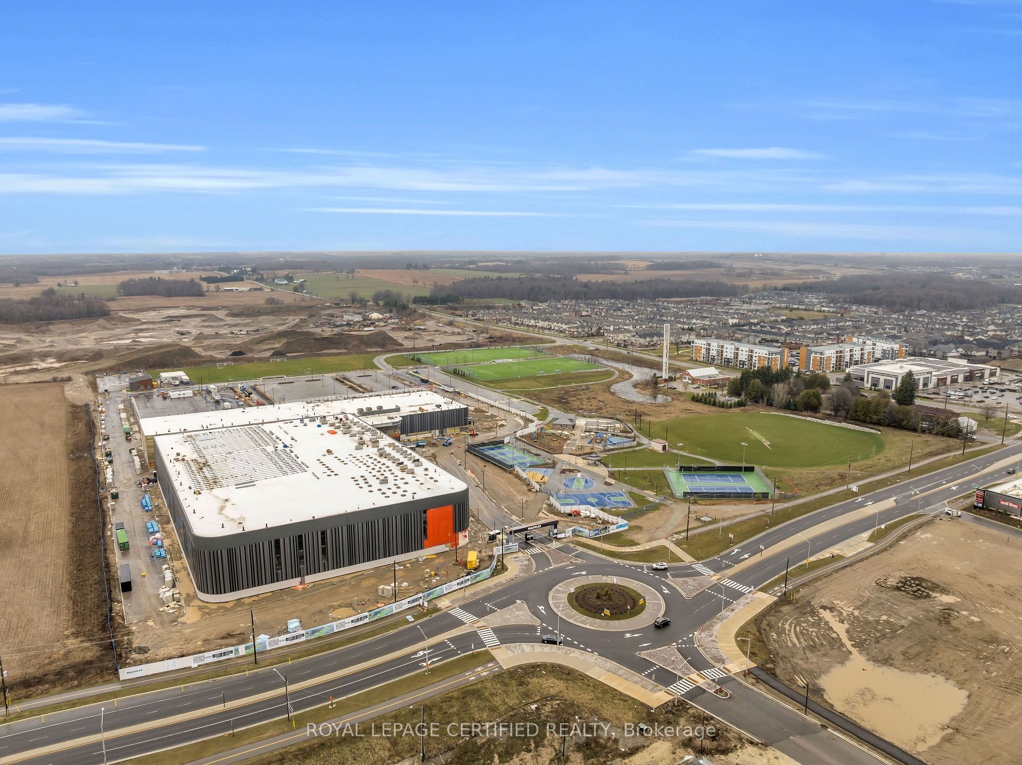 This beautifully maintained freehold townhouse, featuring luxury finishes constructed by renowned builder heathwood, is located in one of kitchener's most desirable, family-friendly neighbourhoods, just minutes from highway 401, shopping, dining, and everyday conveniences. Featuring 3 bedrooms and 3+1 bathrooms, this home offers a fully finished basement, garage, and 9-ft ceilings on the main floor, along with modern finishes throughout. The bright open-concept main level seamlessly connects the living, and kitchen areas, highlighted by large windows, upgraded lighting, and a cozy fireplace. The kitchen is equipped with white cabinetry, quartz countertops, stainless steel appliances, double sinks, and a large eat-in island, plus a convenient pantry. Additional storage is provided with coat closets at both the front entry and garage access. Hardwood stairs lead to the second level, featuring two spacious bedrooms with oversized closets, a full bathroom, and second-floor laundry. The primary suite includes a walk-in closet and a luxurious ensuite with double sinks, a soaker tub, and a glass stand-up shower. The finished basement offers versatile space ideal for a rec room, home office, or potential 4th bedroom, complete with high ceilings and a 3-piece bathroom. Additional features include an owned water softener, water purifier, and garage shelving for extra storage. Located close to top-rated schools, scenic trails, and the highly sought-after rbj schlegel park, which offers sports fields, a cricket pitch, courts, playgrounds, splashpad, and an upcoming state-of-the-art indoor recreation facility, this home delivers exceptional lifestyle and convenience in a rapidly growing community.