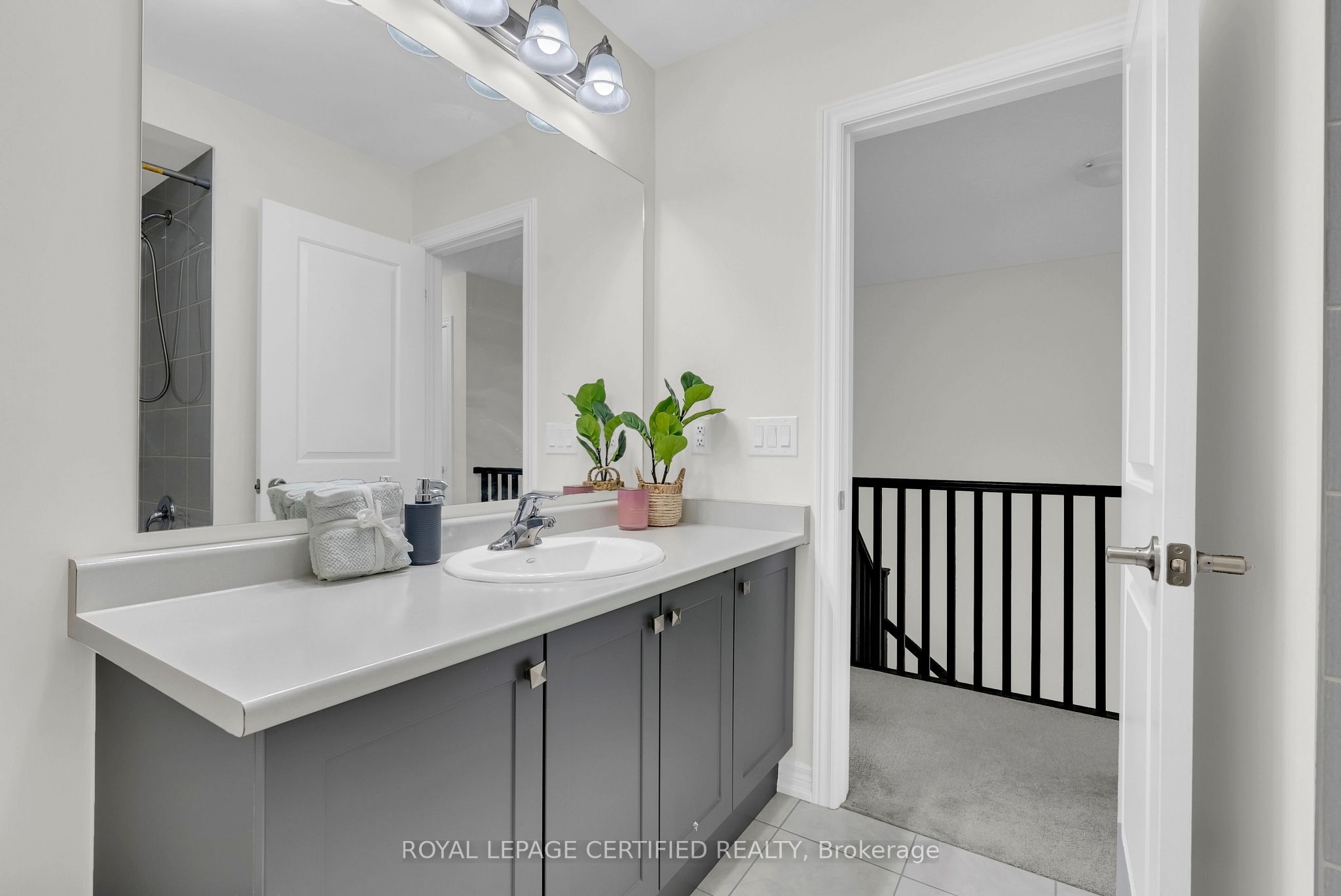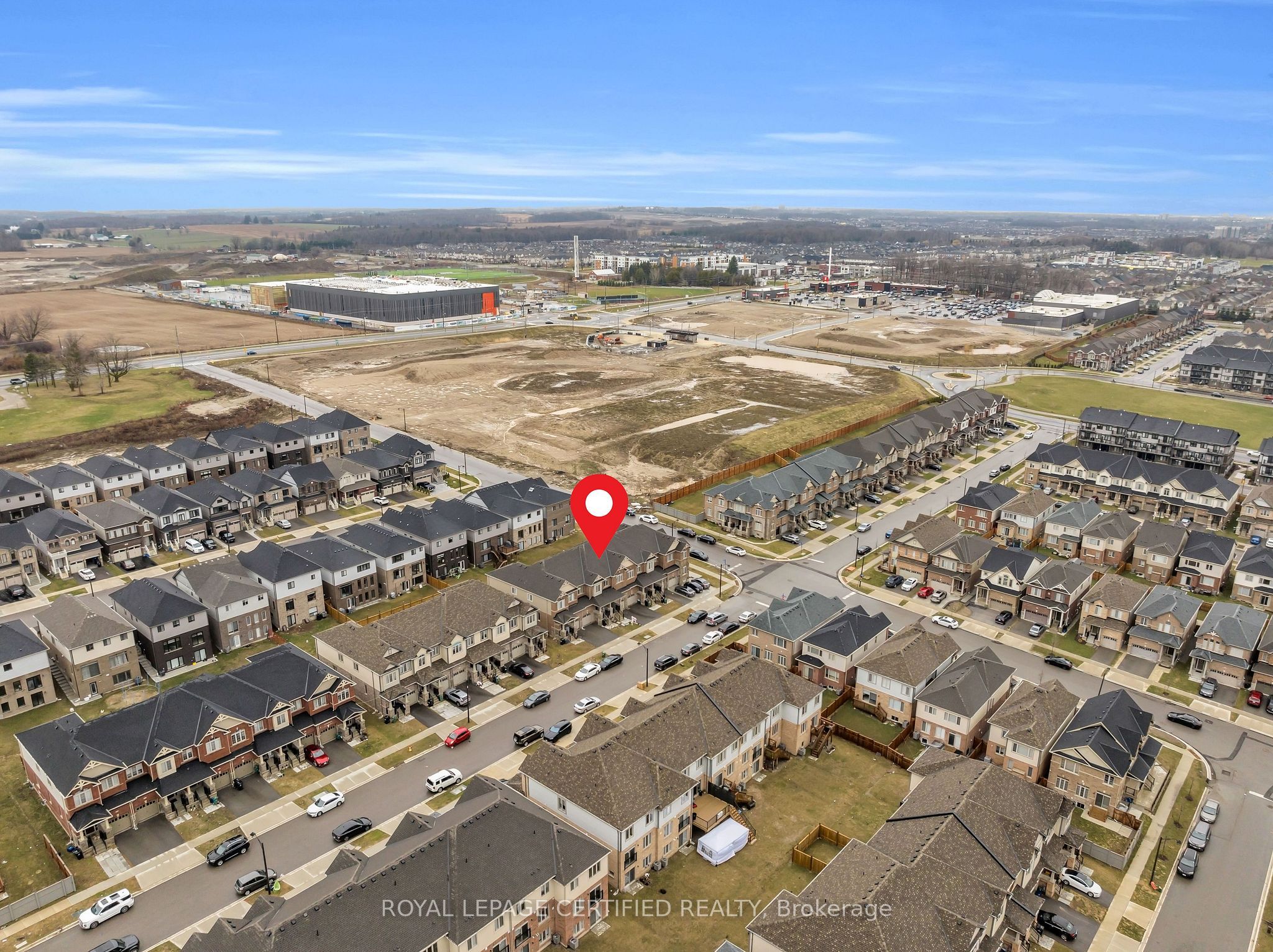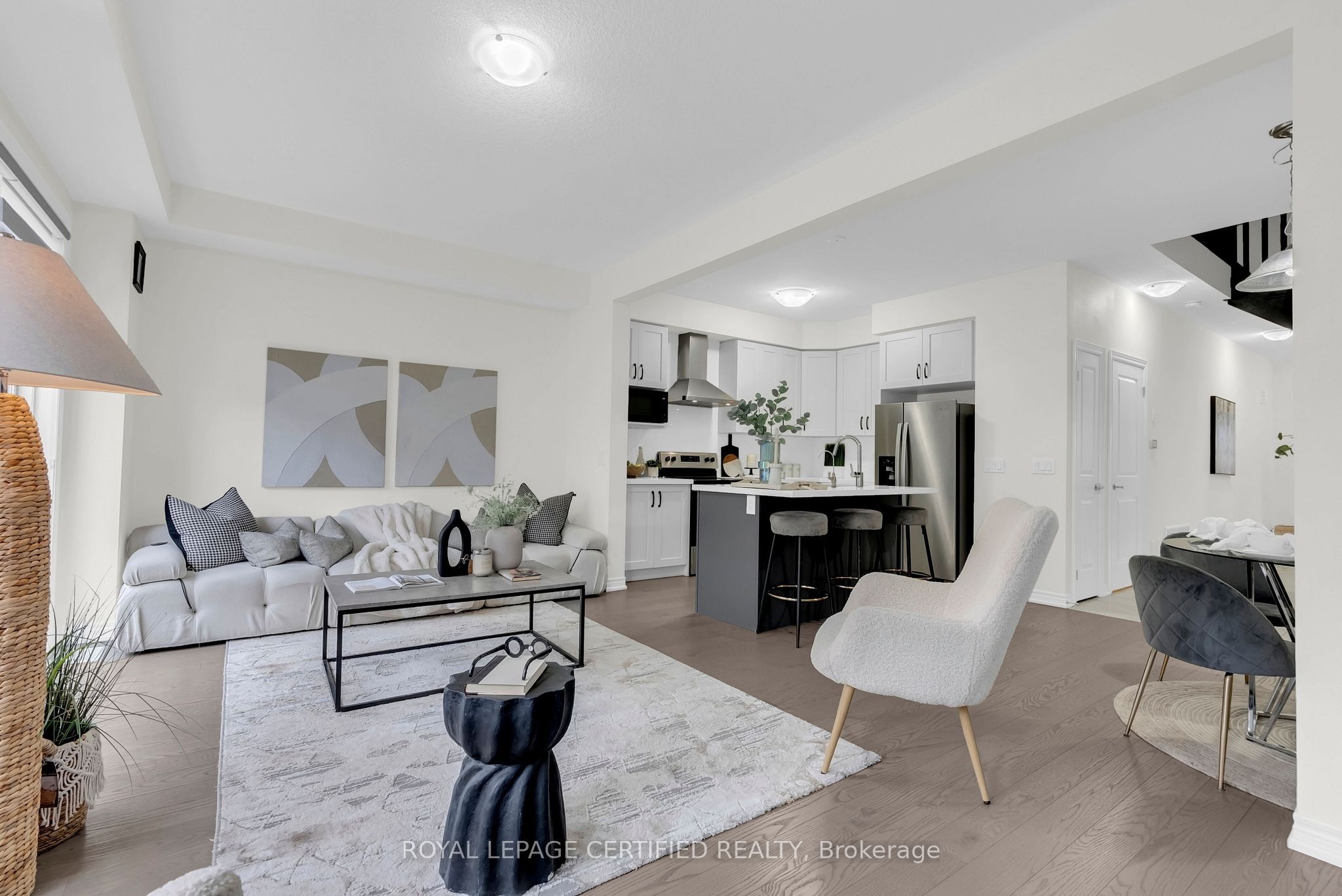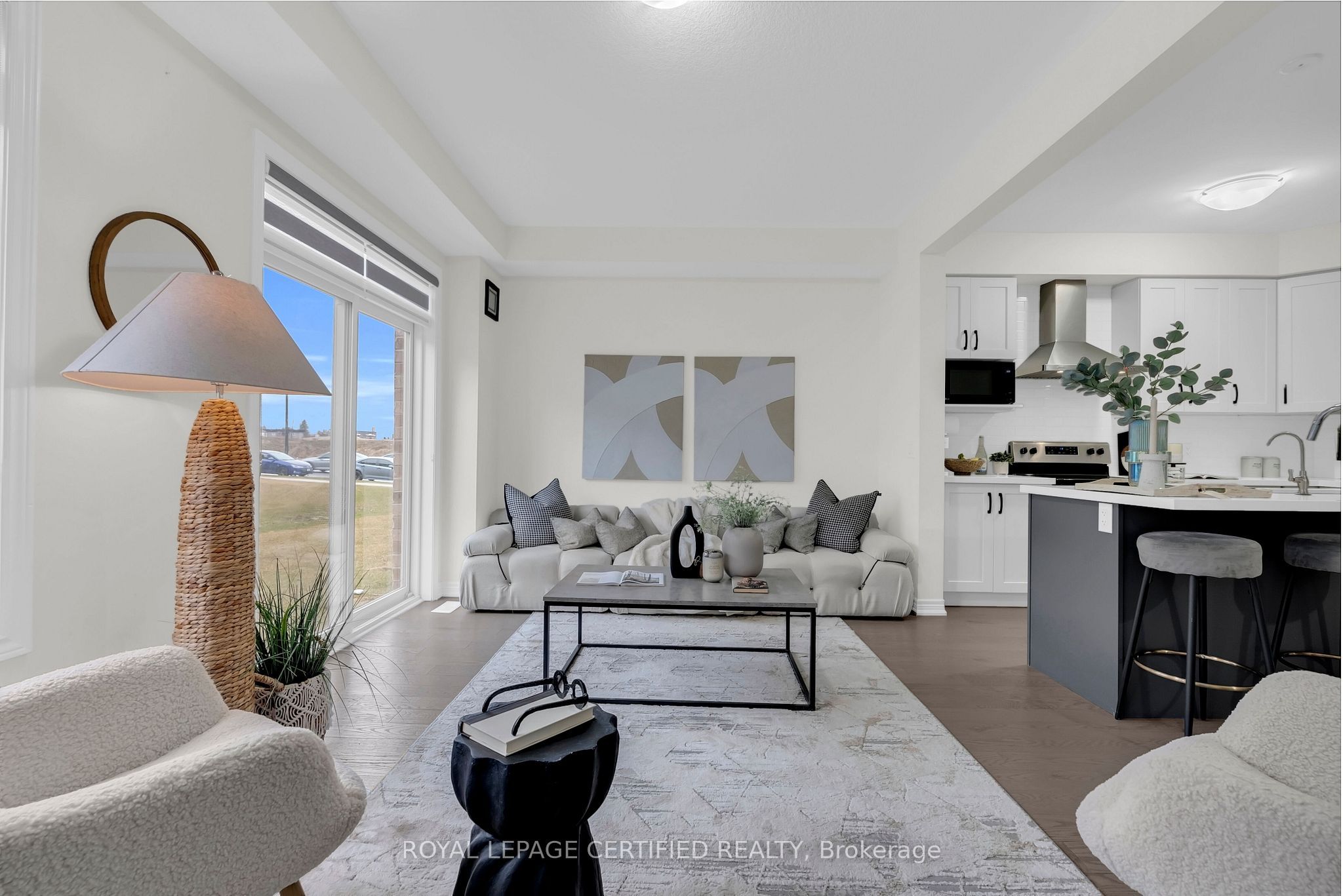 This beautifully maintained freehold townhouse, featuring luxury finishes constructed by renowned builder heathwood, is located in one of kitchener's most desirable, family-friendly neighbourhoods, just minutes from highway 401, shopping, dining, and everyday conveniences. Featuring 3 bedrooms and 3+1 bathrooms, this home offers a fully finished basement, garage, and 9-ft ceilings on the main floor, along with modern finishes throughout. The bright open-concept main level seamlessly connects the living, and kitchen areas, highlighted by large windows, upgraded lighting, and a cozy fireplace. The kitchen is equipped with white cabinetry, quartz countertops, stainless steel appliances, double sinks, and a large eat-in island, plus a convenient pantry. Additional storage is provided with coat closets at both the front entry and garage access. Hardwood stairs lead to the second level, featuring two spacious bedrooms with oversized closets, a full bathroom, and second-floor laundry. The primary suite includes a walk-in closet and a luxurious ensuite with double sinks, a soaker tub, and a glass stand-up shower. The finished basement offers versatile space ideal for a rec room, home office, or potential 4th bedroom, complete with high ceilings and a 3-piece bathroom. Additional features include an owned water softener, water purifier, and garage shelving for extra storage. Located close to top-rated schools, scenic trails, and the highly sought-after rbj schlegel park, which offers sports fields, a cricket pitch, courts, playgrounds, splashpad, and an upcoming state-of-the-art indoor recreation facility, this home delivers exceptional lifestyle and convenience in a rapidly growing community.
