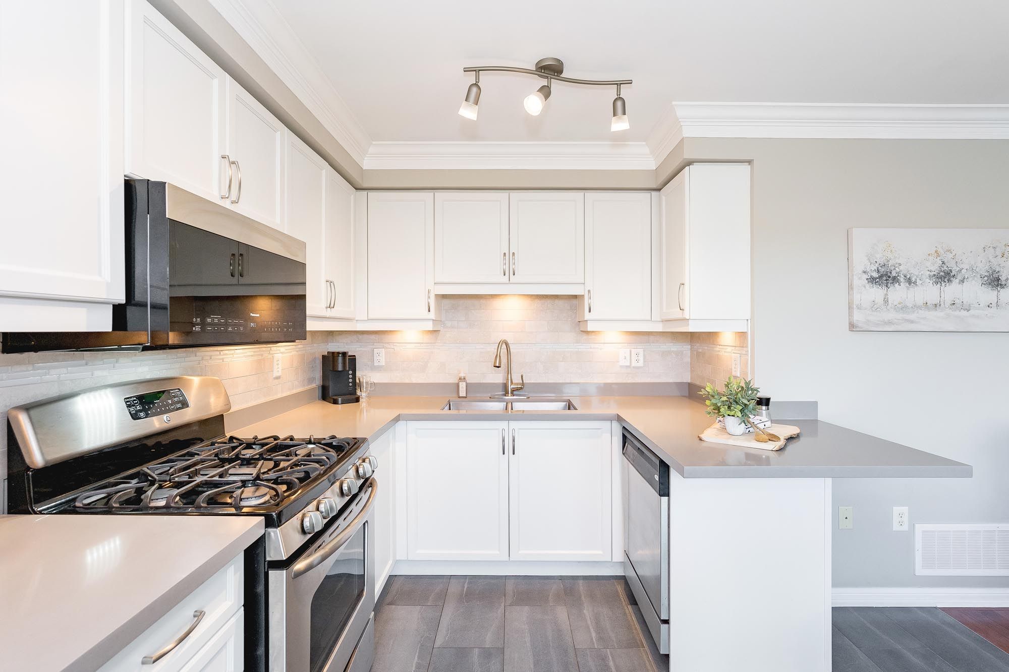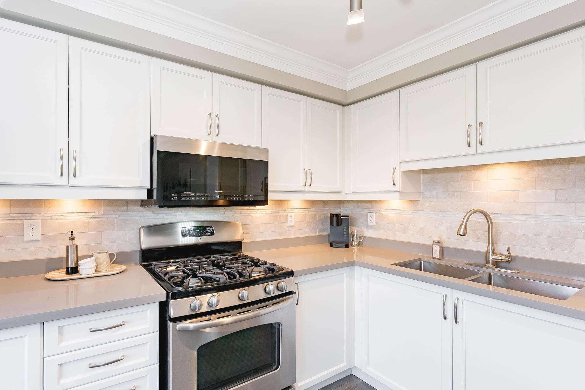 • Impressive kitchen with maple cabinetry, quartz countertops, and gas stove.