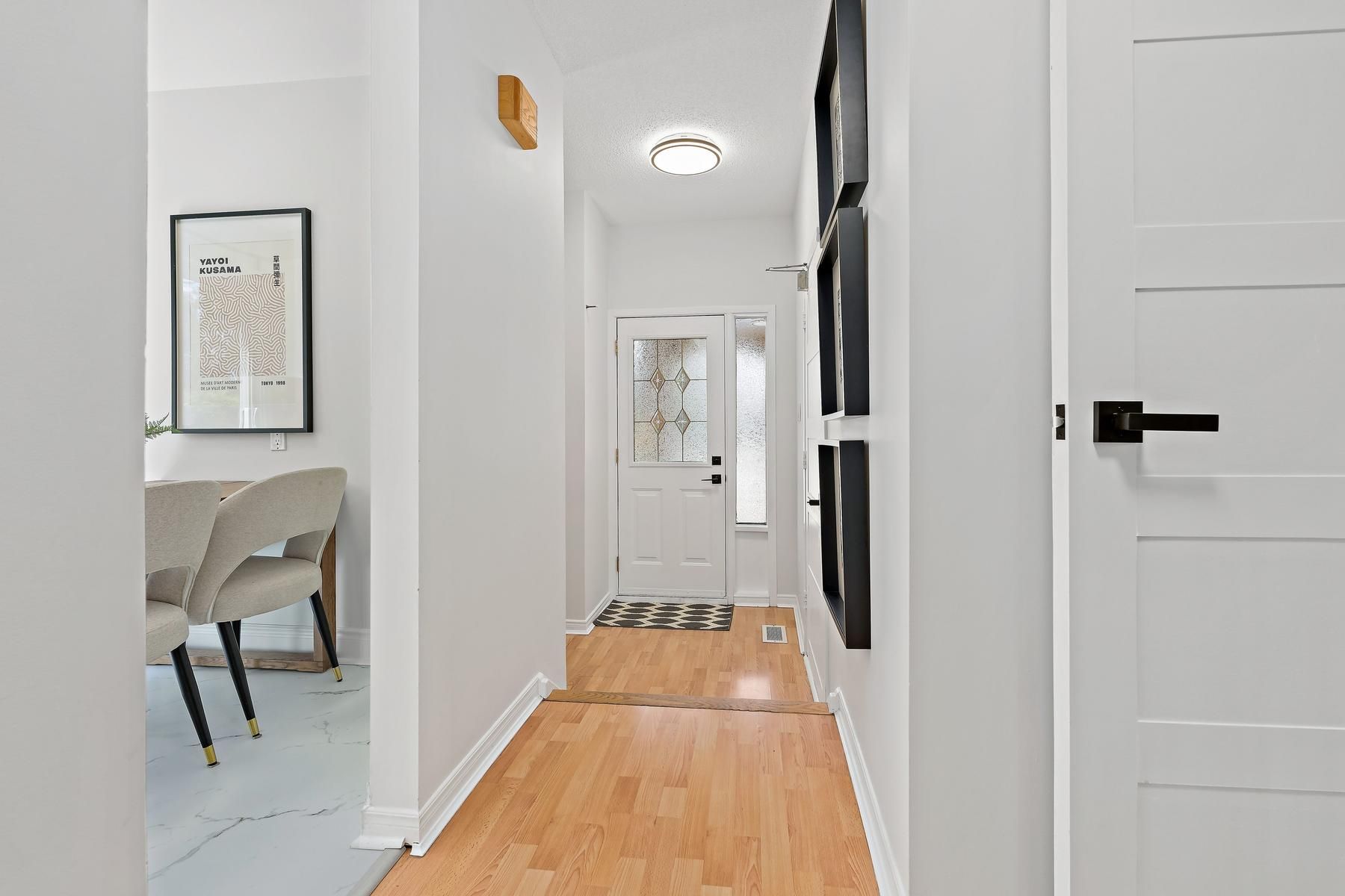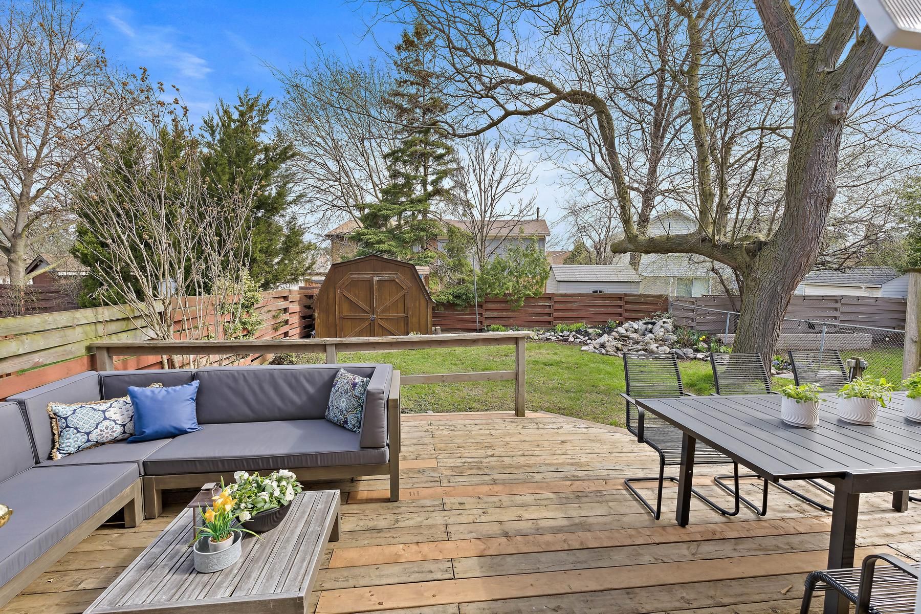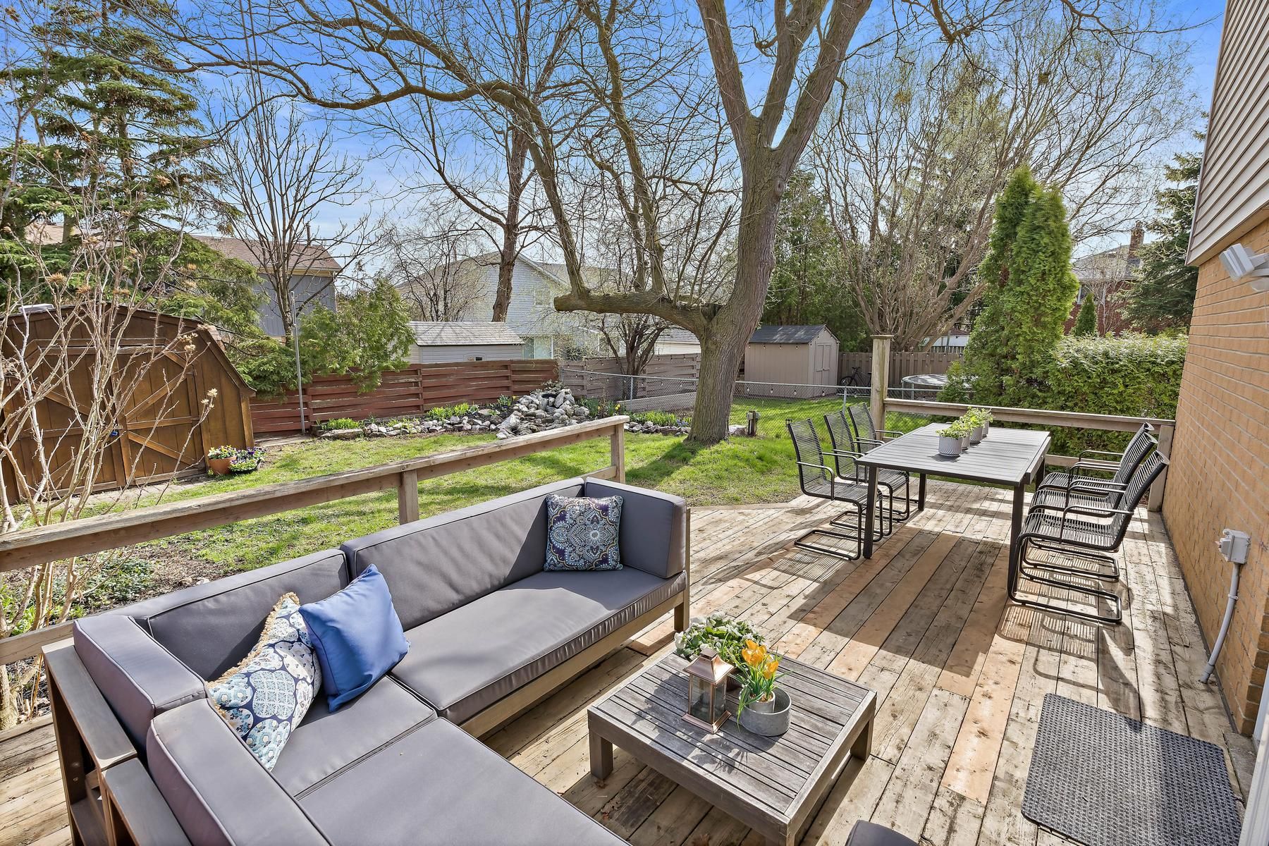 • Open concept living and dining area leading to a private backyard.
