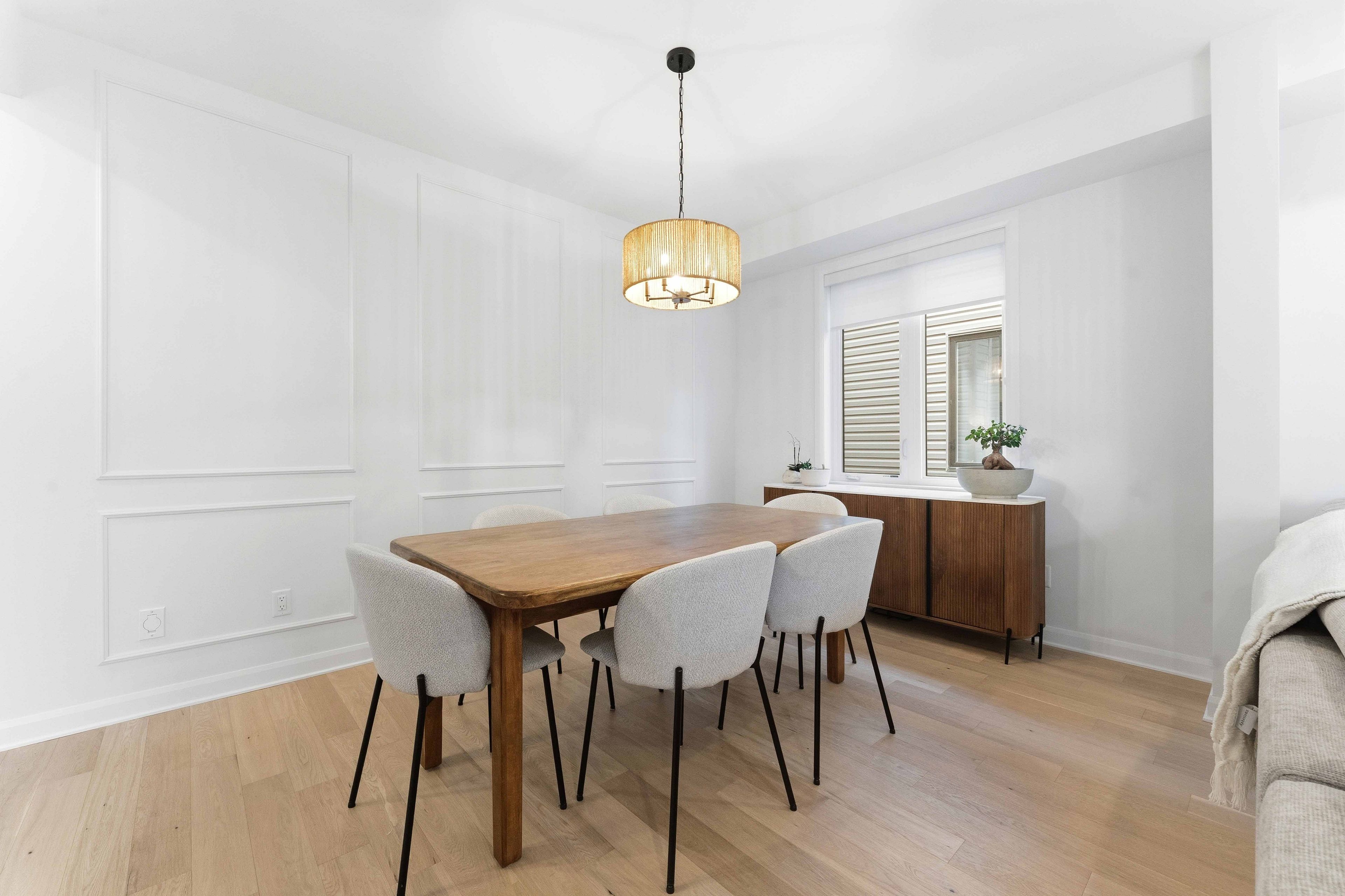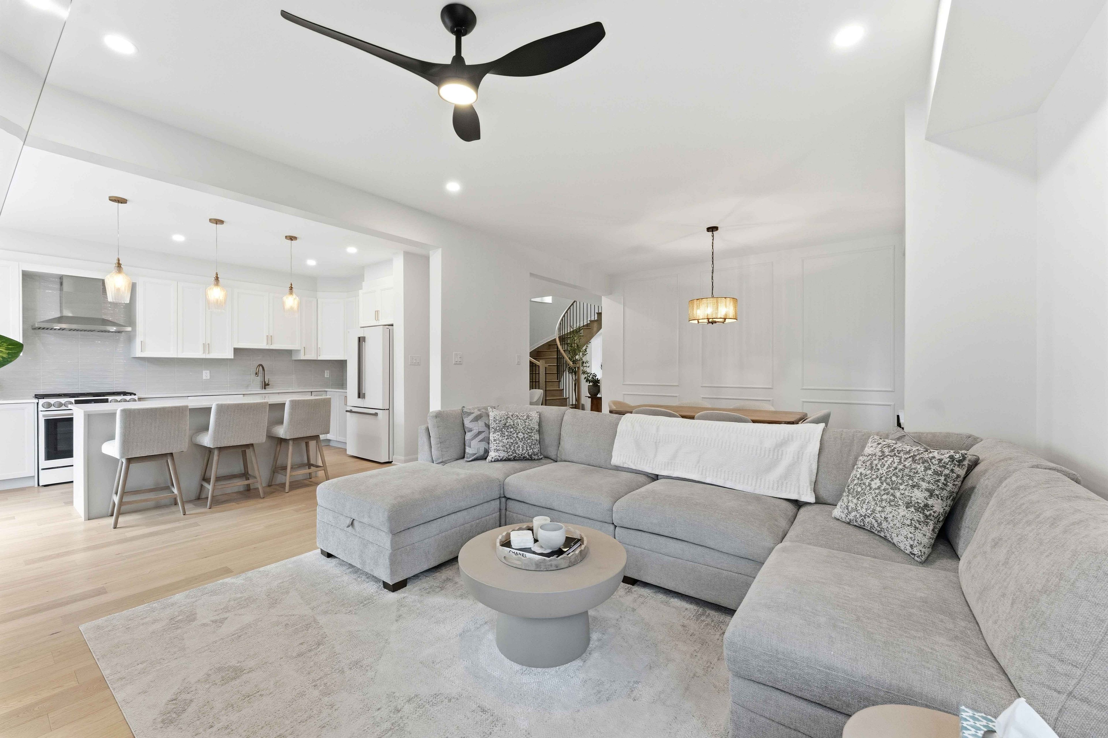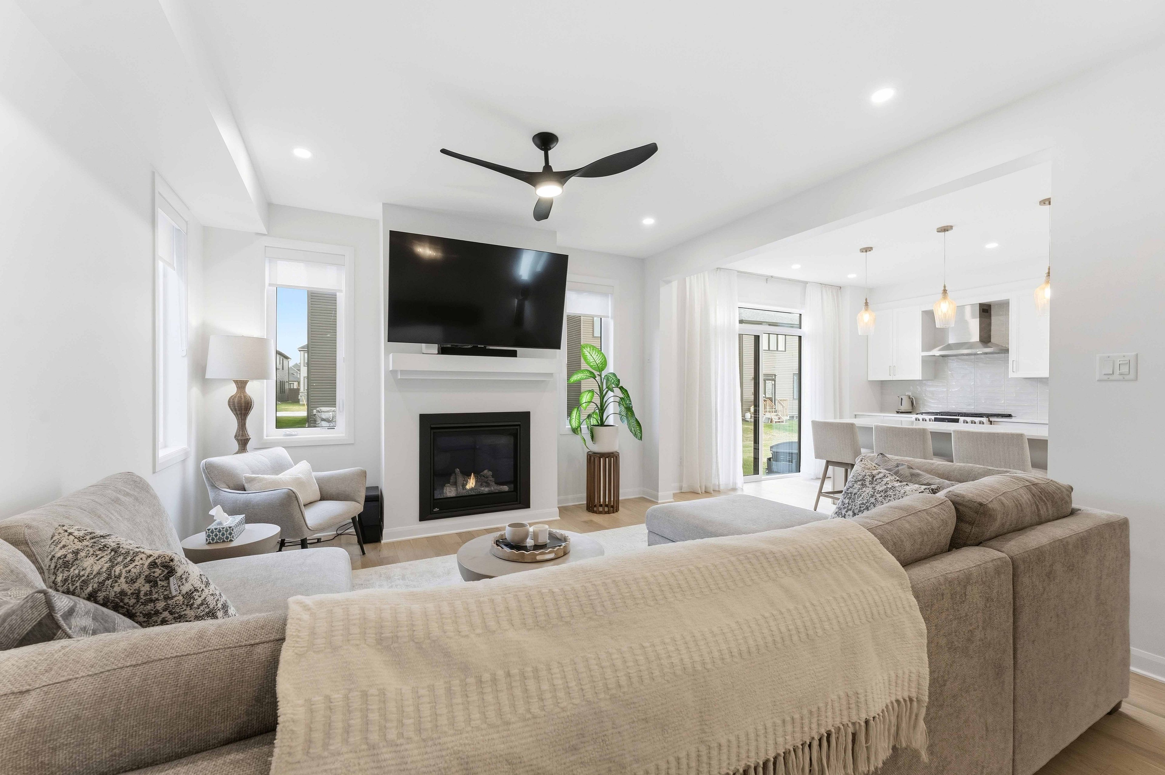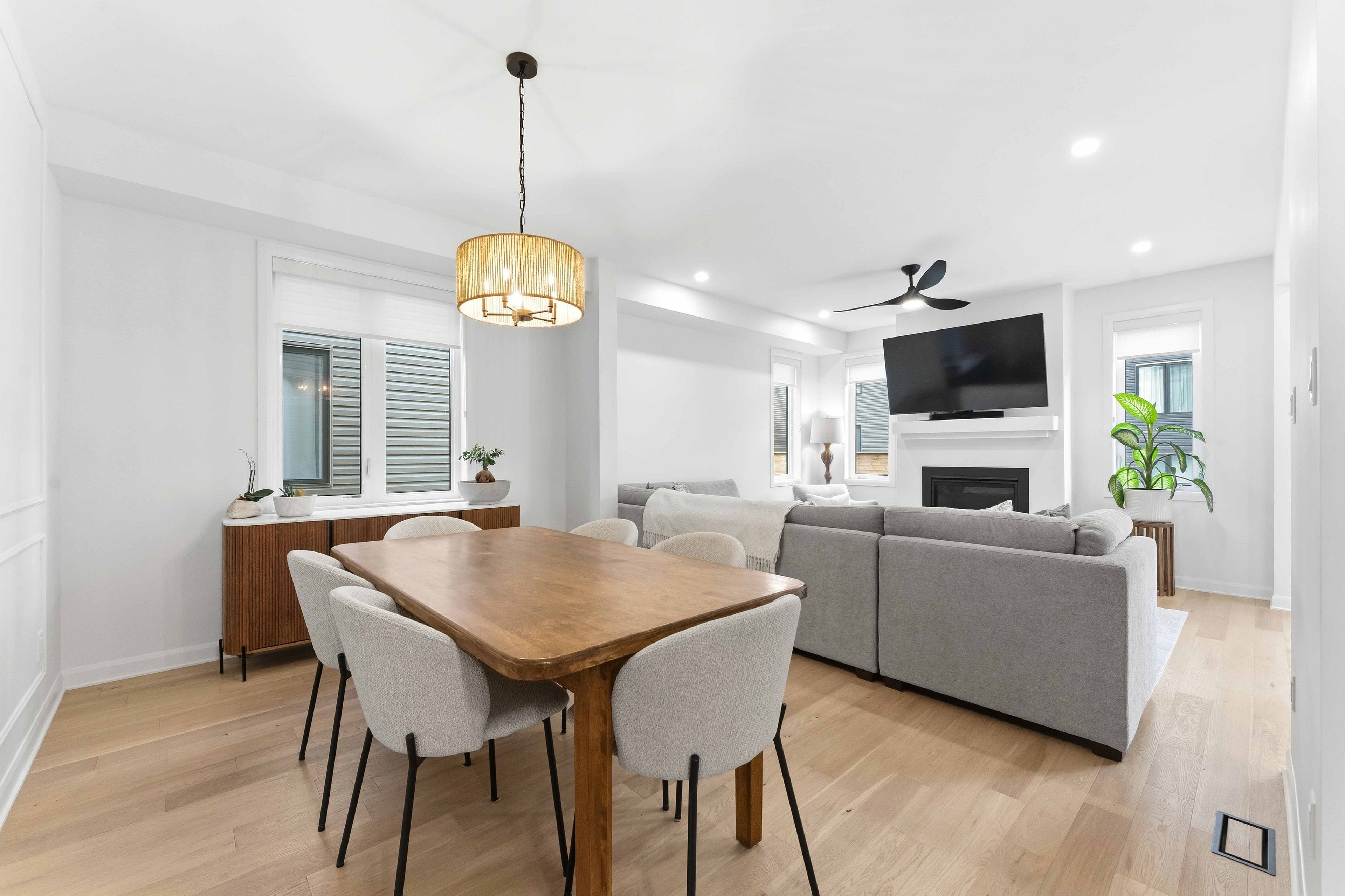 • Modern open concept living/dining area with a stylish gas fireplace.
