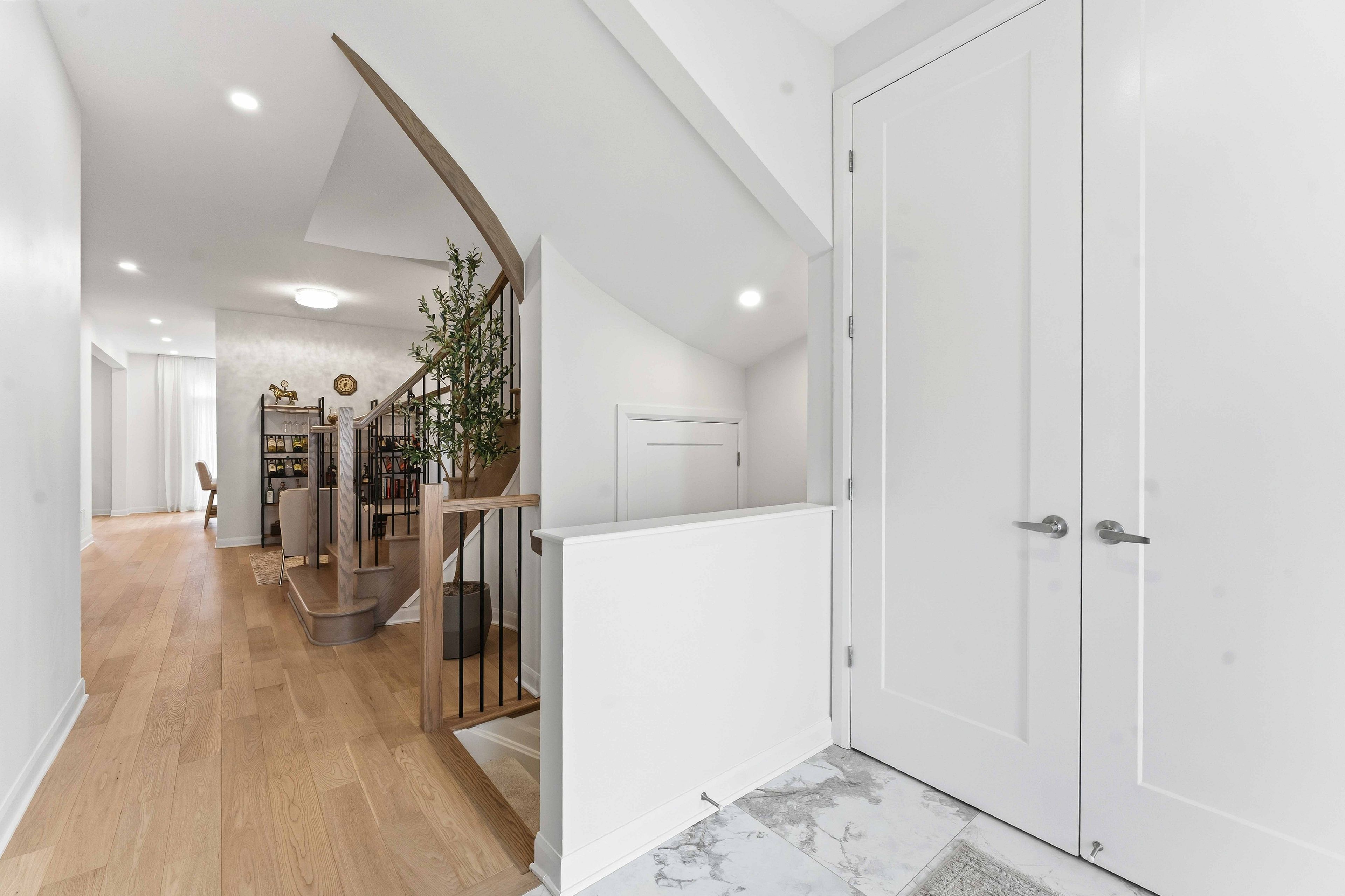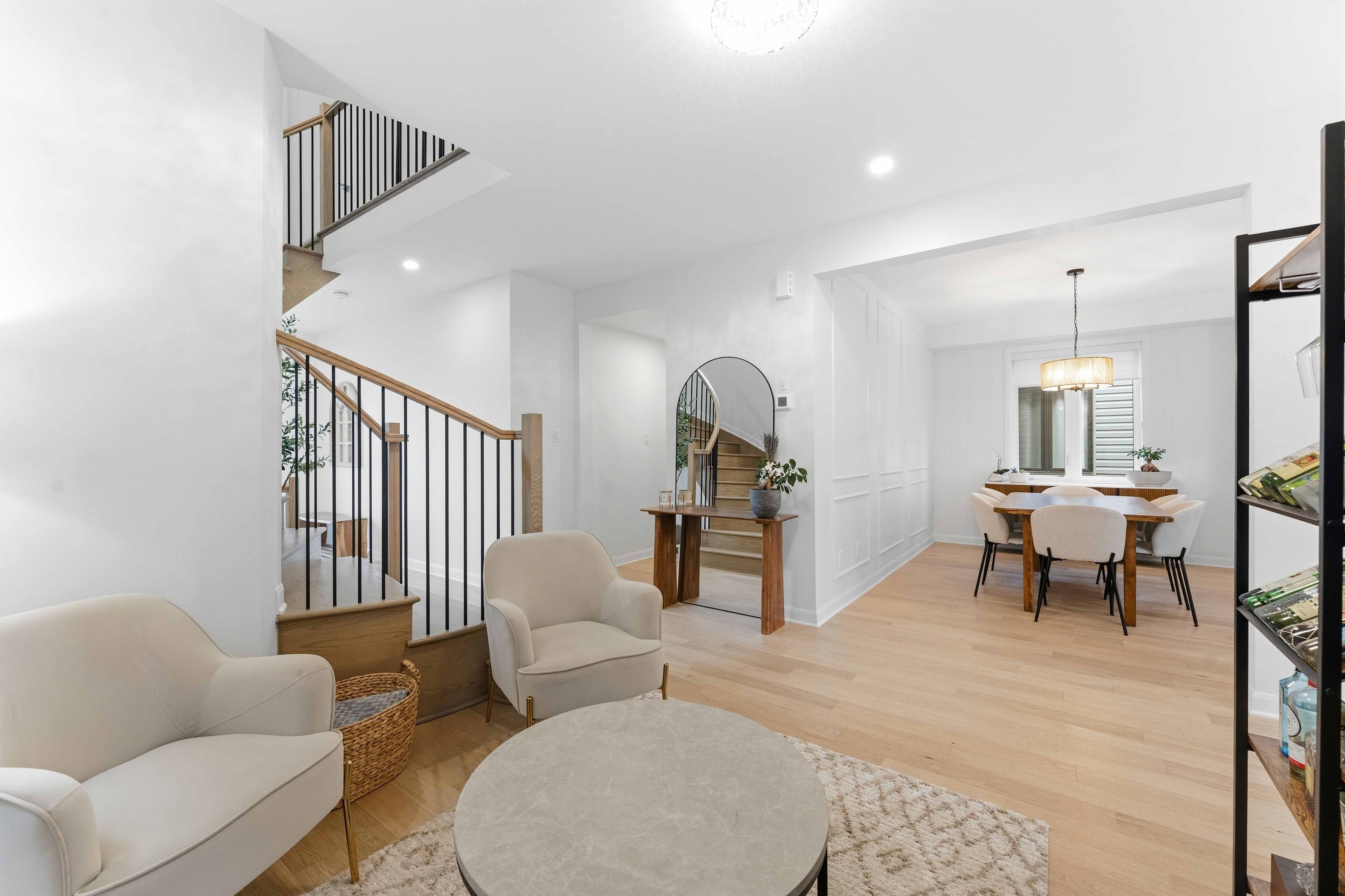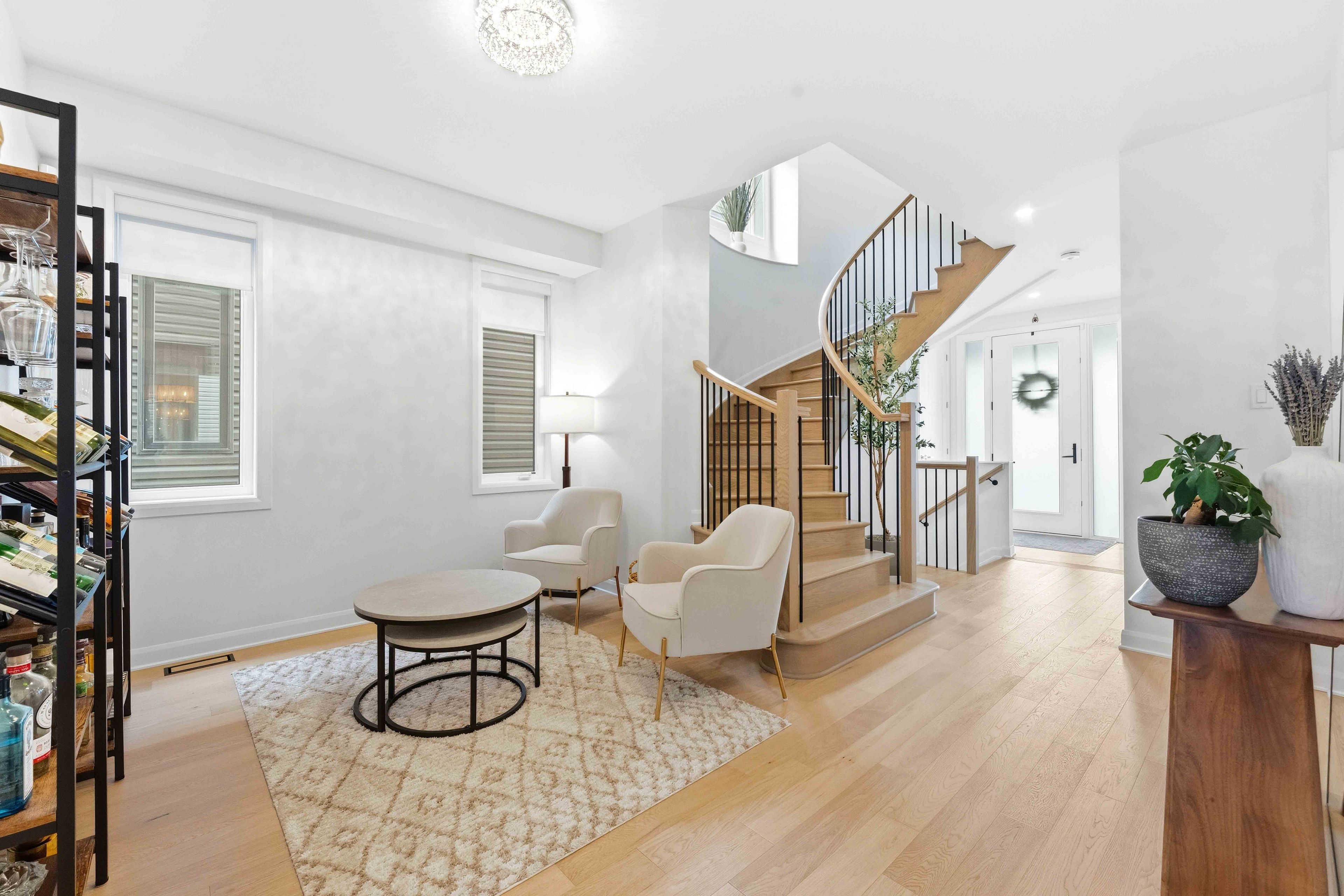 This exceptional 4-bedroom home showcases modern luxury and timeless finishing choices in one of ottawa's most desirable communities;mahogany in manotick. Step inside to discover an elegant layout highlighted by 9-foot ceilings, hardwood flooring, a bright entrance foyer, a mainlevel den, and an open concept living/dining area with a sleek gas fireplace creating a warm and sophisticated atmosphere. The customdesignedkitchen is a chef's dream, featuring quartz countertops, soft-close cabinetry, and upgraded lighting that beautifully complements thespace. A semi-circular oak staircase leads to the upper level, where you'll find a spacious primary retreat complete with a walk-in closet and aspa-inspired ensuite offering double sinks and a stand-alone soaker tub-perfect for relaxation, three additional bedrooms, a full bathroom andsecond floor laundry room complete the upper level. Set within the prestigious mahogany community, this home offers the perfect blend oftranquility and convenience, moments from the manotick village core, parks, trails, and the rideau river.