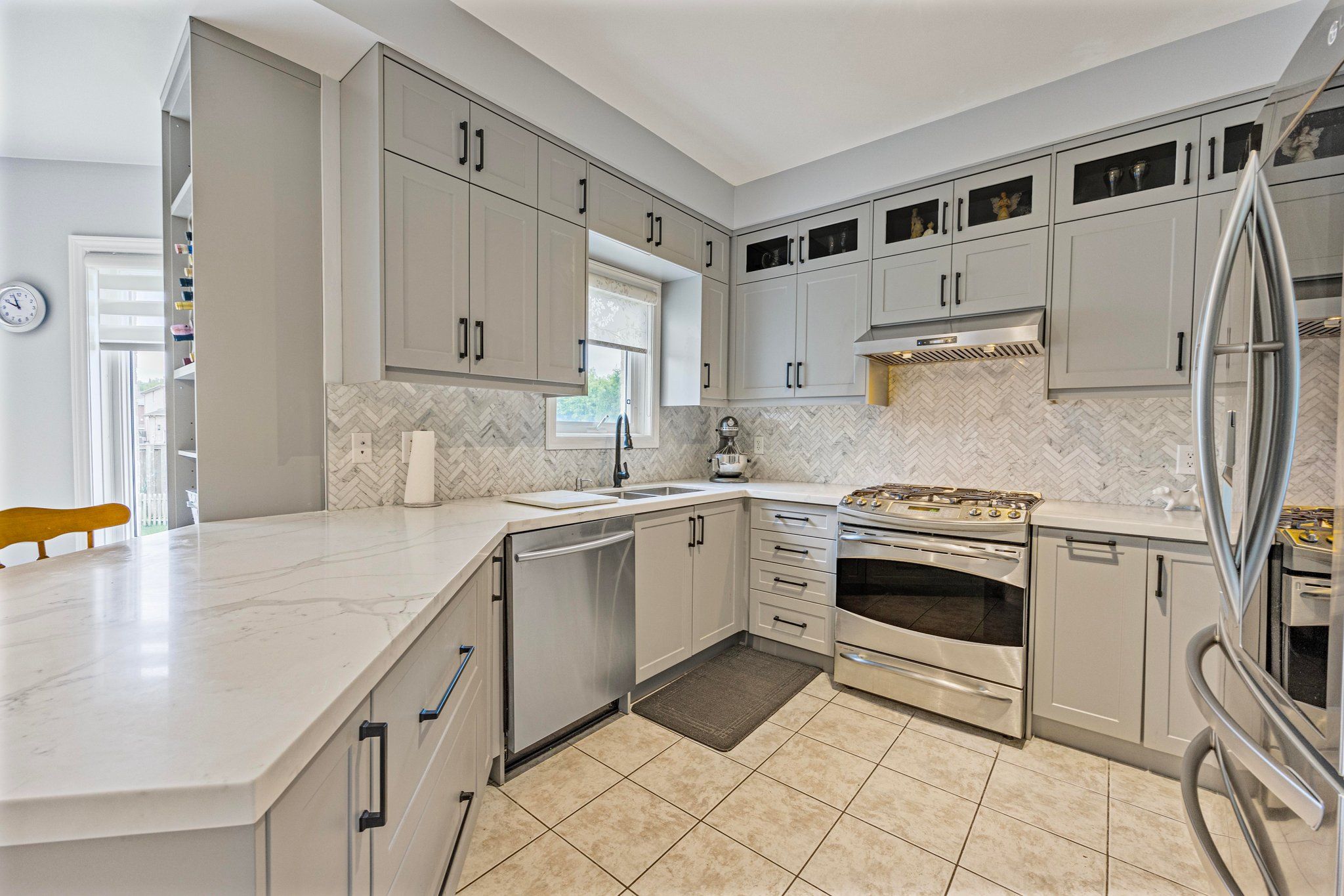 • Renovated chef's kitchen with quartz countertops and stainless steel appliances.
