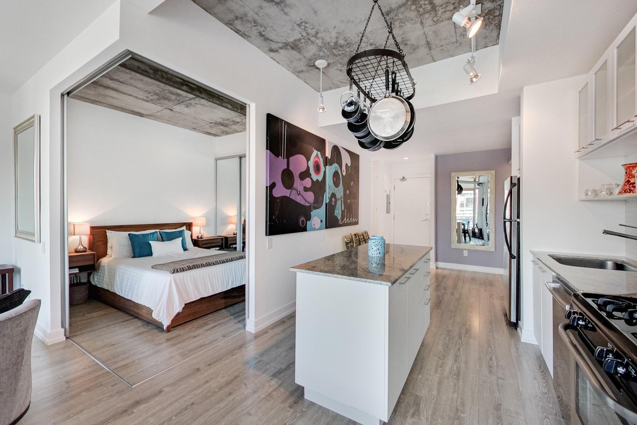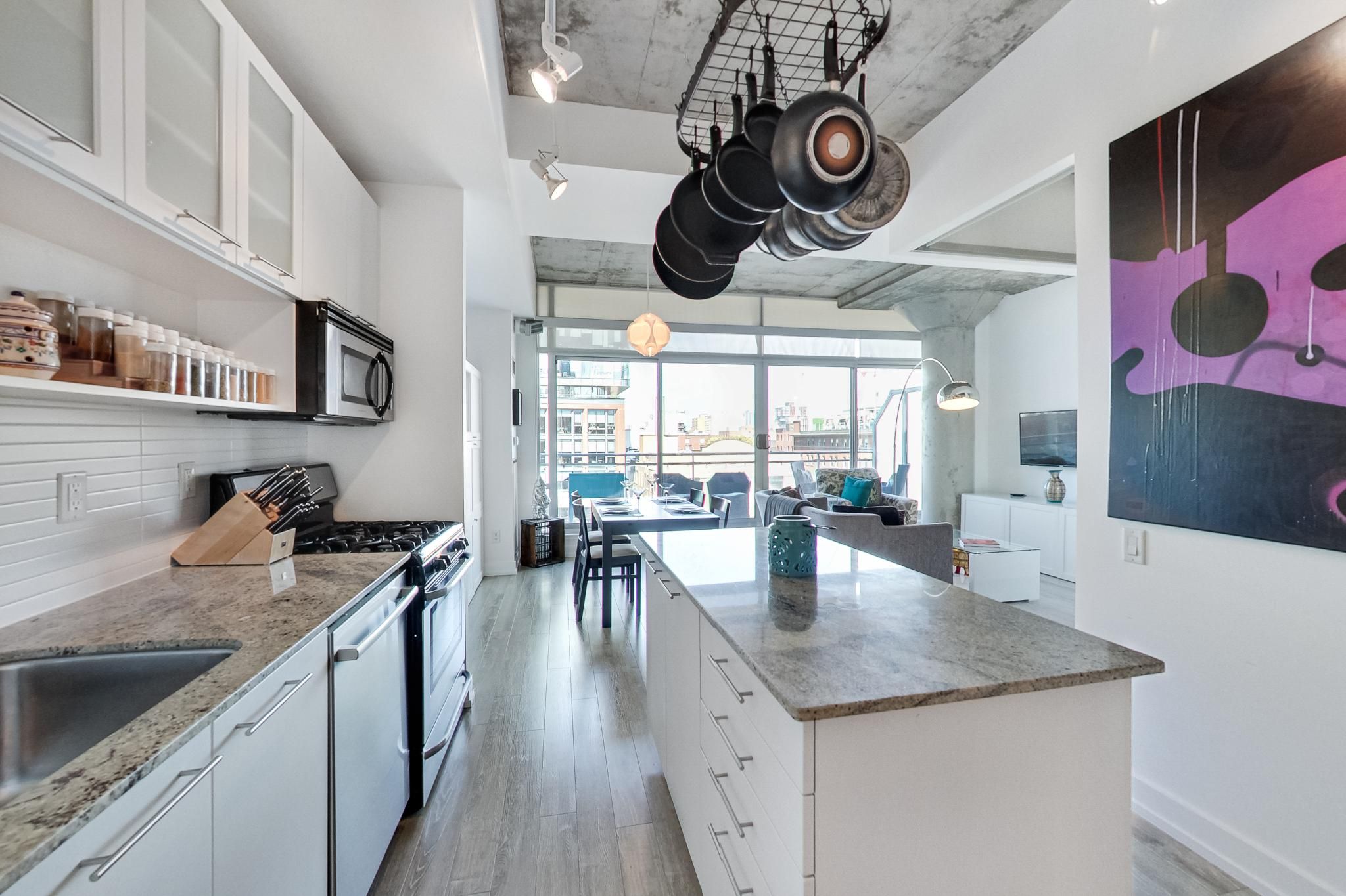Live in one of the best boutique soft lofts among all the action of king west! This bright and spacious urban loft has a very efficient, open concept 1 bedroom + den layout with a generous entertainment space. Includes 1 underground parking spot & 1 locker. 10' exposed concrete ceiling. Modern white kitchen with an island and gas cooking! Brand new flooring throughout. Huge wall-to-wall custom closet with mirrored doors. Upgraded 4pc bathroom. The den is outfitted with a built-in murphy bed to host your overnight guests after a night out on the town. Wall-to-wall floor-to-ceiling windows & double sliding doors that opens up the indoors to a spacious terrace-style balcony with a natural gas b. B. Q. Hook-up. Enjoy the view overlooking king west, while having dinner and drinks outside or soaking up the afternoon summertime sun.