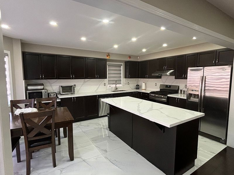 • Modern kitchen with quartz countertops and stylish backsplash.
