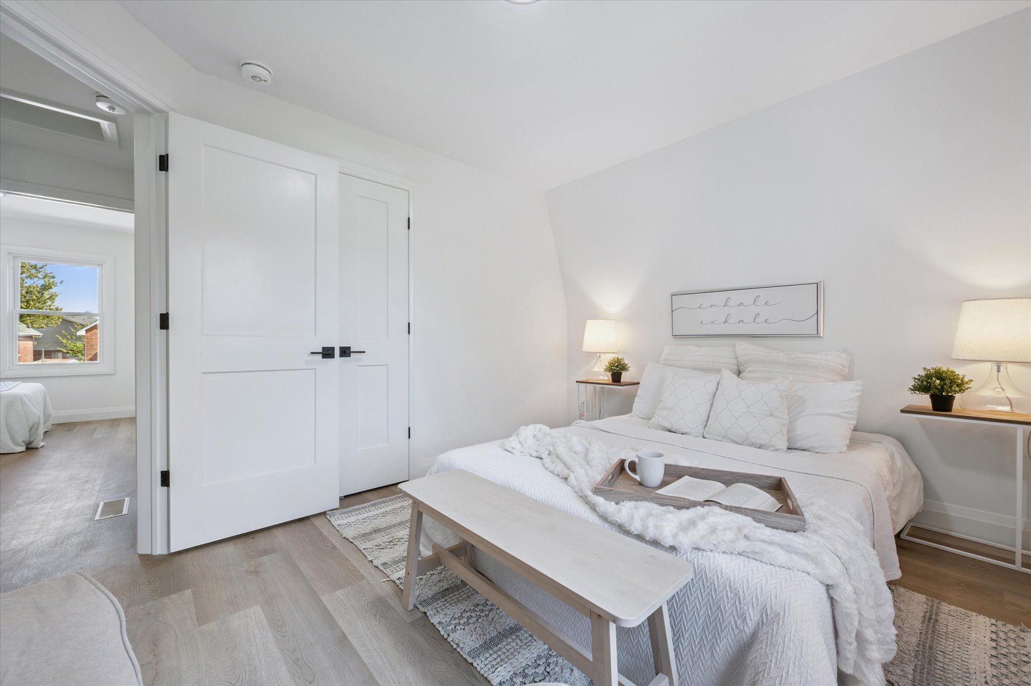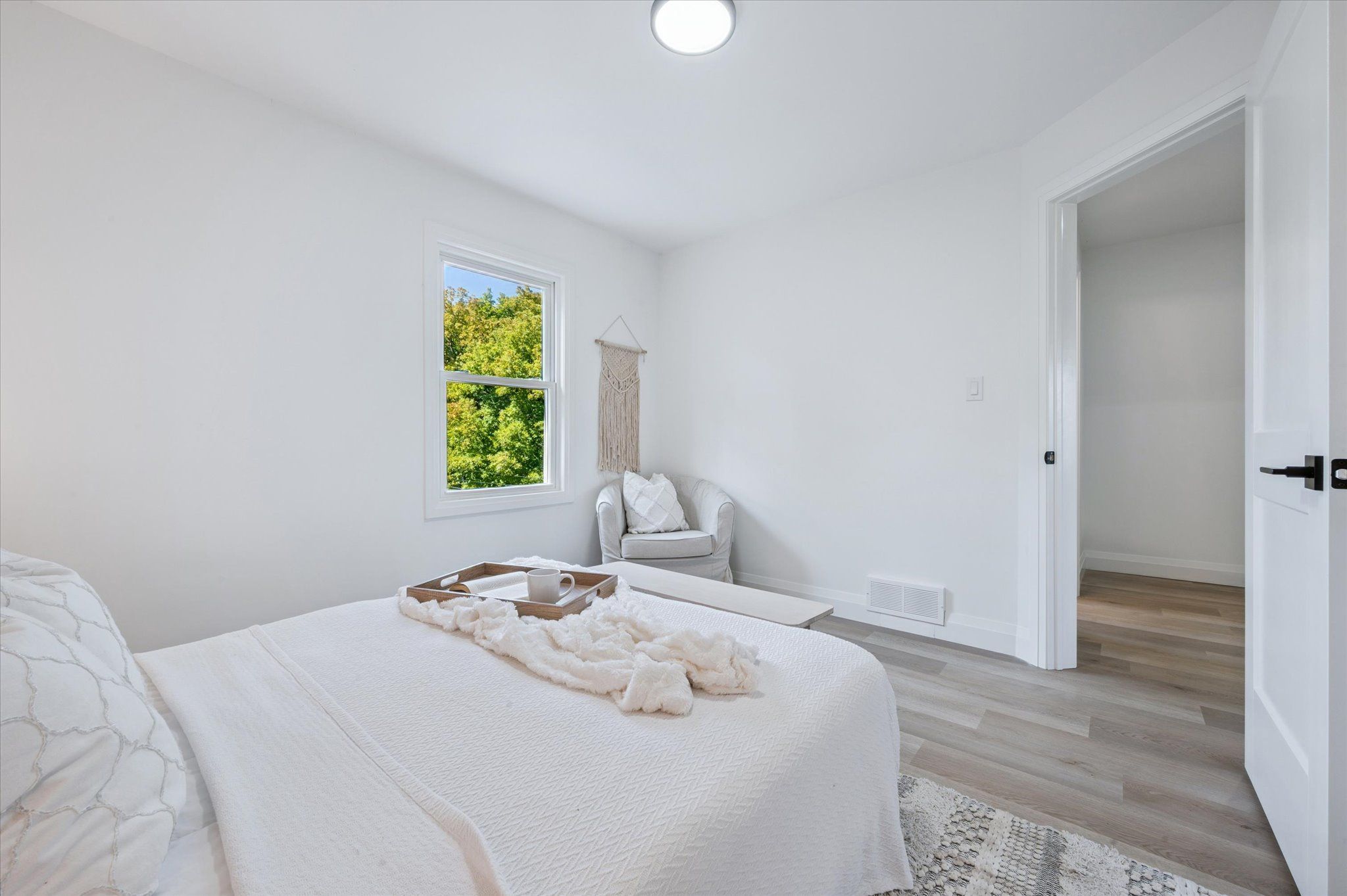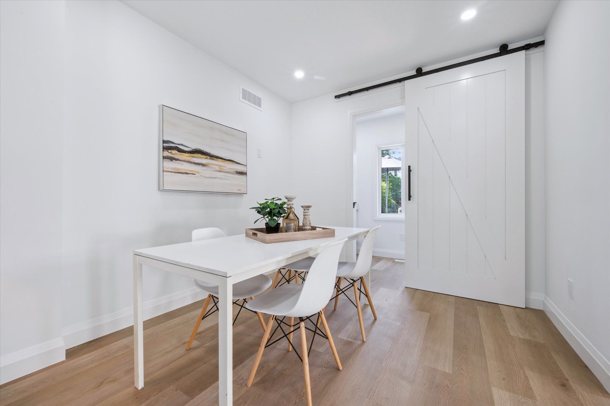 • Stylish barn door in spacious living room adds character and charm.