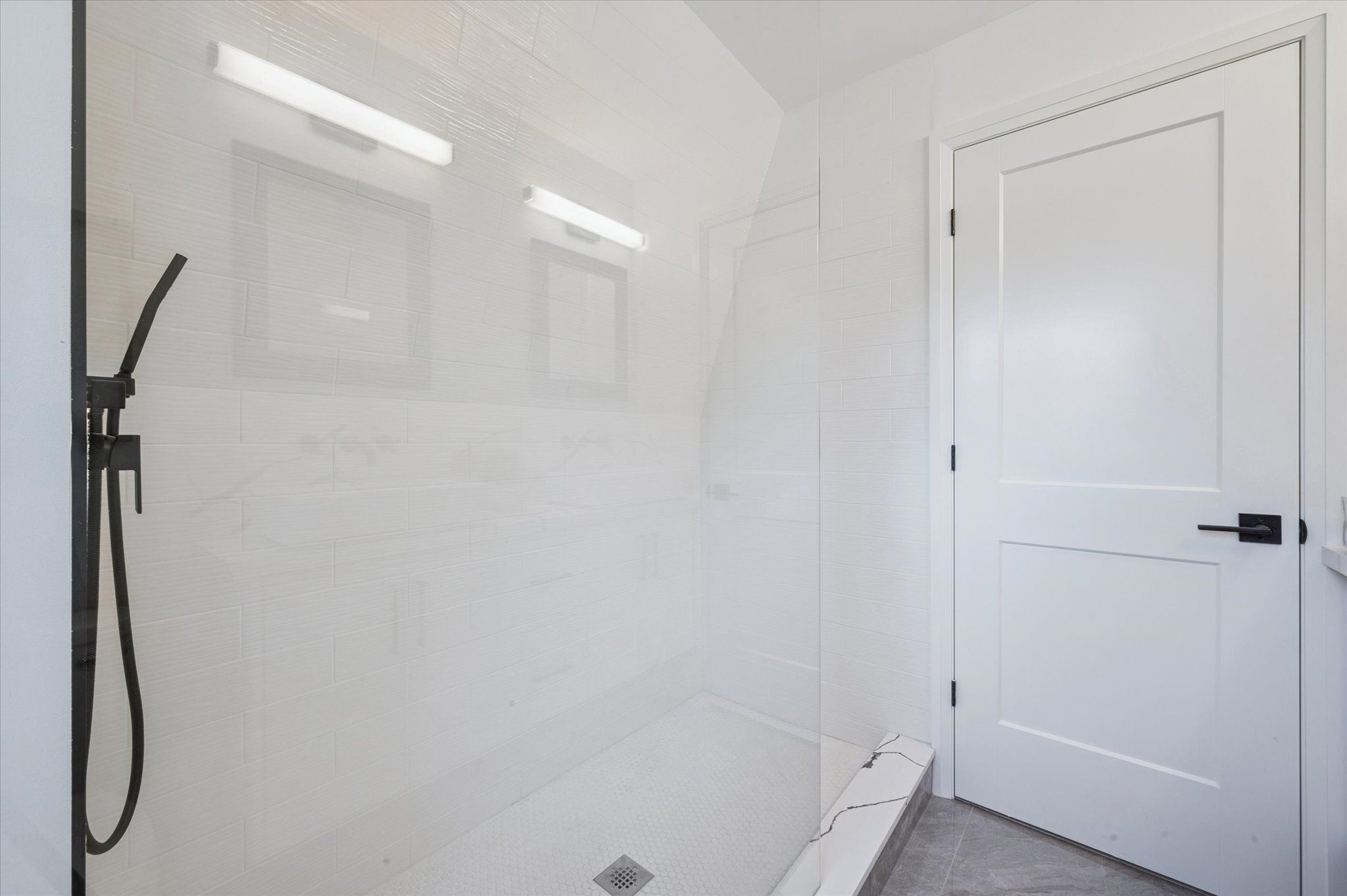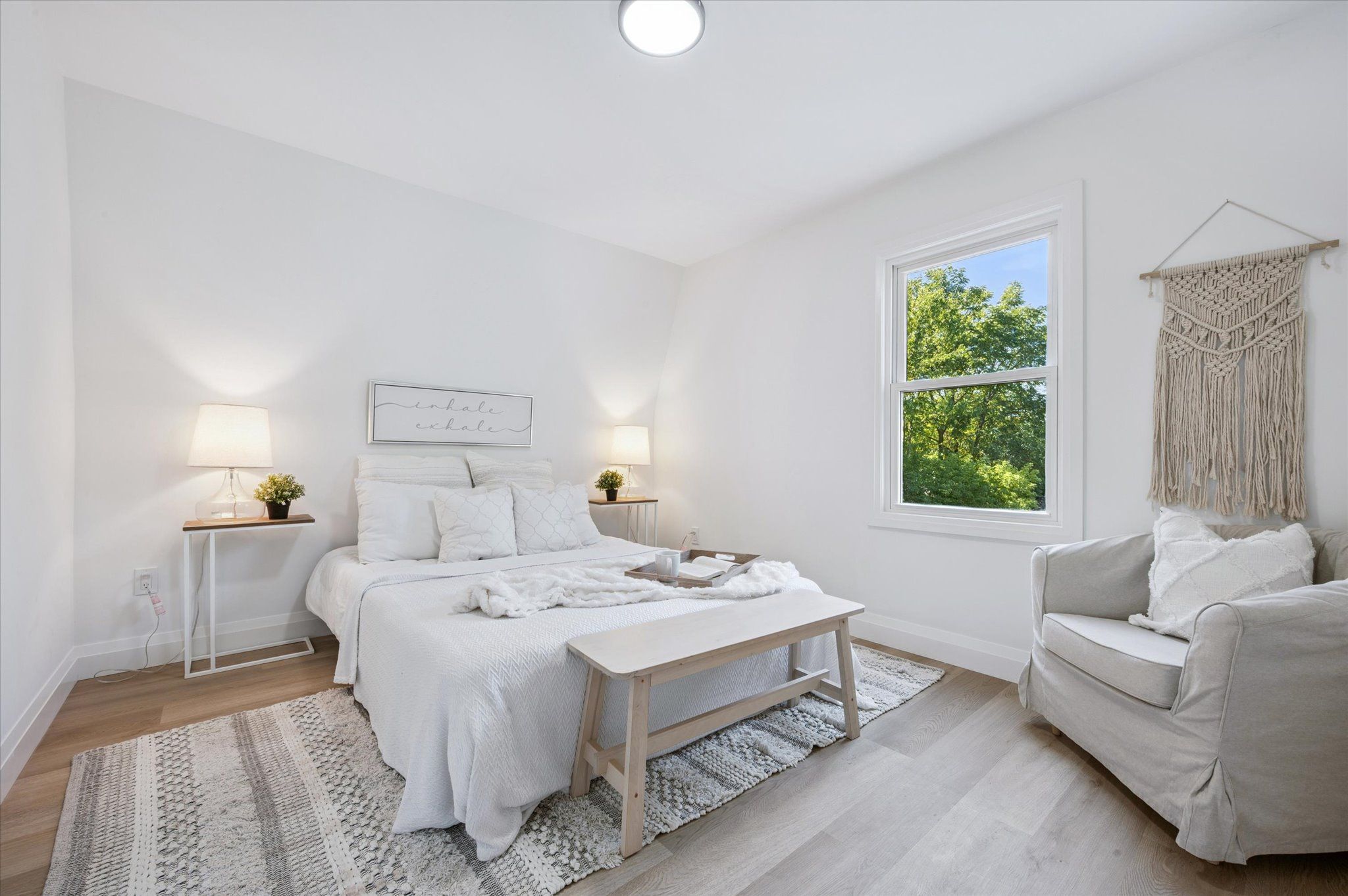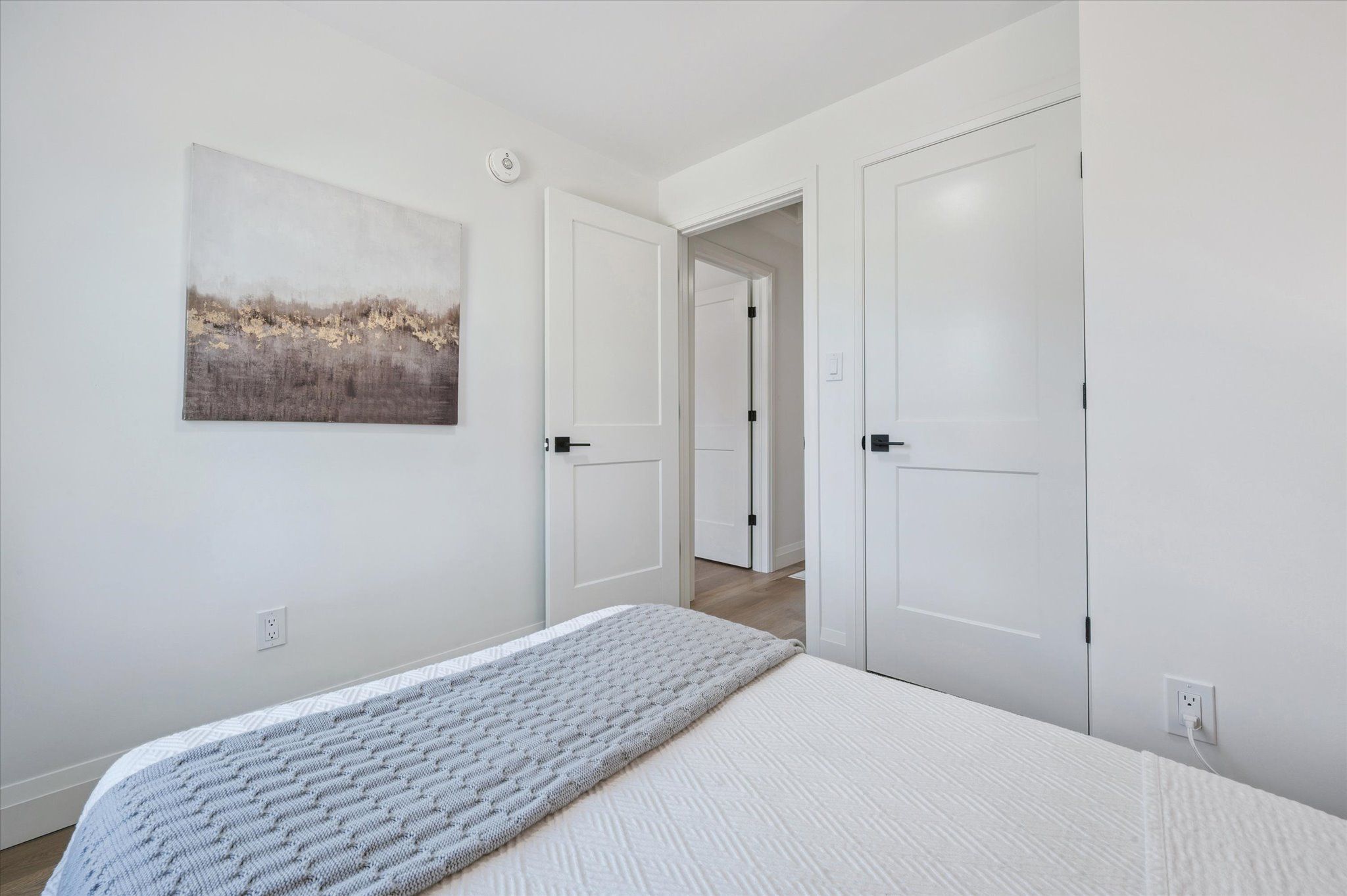 • Stylish barn door in spacious living room adds character and charm.