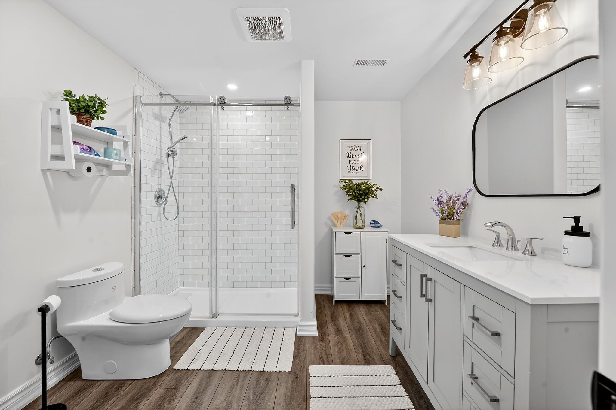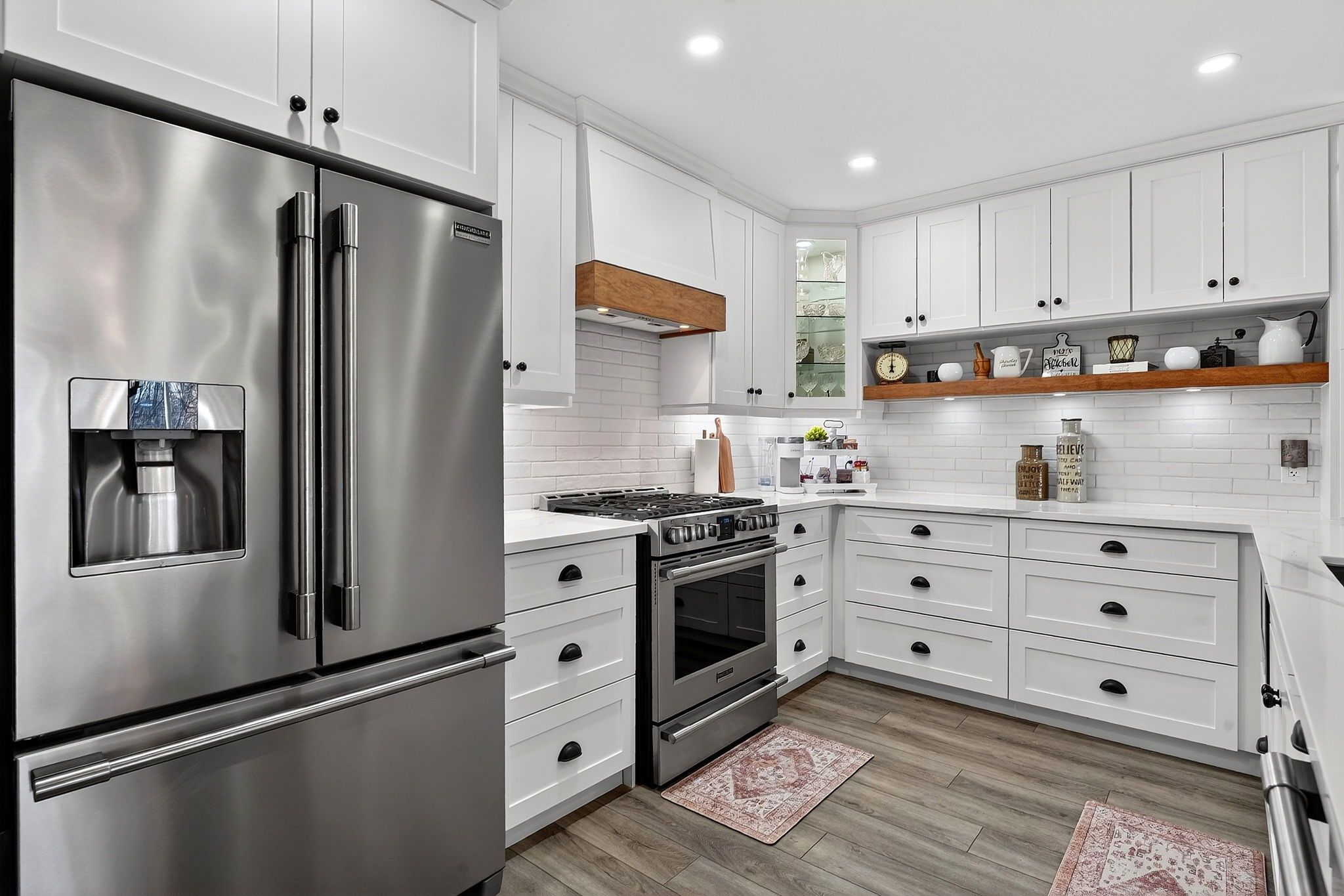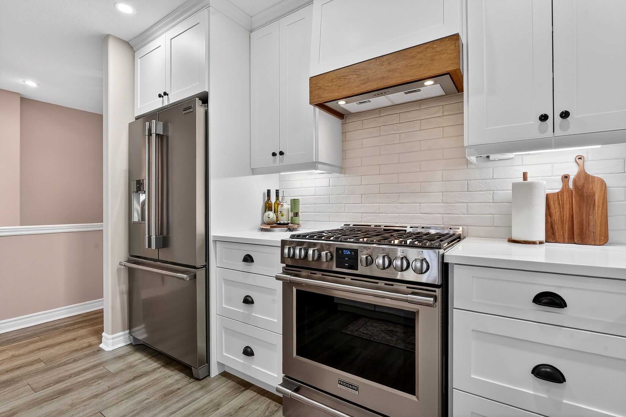 • Brand new kitchen featuring modern white cabinetry and wood accents.