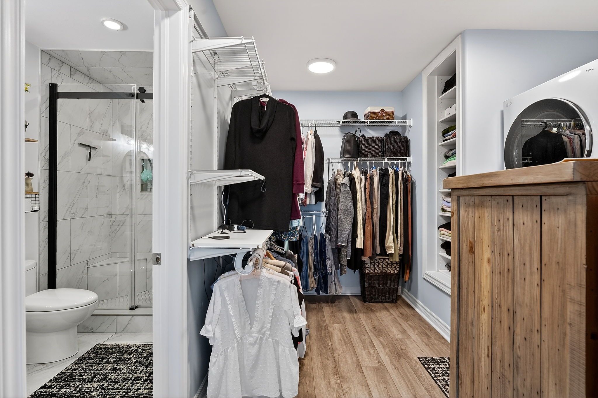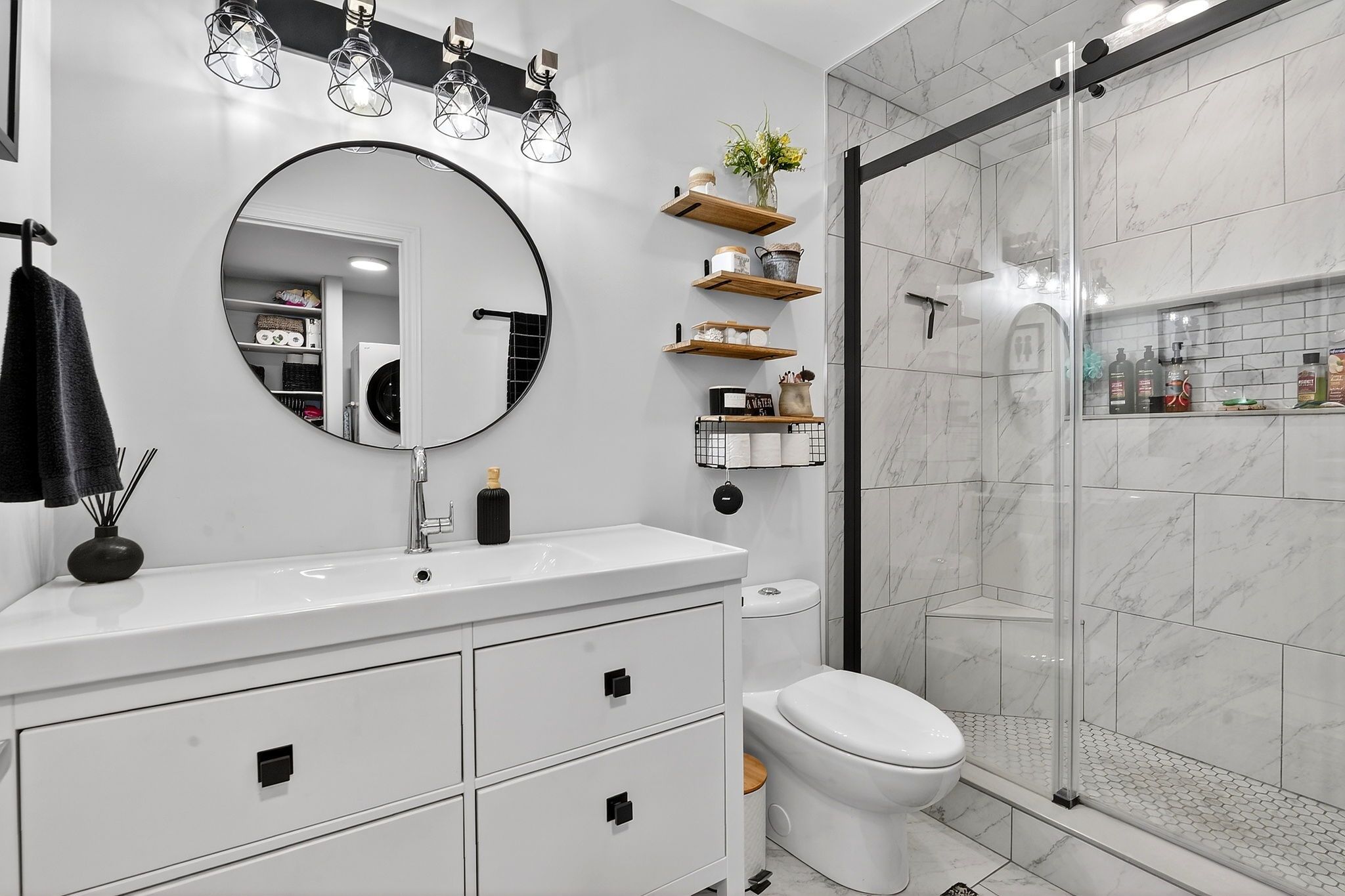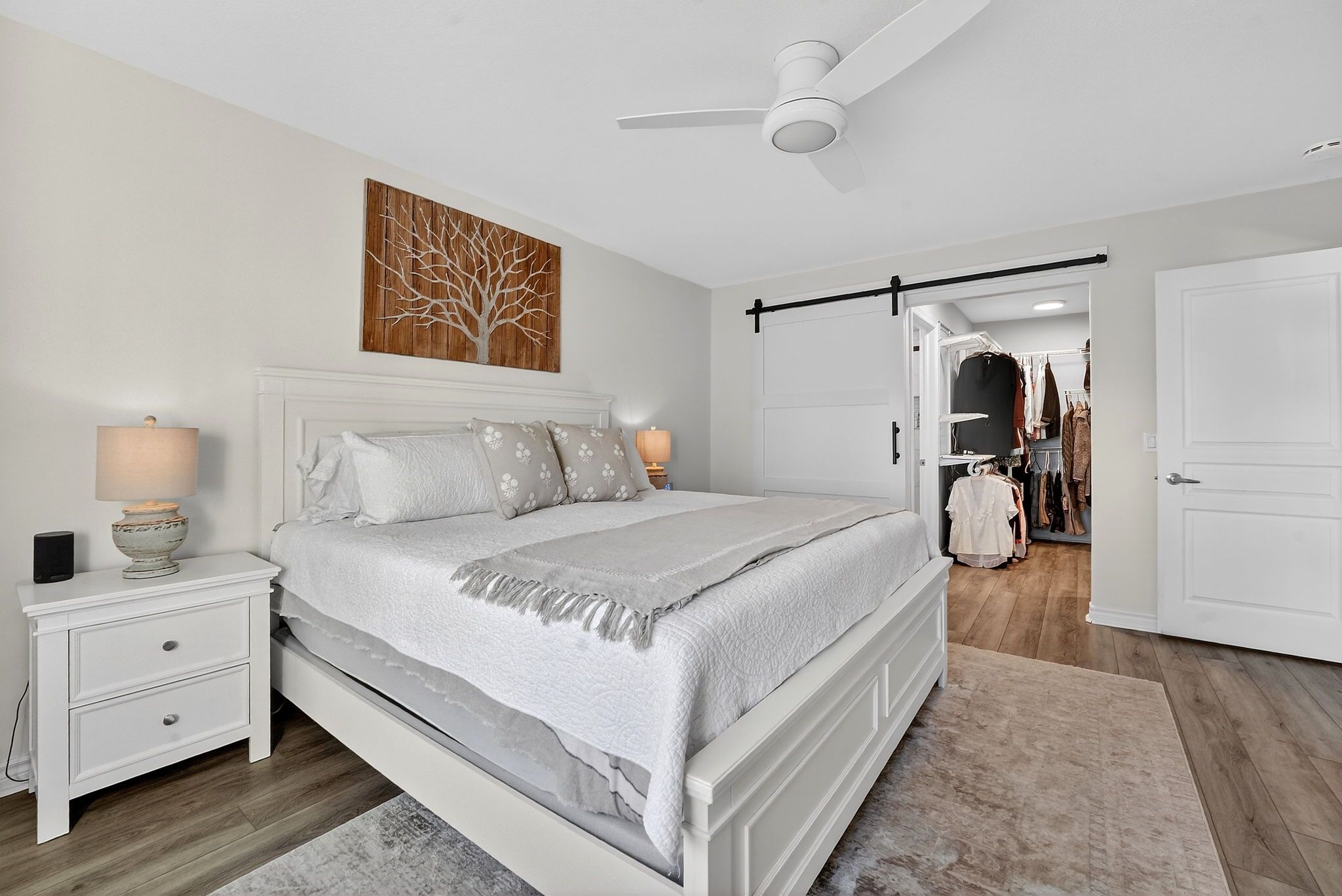 • Brand new kitchen featuring modern white cabinetry and wood accents.