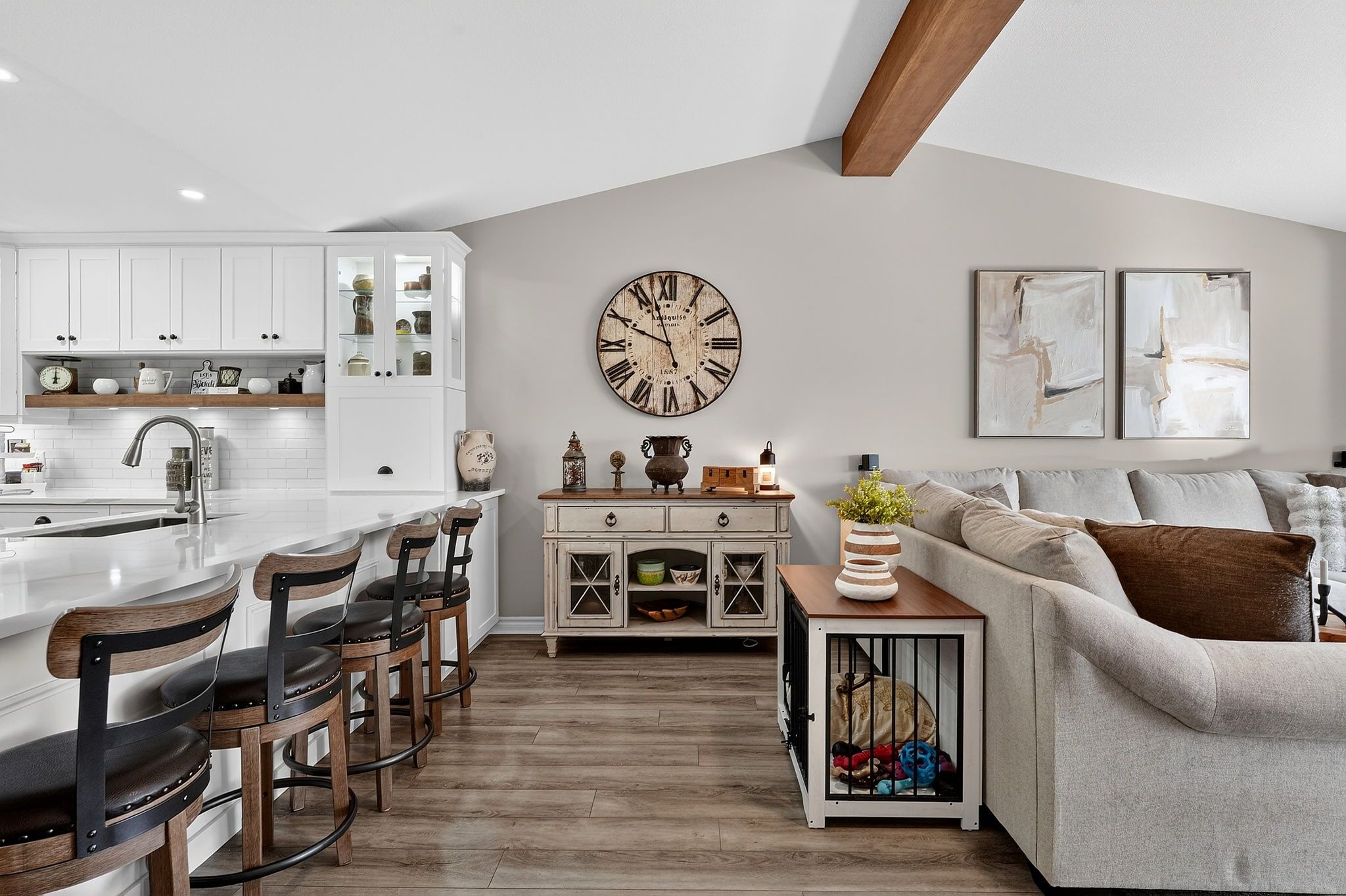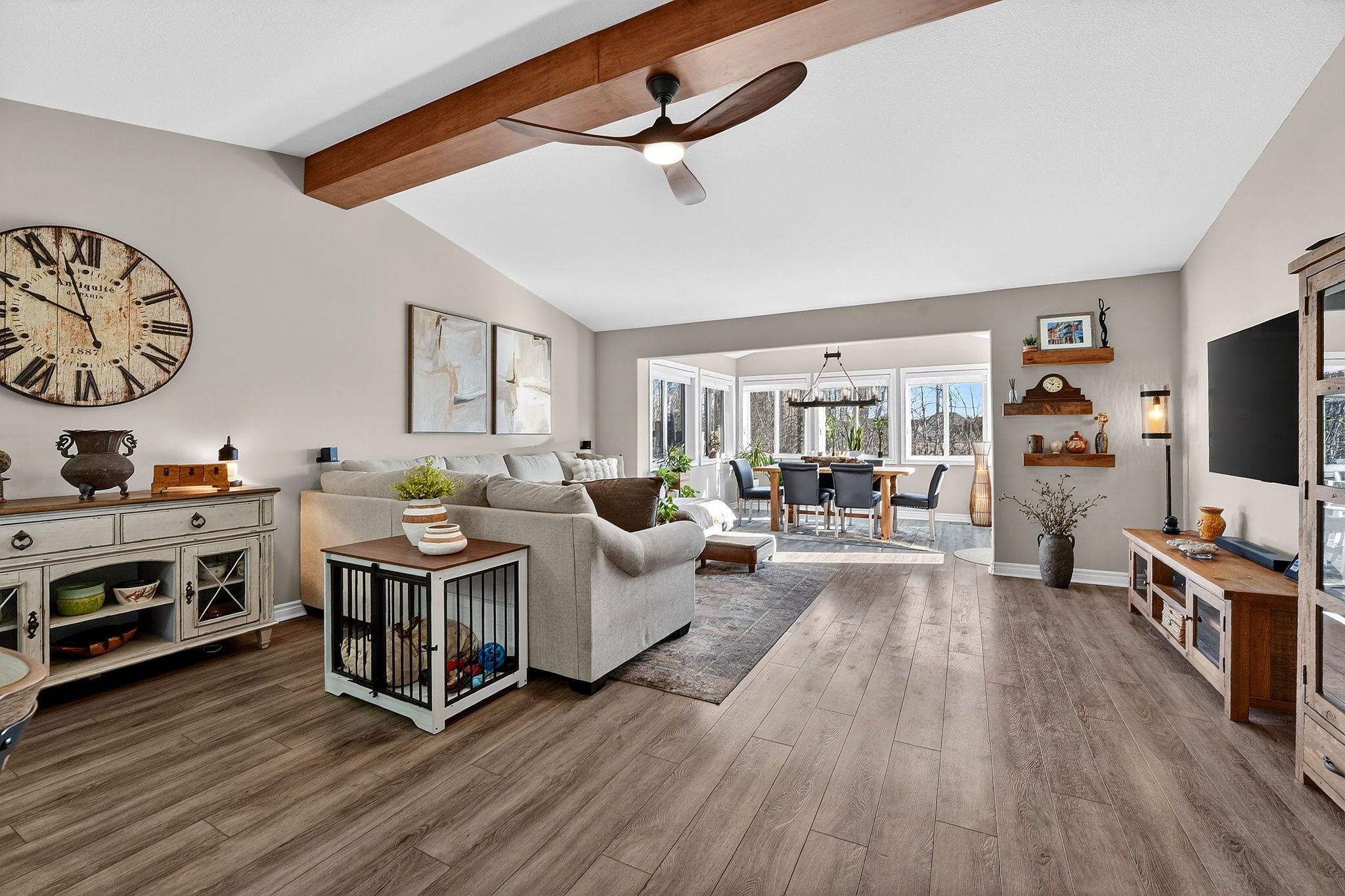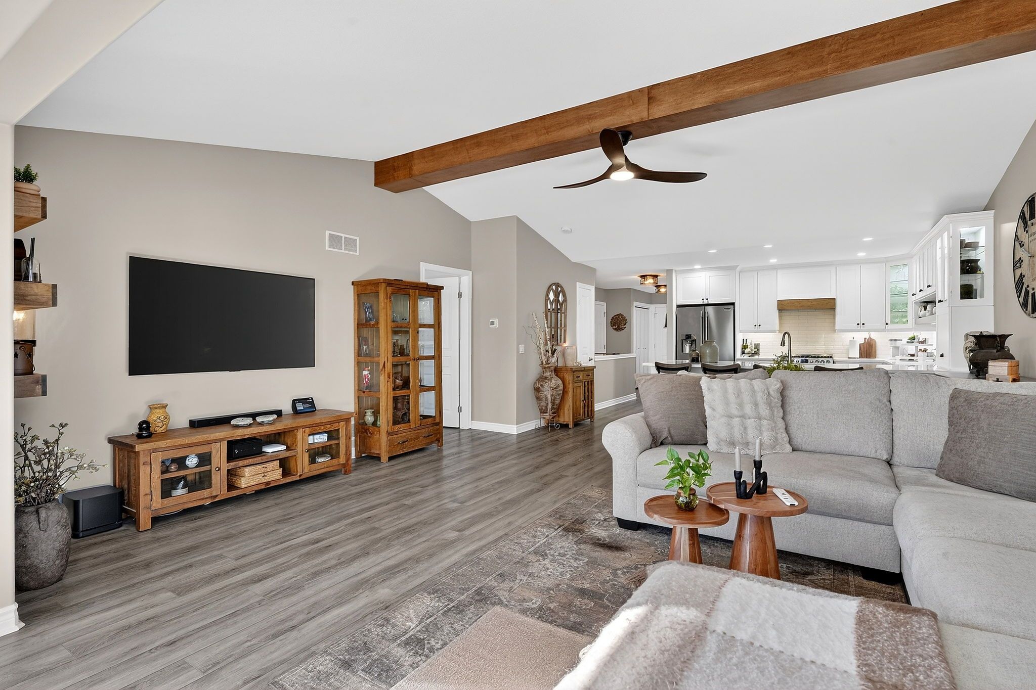 • Vaulted ceilings with a stylish new faux wood beam.