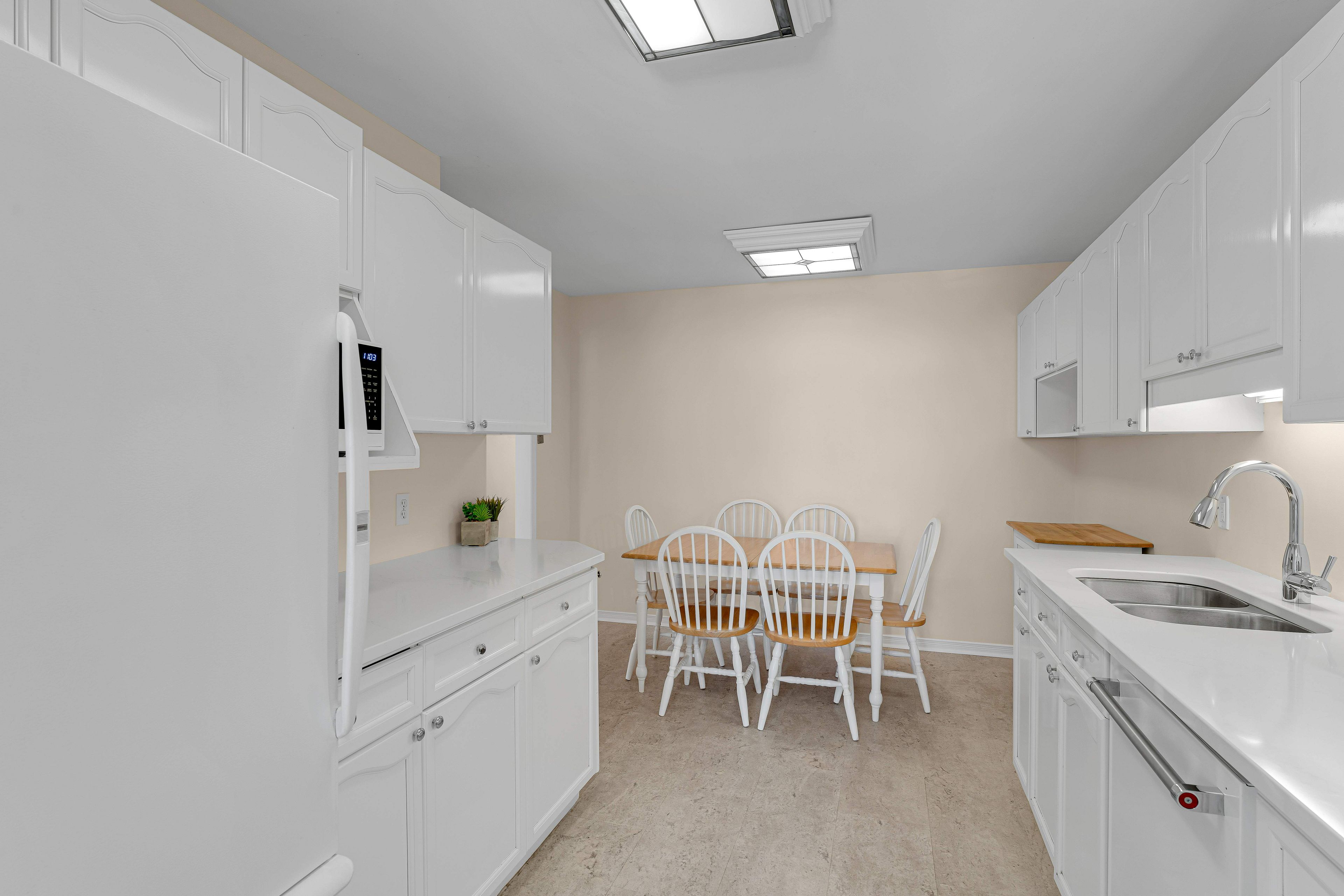 • Updated kitchen with refinished cabinets, countertops, and room for a table.
