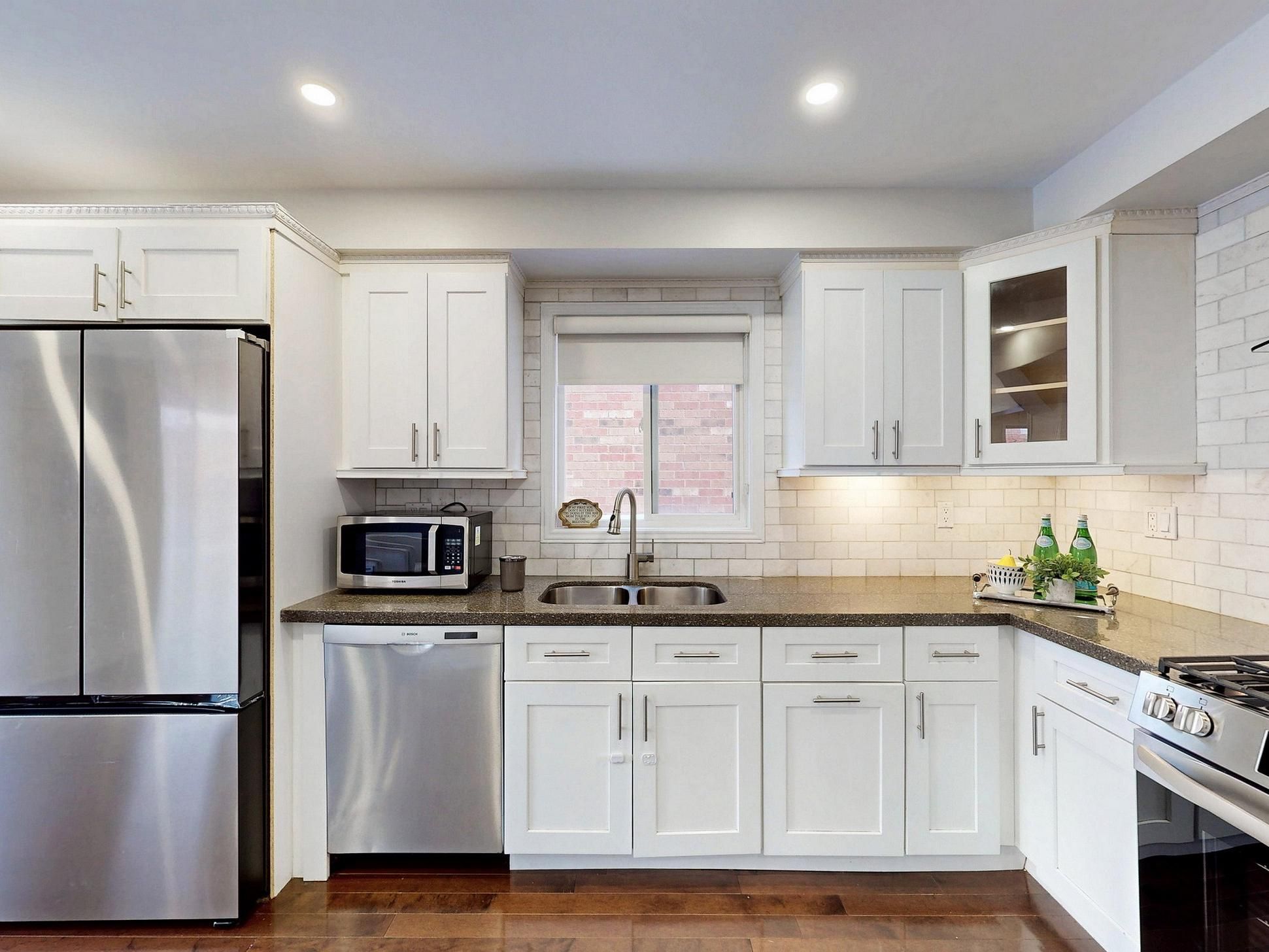 • Upgraded kitchen featuring granite countertops, subway tiles, and stainless steel appliances.