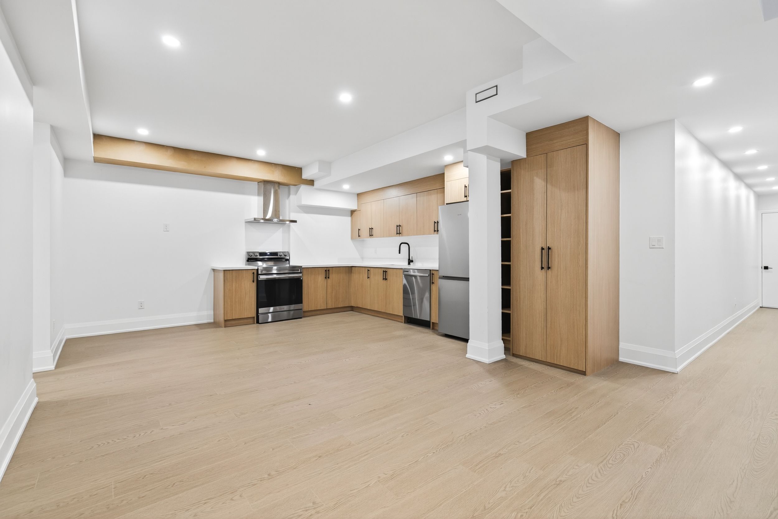 • Open-concept living area with a modern kitchen and stainless steel appliances.