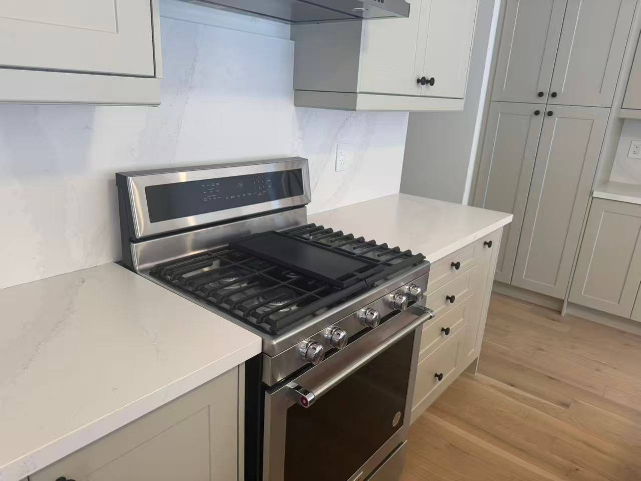 • Modern kitchen featuring quartz counters and hardwood flooring.