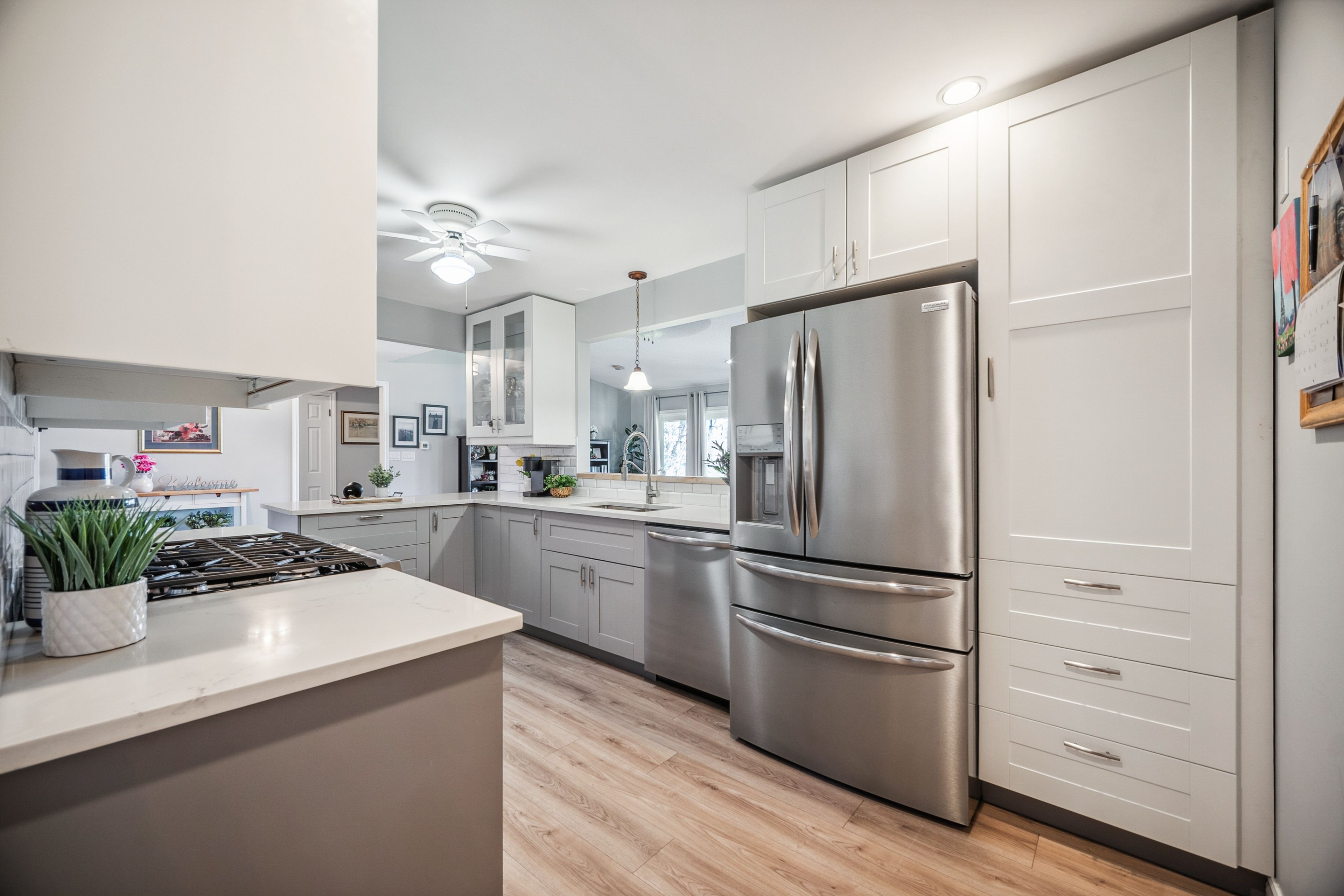 • Renovated kitchen with quartz countertops and stainless steel appliances.