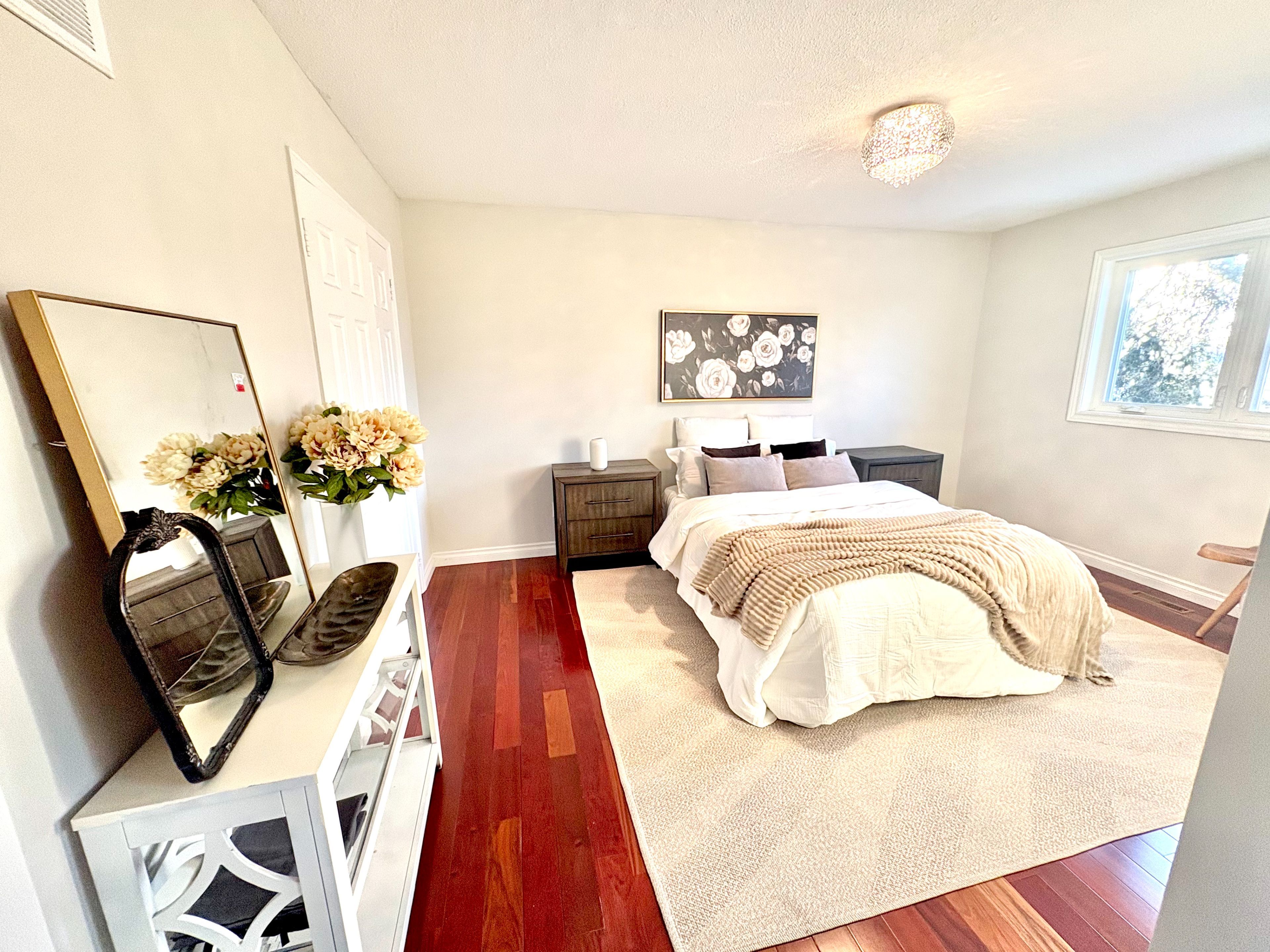 Stunning, well-maintained 4-bedroom family home located on a quiet cul-de-sac in the prestigious trelawny neighborhood, featuring hardwood flooring on the main and second levels, elegant main-floor moulding, and a modern kitchen with quartz countertops, backsplash, pot lights, and stainless steel appliances; the primary bedroom offers a heated floor in the ensuite, while recent upgrades include windows (2017) and a cedar deck with a 6-person hot tub (2017), complemented by a long private driveway for up to 4 cars, all within steps to schools, transit, shopping, and recreational facilities.