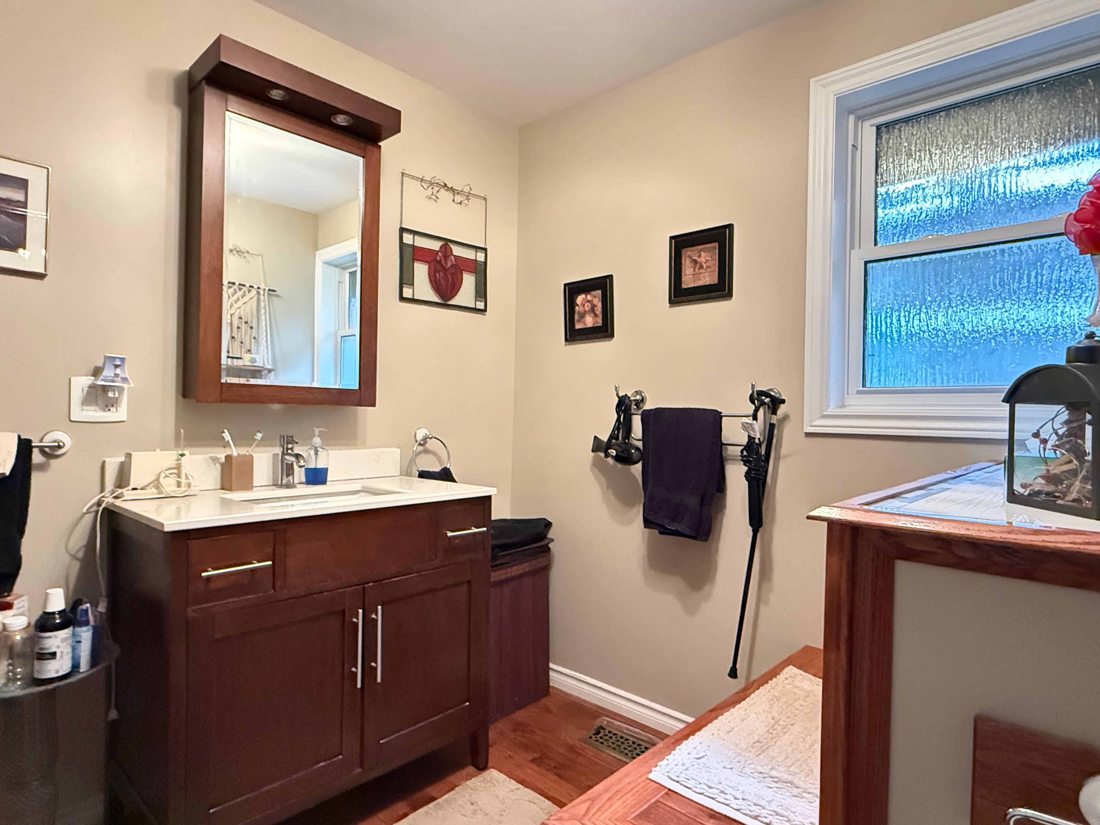 • Bright living room with hardwood flooring and large front window.