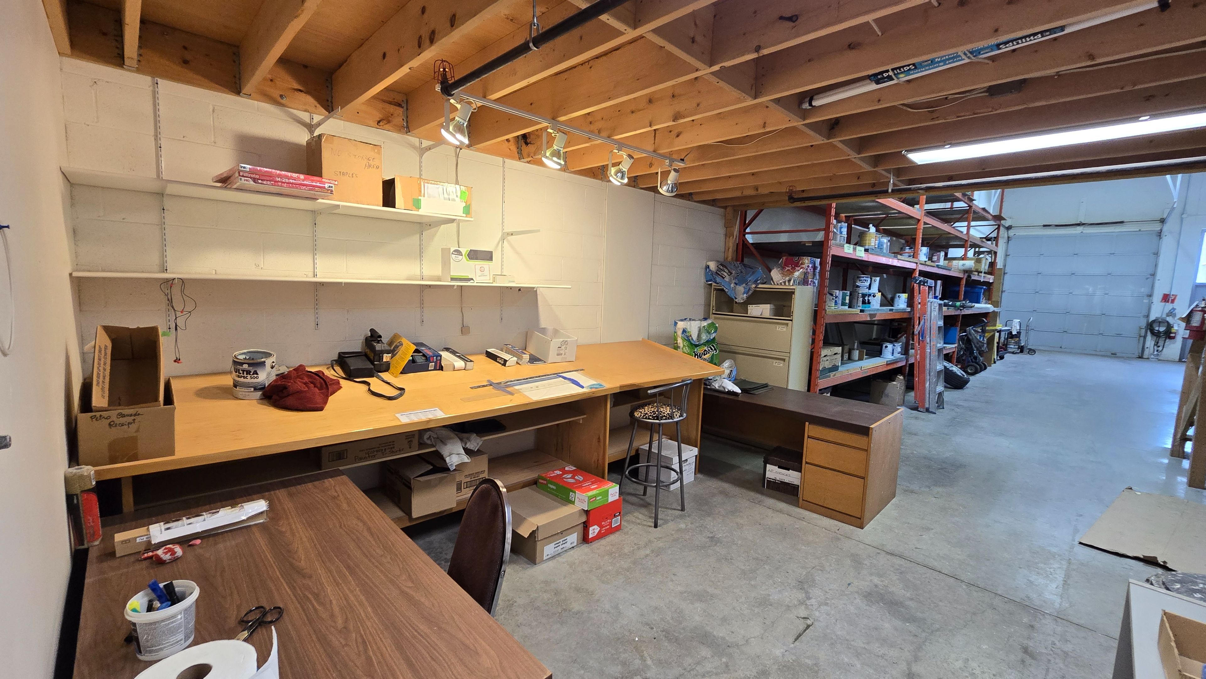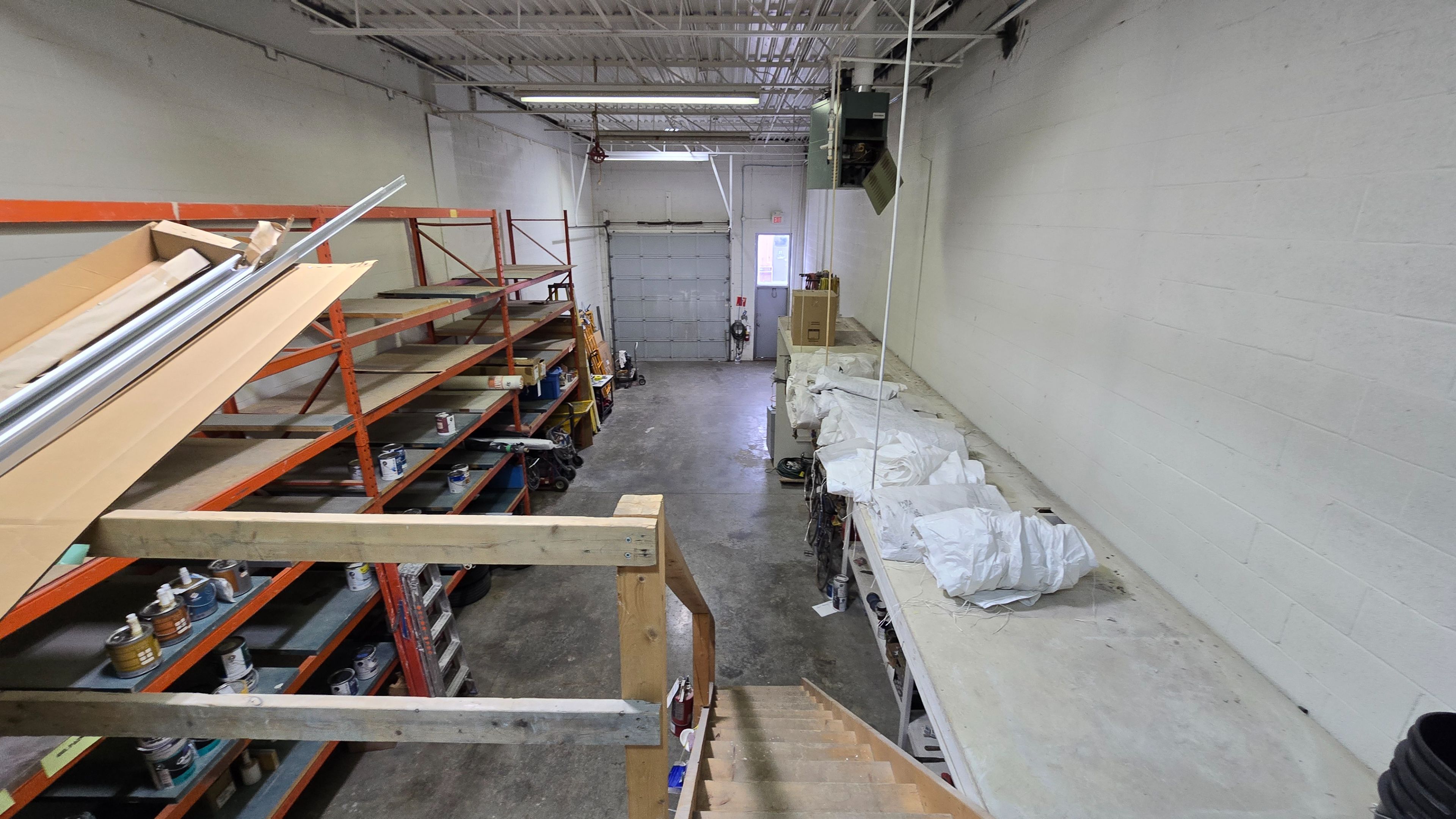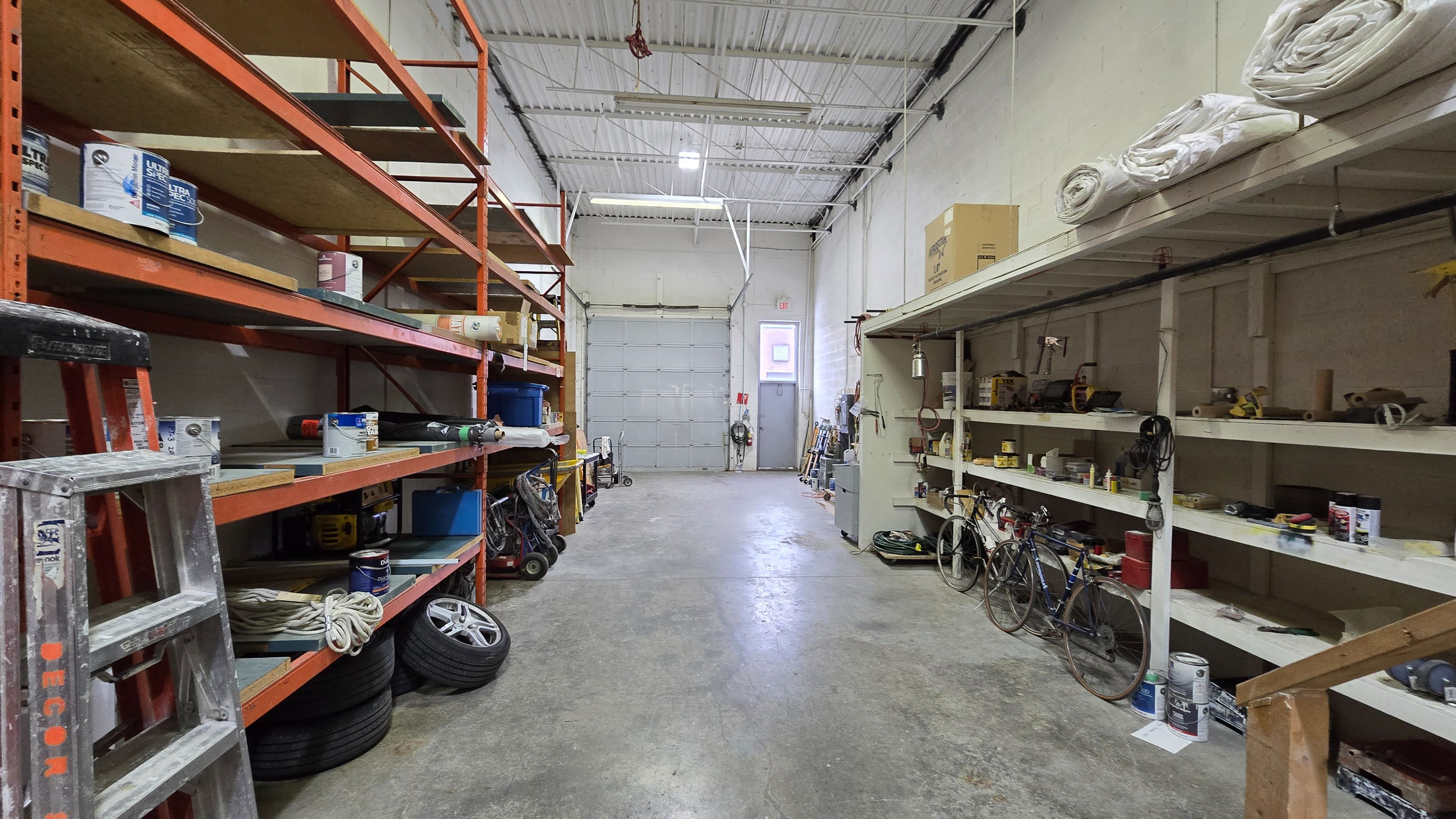 • Bright warehouse space featuring painted walls and large drive-in door.