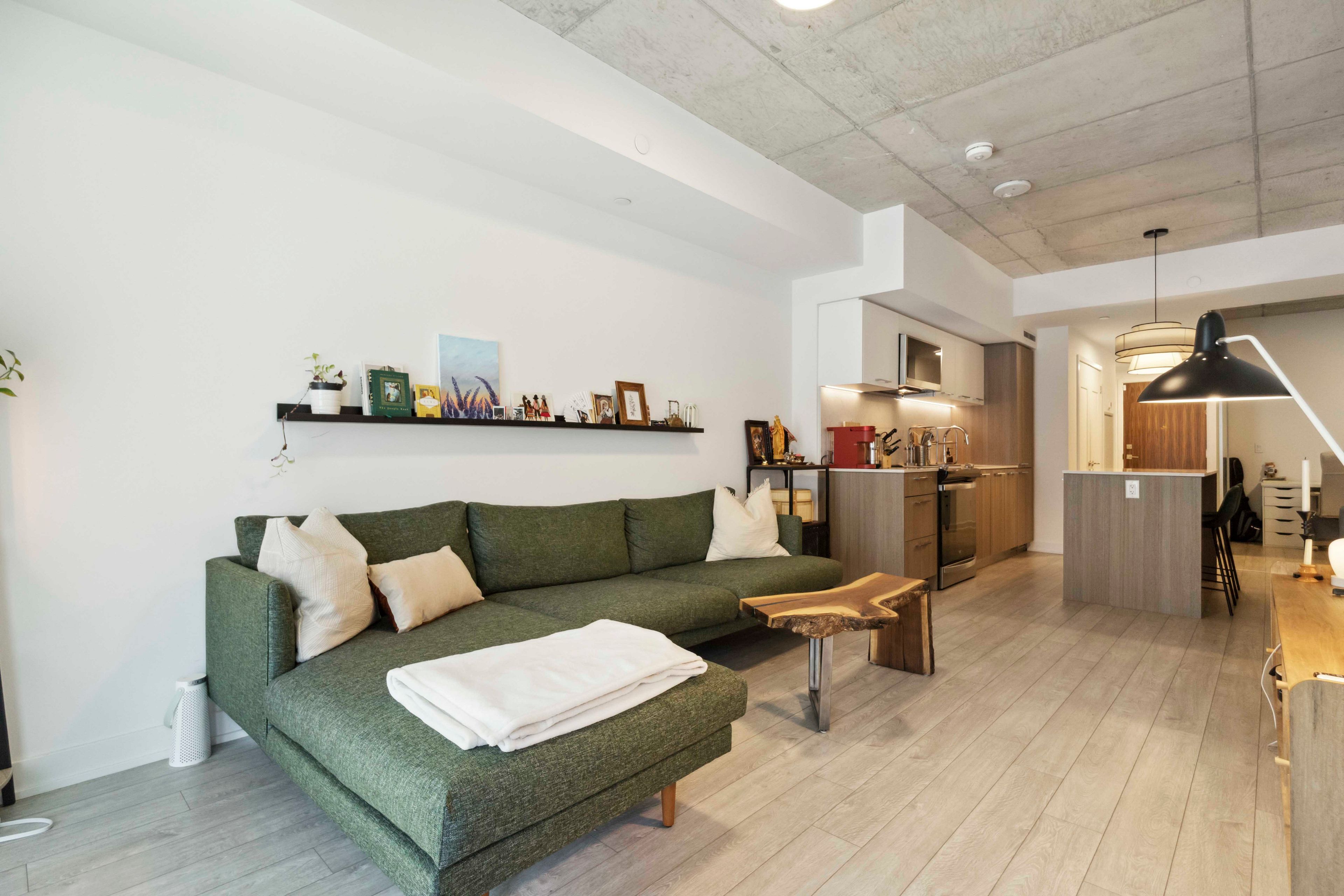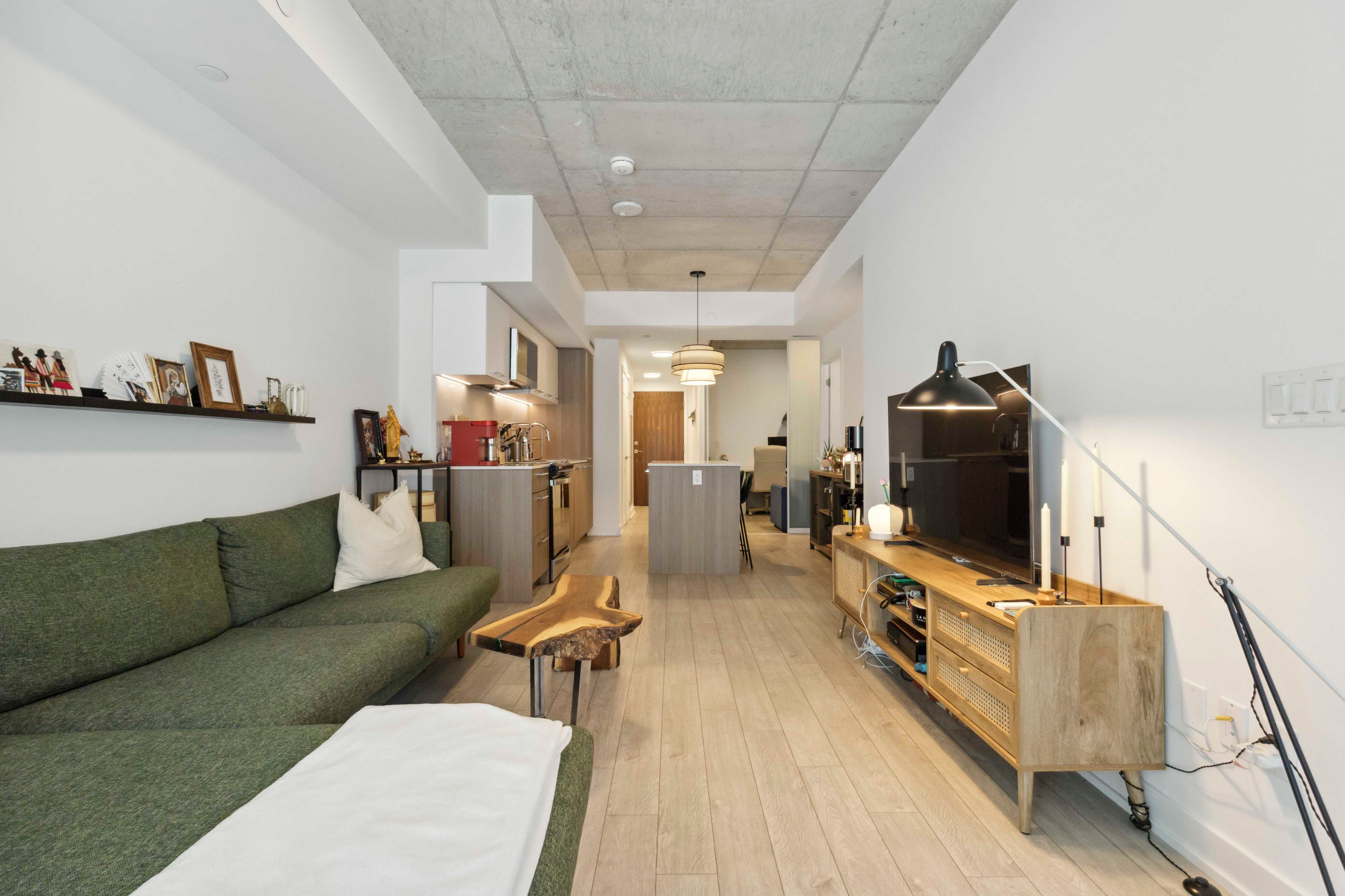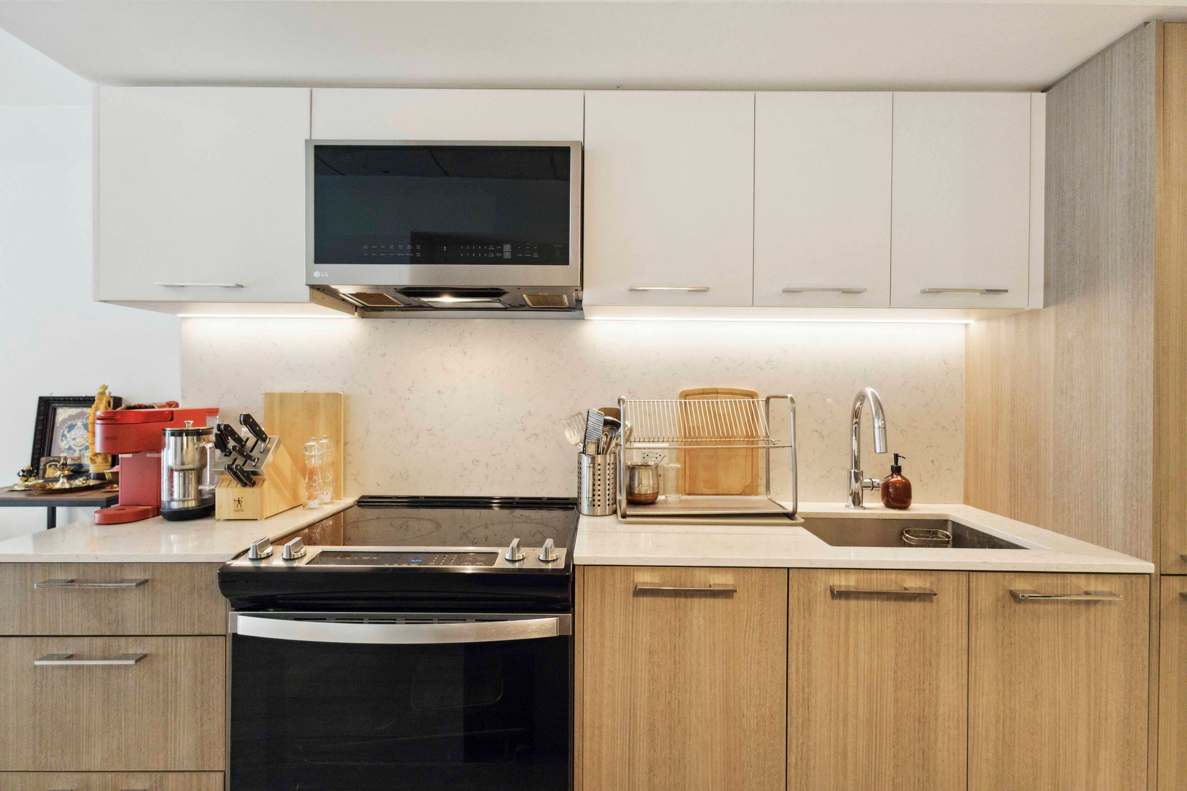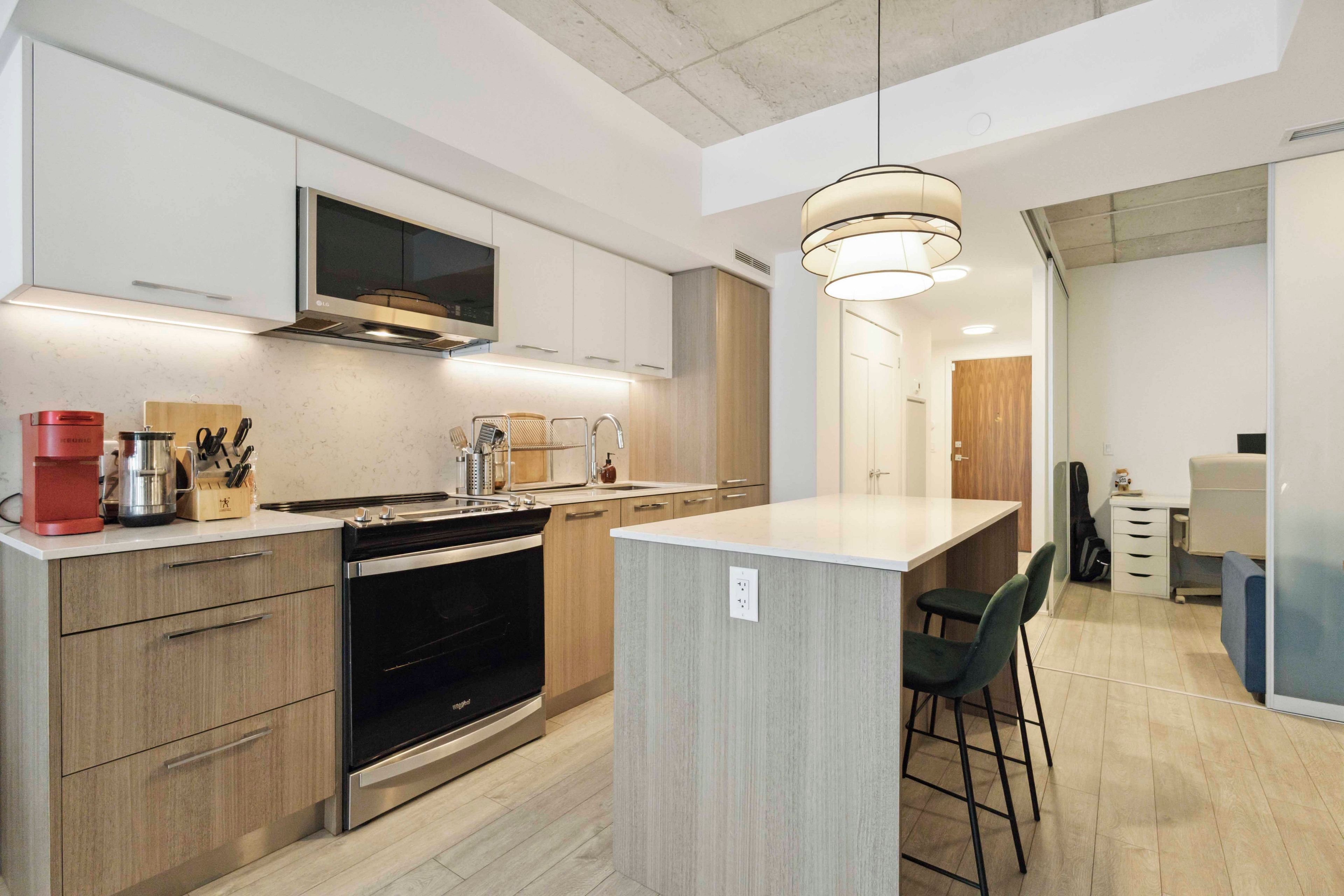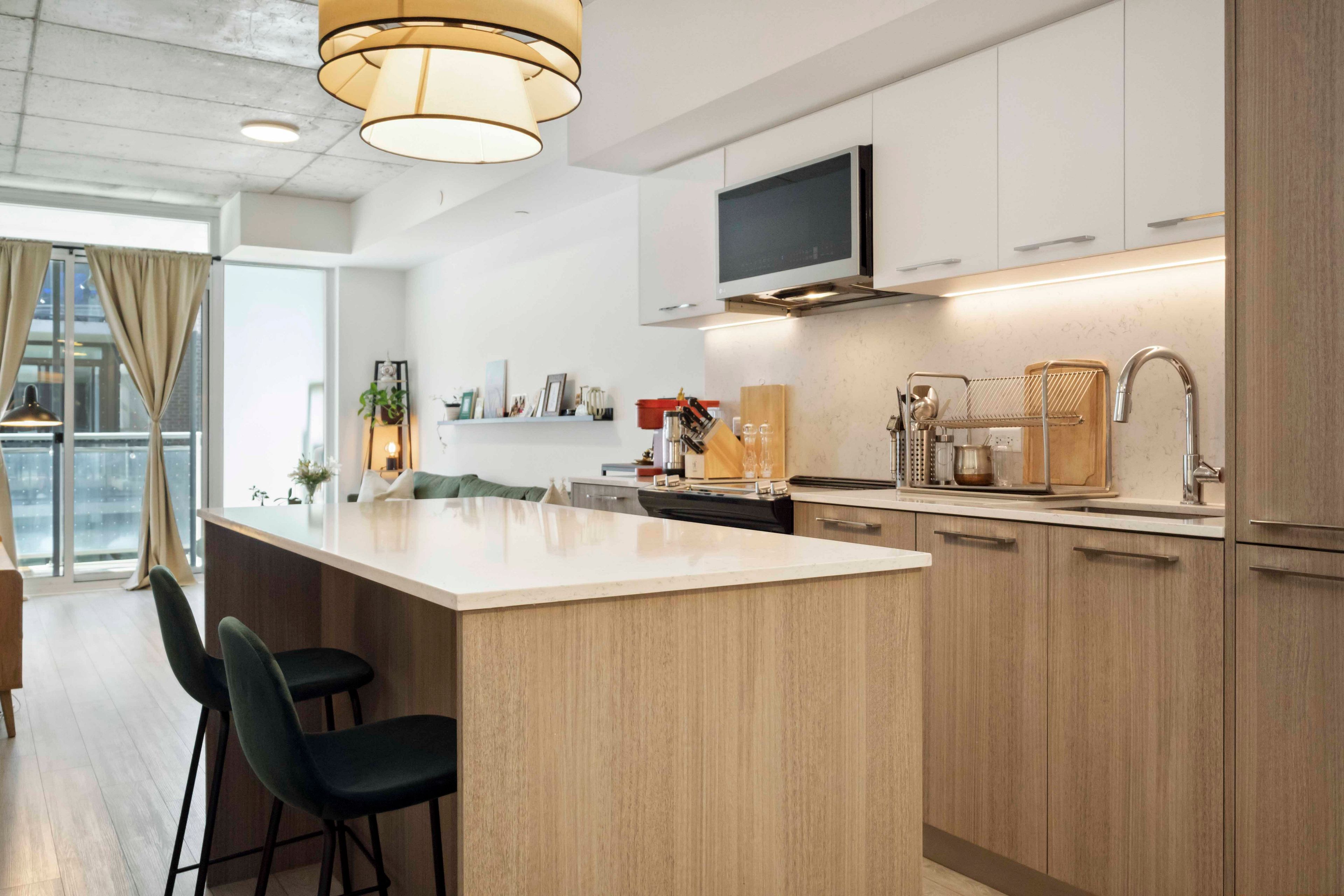 • Modern kitchen with quartz countertops and integrated appliances.