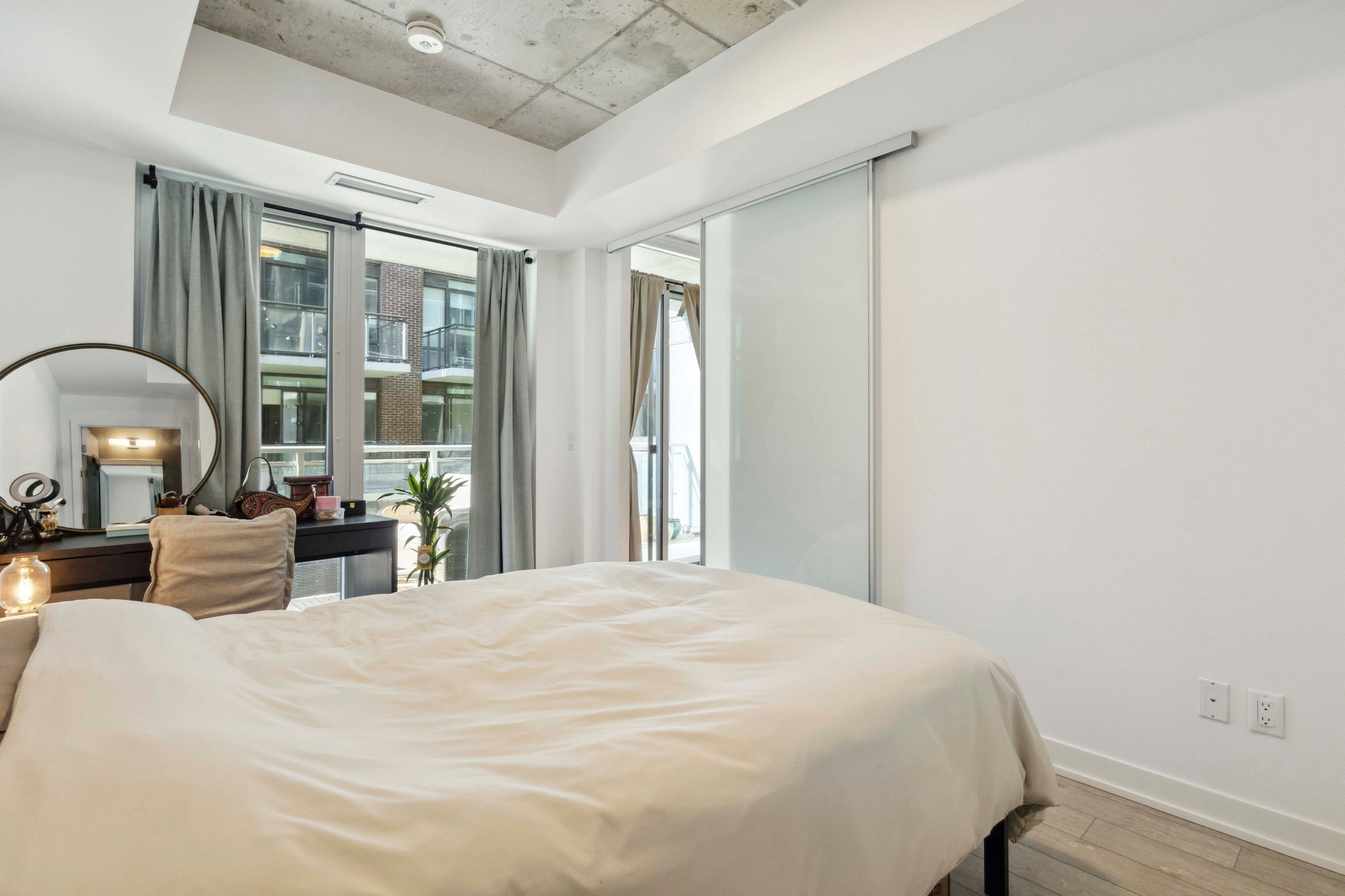 Welcome to a beautifully designed 2-bedroom, 2-bathroom loft with underground parking and a massive walkout balcony in riverside square, toronto's vibrant, boutique community by streetcar developments. Located in the heart of south riverdale, this bright and airy unit features soaring ceilings, floor-to-ceiling windows, exposed concrete accents, and gorgeous modern finishes. The sleek kitchen offers fully integrated appliances, quartz countertops, and a large center island. Enjoy custom doors, designer lighting, and full-size laundry. The spacious primary bedroom includes a large closet and 3-piece ensuite, while the second bedroom offers wall-to-wall storage. Premium building amenities include a rooftop infinity pool with panoramic city views, rooftop terrace with bbq, party room, fully equipped fitness centre, and 24-hour concierge. With a 97 walk score and 92 transit score, you're just steps from queen street, the dvp, and some of torontos best restaurants, cafes, and green spaces. A rare, move-in-ready loft in one of the city's most exciting neighbourhoods!
