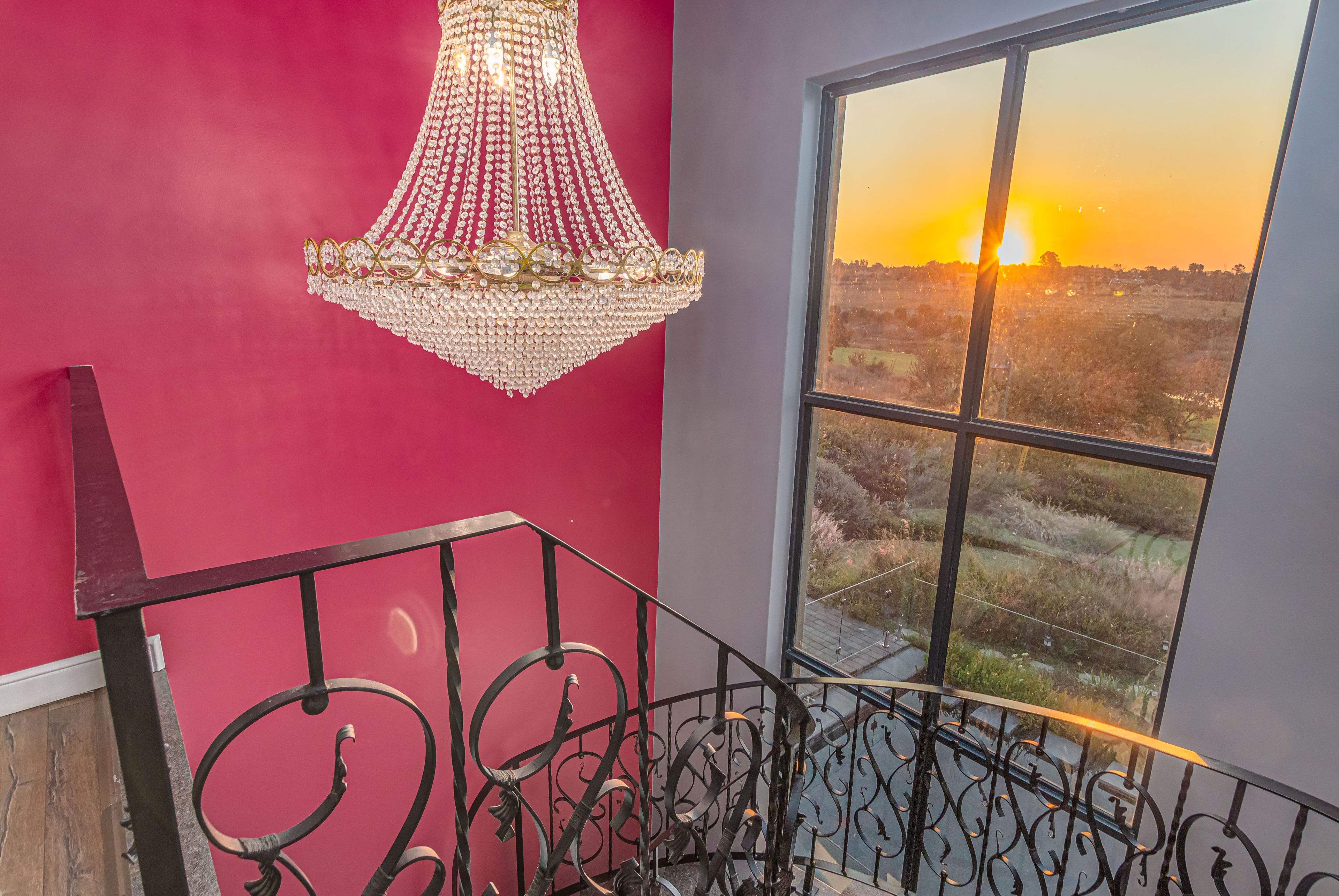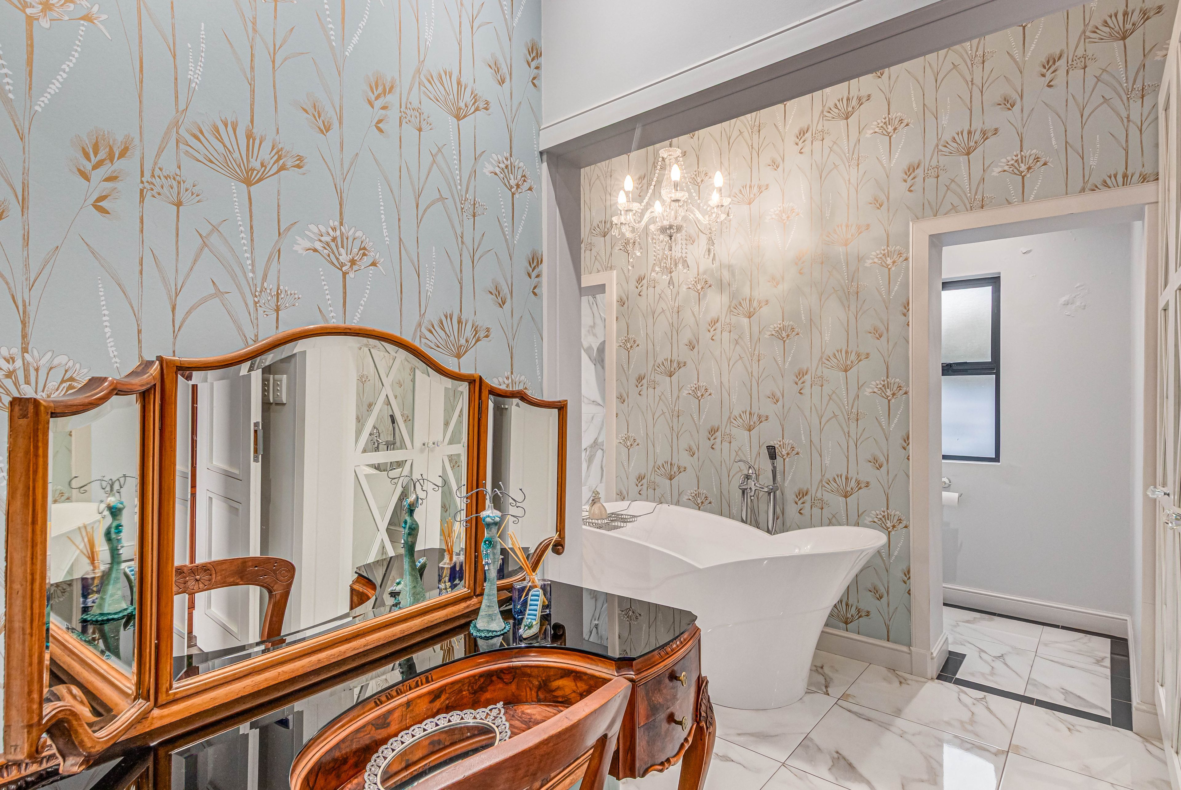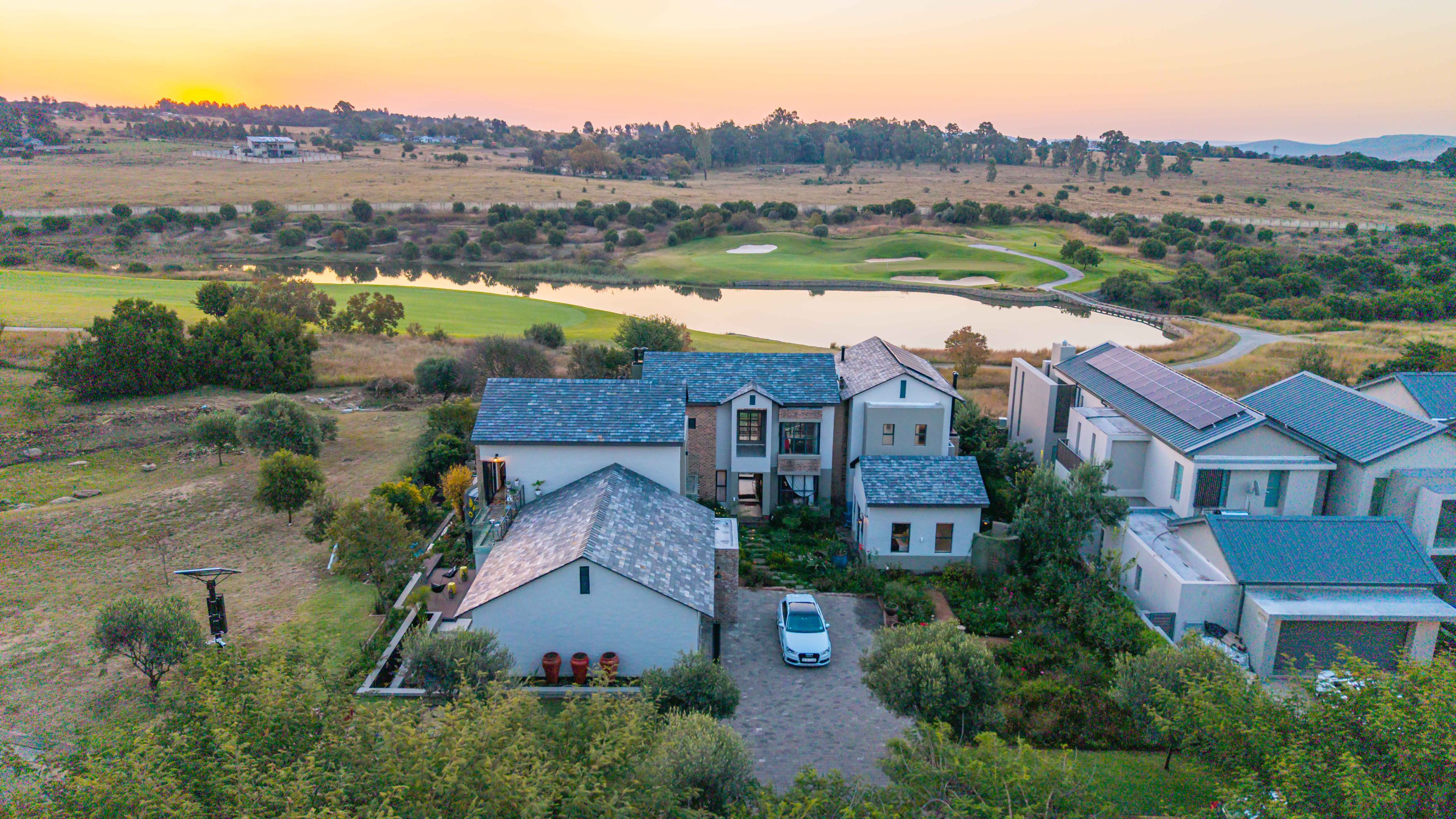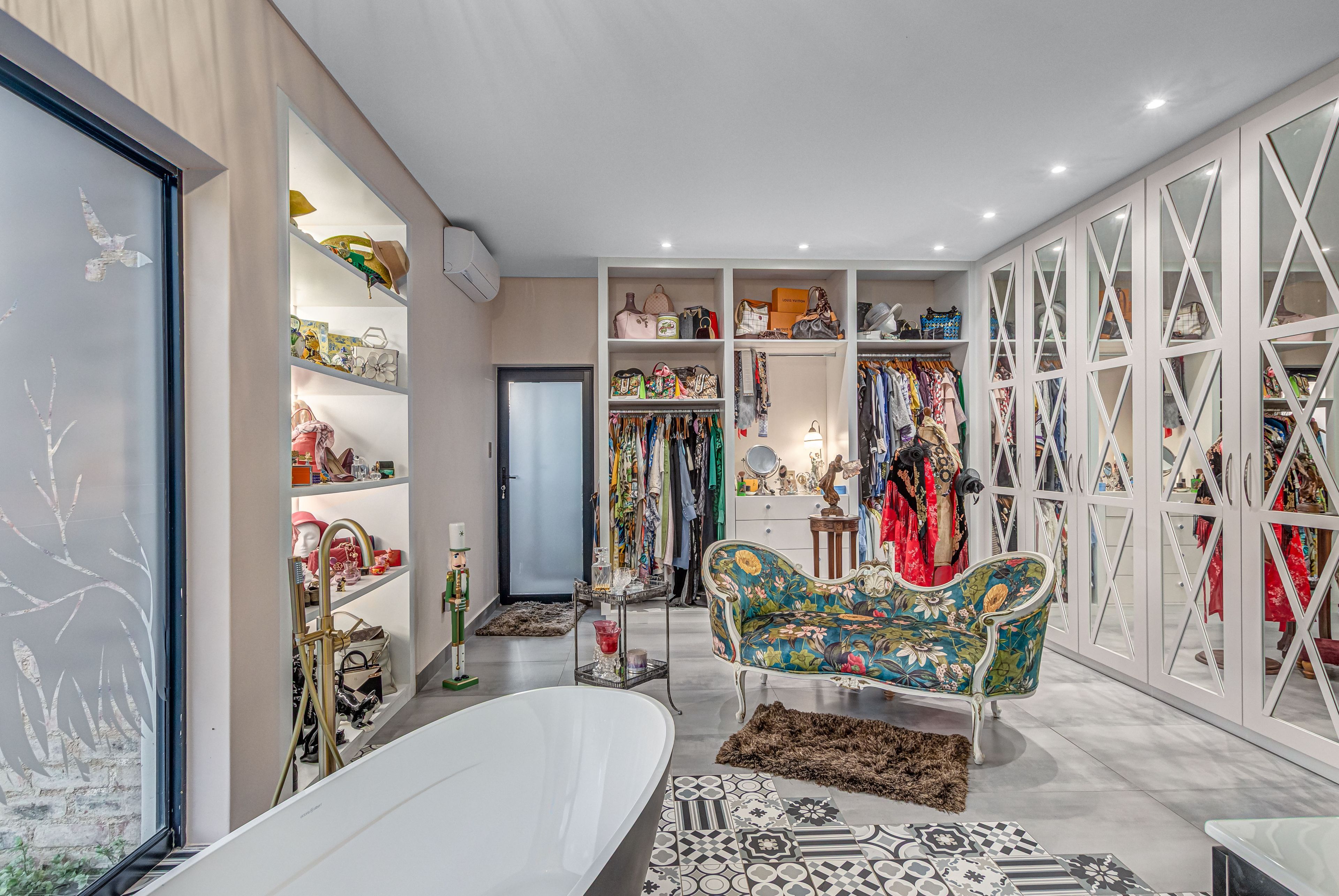6666 saint andrews street, centurion, gp, south africa. A truly unique residence in the prestigious copperleaf golf & country estate, just outside johannesburg, south africa. Offering inspired design, exceptional craftsmanship, and a lifestyle focused on comfort, beauty, and functionality. Set on a generous 1/3 acre lot with over 5500sq/ft under roof, this custom-built home blends architectural creativity with refined finishes and seamless indoor-outdoor living. The main home features three bedrooms, including an impressive primary suite with vaulted ceilings, panoramic garden views, a spacious walk-in closet, and a spa-inspired en-suite with double shower, heated towel rails and a freestanding victoria & albert tub. Thoughtful interior elements include a gourmet kitchen with premium appliances, rich cabinetry, open shelving, and direct garden access, along with curated wallpaper and lighting, handcrafted elements, and a hidden library and work nook tucked beneath a custom wrought-iron staircase. The living and dining areas flow effortlessly to the elegant english garden complete with water features and a natural filtration pool. This tranquil retreat is complemented by multiple entertaining zones including indoor and outdoor bars, a built in brai alfresco dining space, and a jacuzzi deck. A separate apartment provides exceptional flexibility, offering a private entrance, full kitchen and lounge, bedroom suite, dressing room, garden, and the ability to add a second bedroom as per existing plans, ideal for extended family or long-term guests. Sustainable features include a full sunsynk 8kw solar system, 12 solar panels, and dual water tanks. Residents of copperleaf enjoy world-class amenities including the ernie els signature golfcourse, wellness spa, fitness centre, swimming and sports facilities, clubhouse, café, walking and cycling trails, onsite schooling, and 24-hour security. . A truly eclectic offering in one of the estate's most exceptional settings.