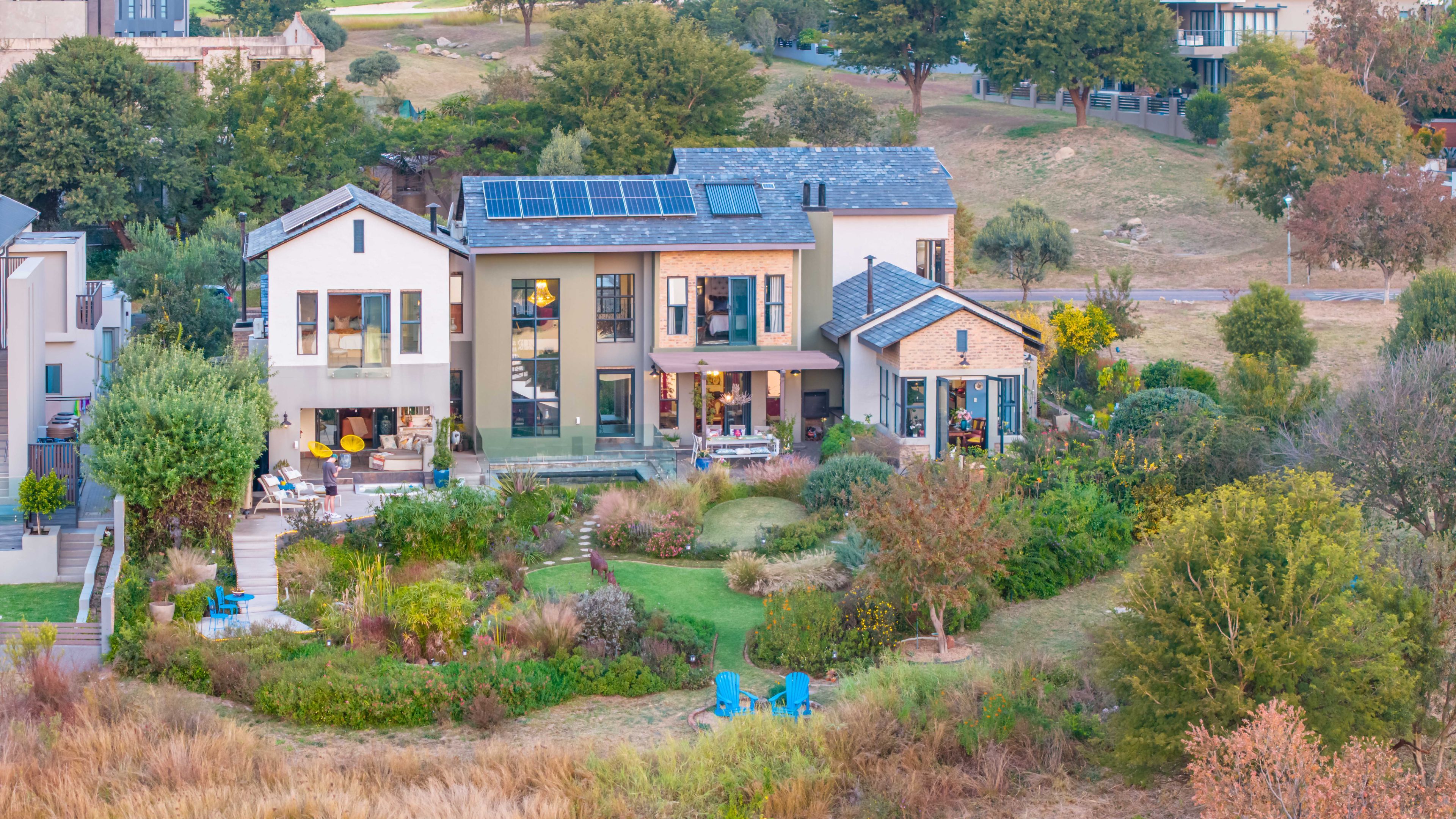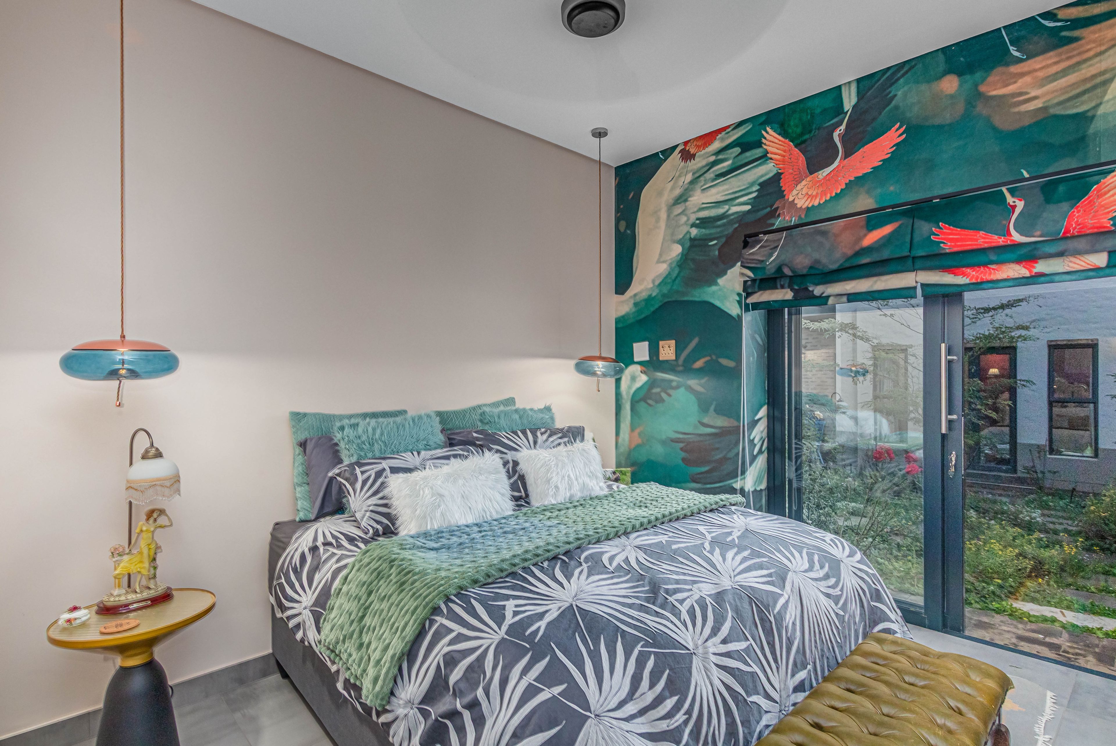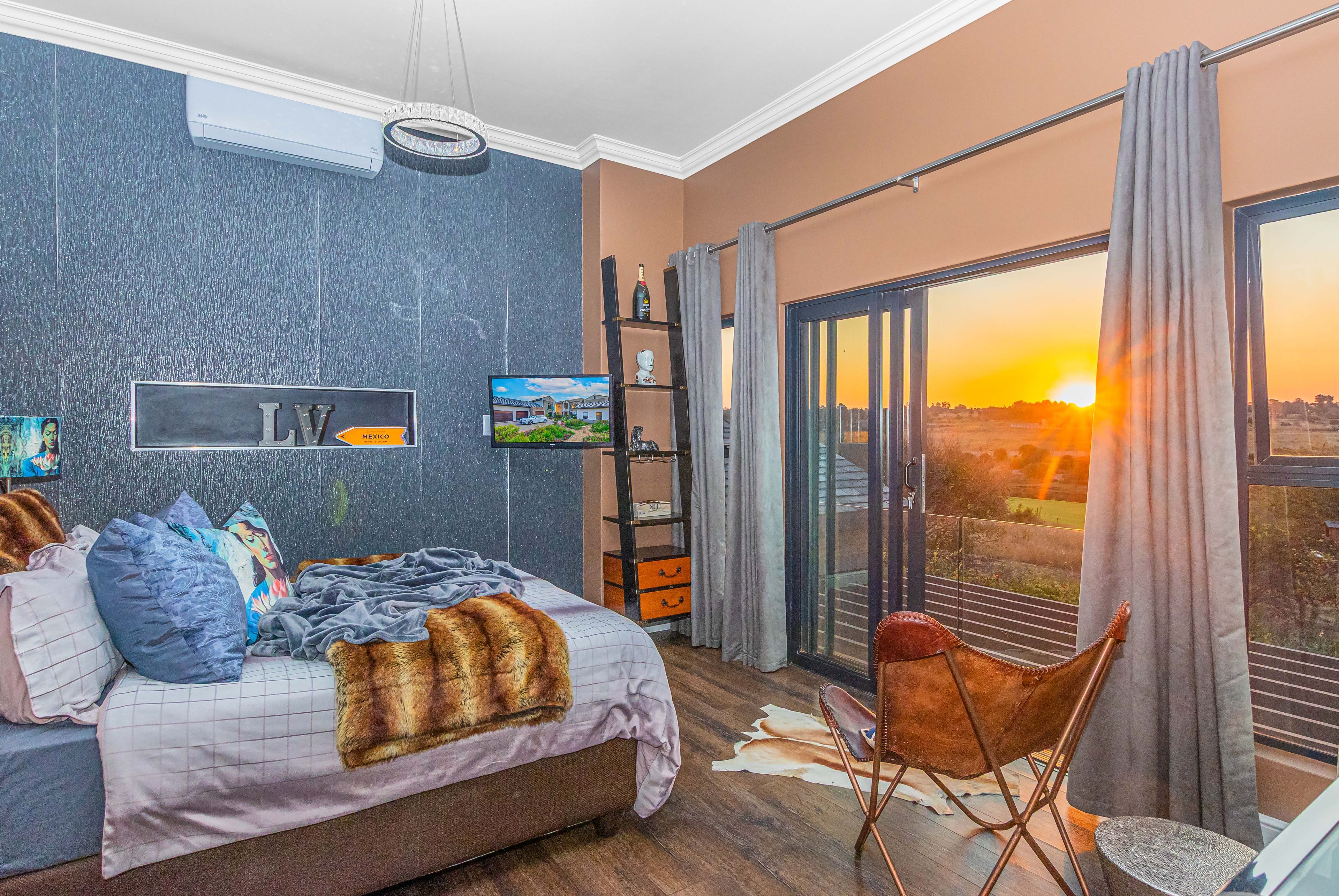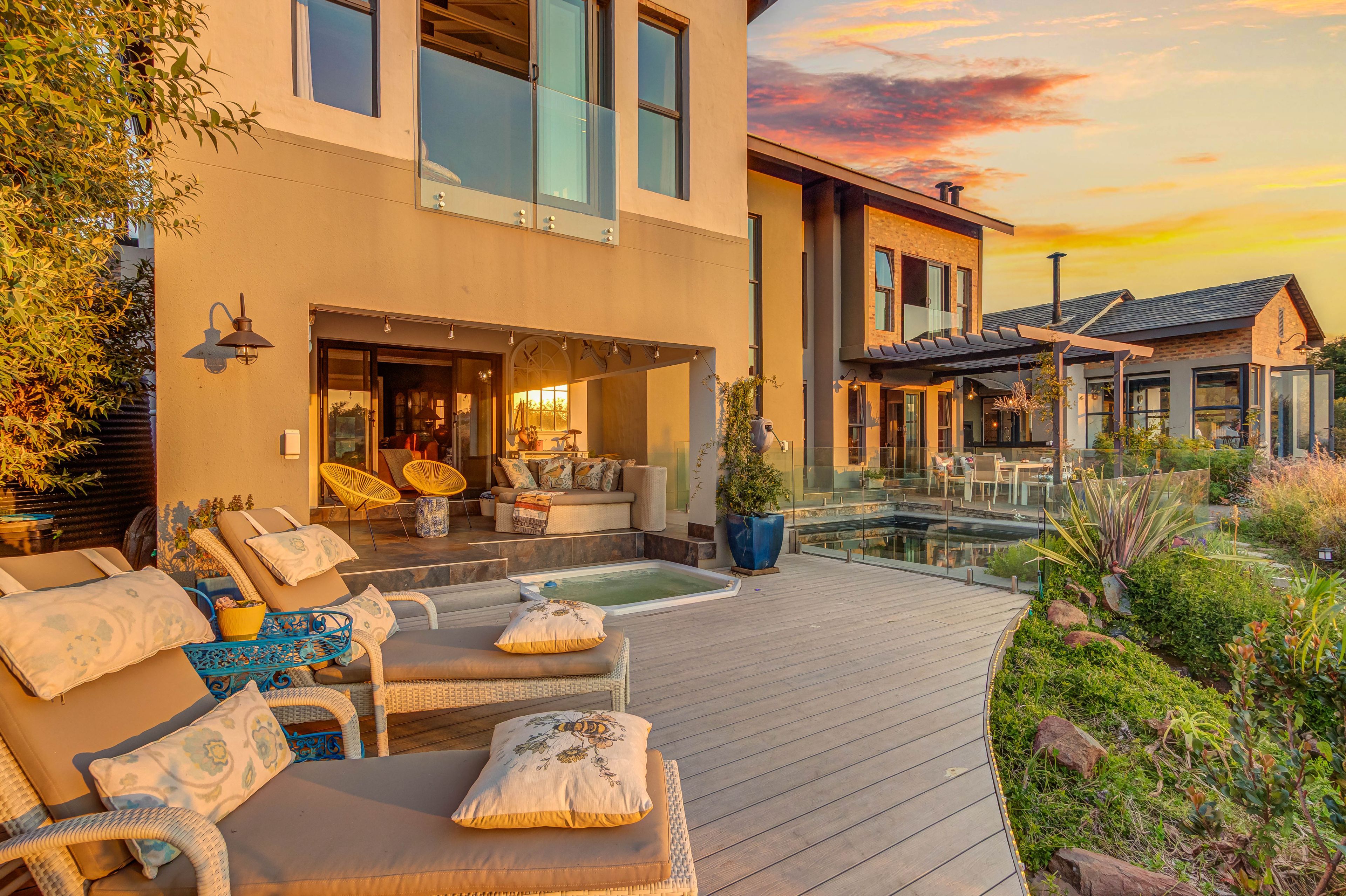 6666 saint andrews street, centurion, gp, south africa. A truly unique residence in the prestigious copperleaf golf & country estate, just outside johannesburg, south africa. Offering inspired design, exceptional craftsmanship, and a lifestyle focused on comfort, beauty, and functionality. Set on a generous 1/3 acre lot with over 5500sq/ft under roof, this custom-built home blends architectural creativity with refined finishes and seamless indoor-outdoor living. The main home features three bedrooms, including an impressive primary suite with vaulted ceilings, panoramic garden views, a spacious walk-in closet, and a spa-inspired en-suite with double shower, heated towel rails and a freestanding victoria & albert tub. Thoughtful interior elements include a gourmet kitchen with premium appliances, rich cabinetry, open shelving, and direct garden access, along with curated wallpaper and lighting, handcrafted elements, and a hidden library and work nook tucked beneath a custom wrought-iron staircase. The living and dining areas flow effortlessly to the elegant english garden complete with water features and a natural filtration pool. This tranquil retreat is complemented by multiple entertaining zones including indoor and outdoor bars, a built in brai alfresco dining space, and a jacuzzi deck. A separate apartment provides exceptional flexibility, offering a private entrance, full kitchen and lounge, bedroom suite, dressing room, garden, and the ability to add a second bedroom as per existing plans, ideal for extended family or long-term guests. Sustainable features include a full sunsynk 8kw solar system, 12 solar panels, and dual water tanks. Residents of copperleaf enjoy world-class amenities including the ernie els signature golfcourse, wellness spa, fitness centre, swimming and sports facilities, clubhouse, café, walking and cycling trails, onsite schooling, and 24-hour security. . A truly eclectic offering in one of the estate's most exceptional settings.