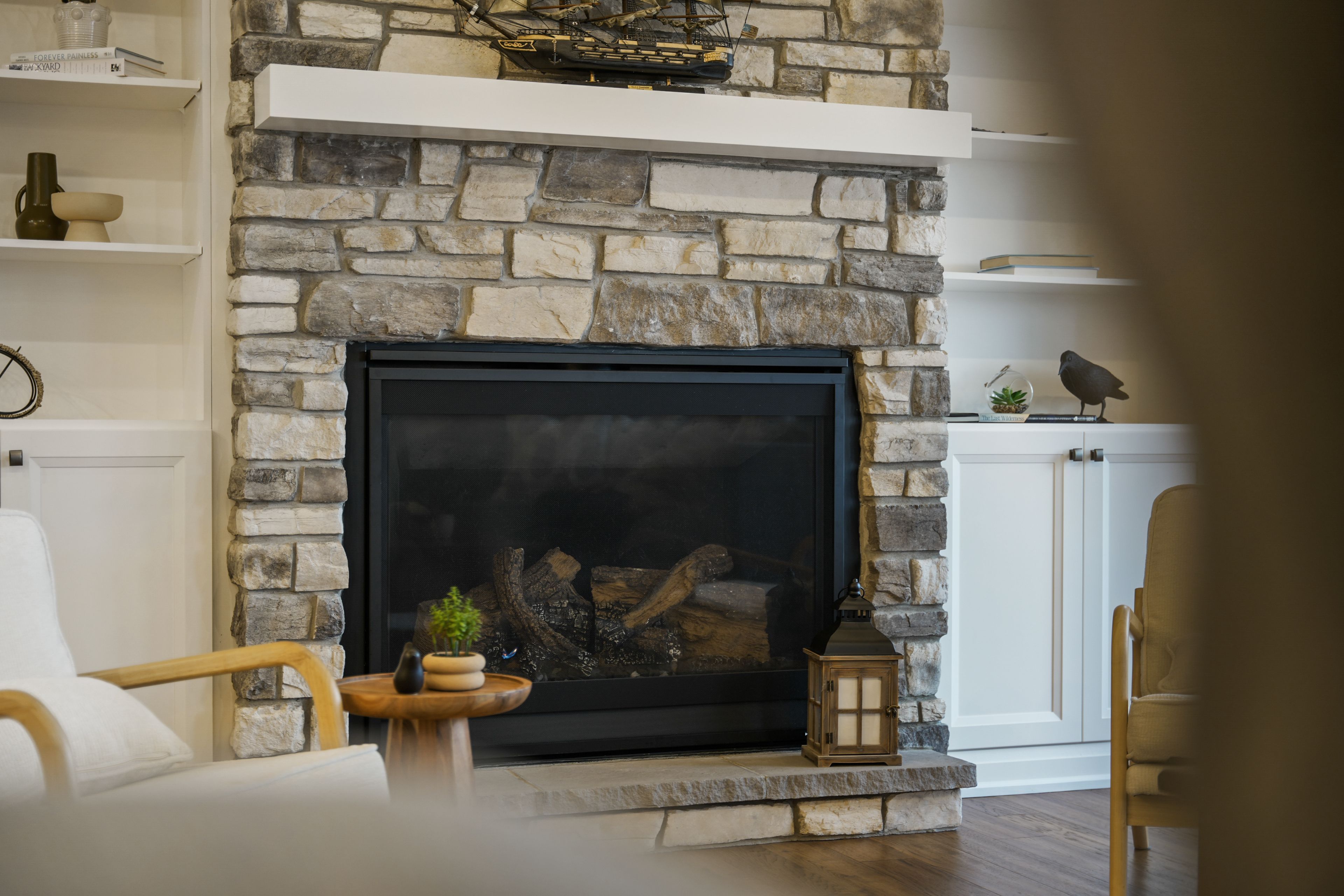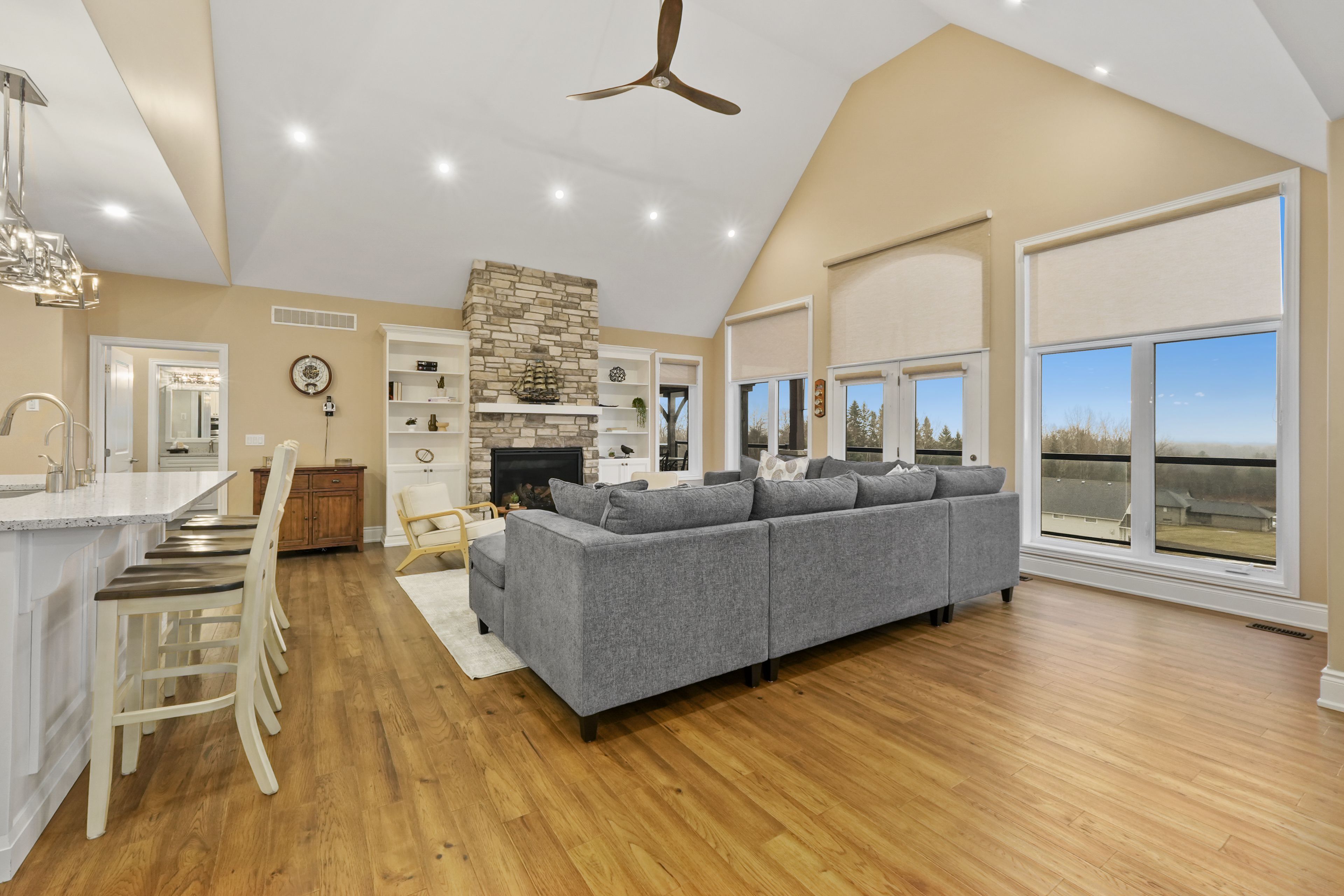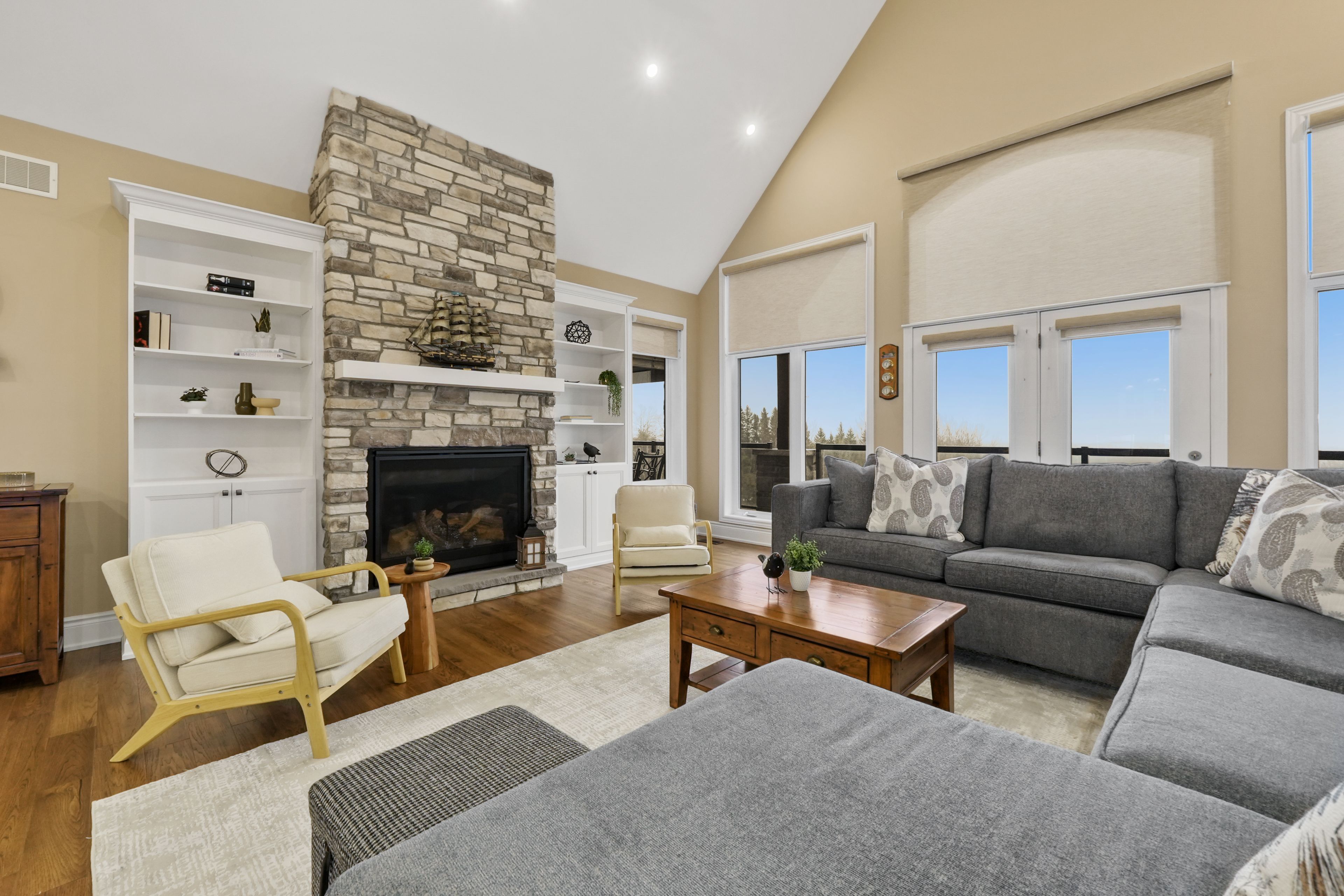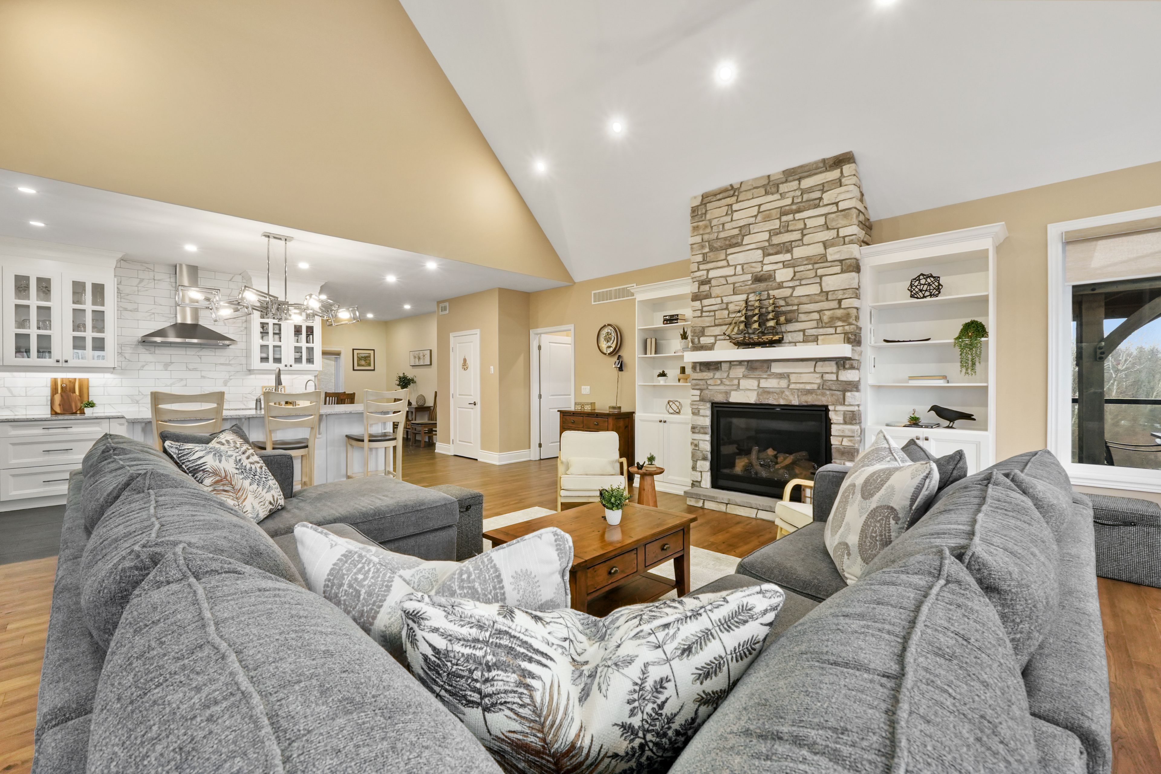• Cozy fireplace and vaulted ceiling create a welcoming atmosphere.
