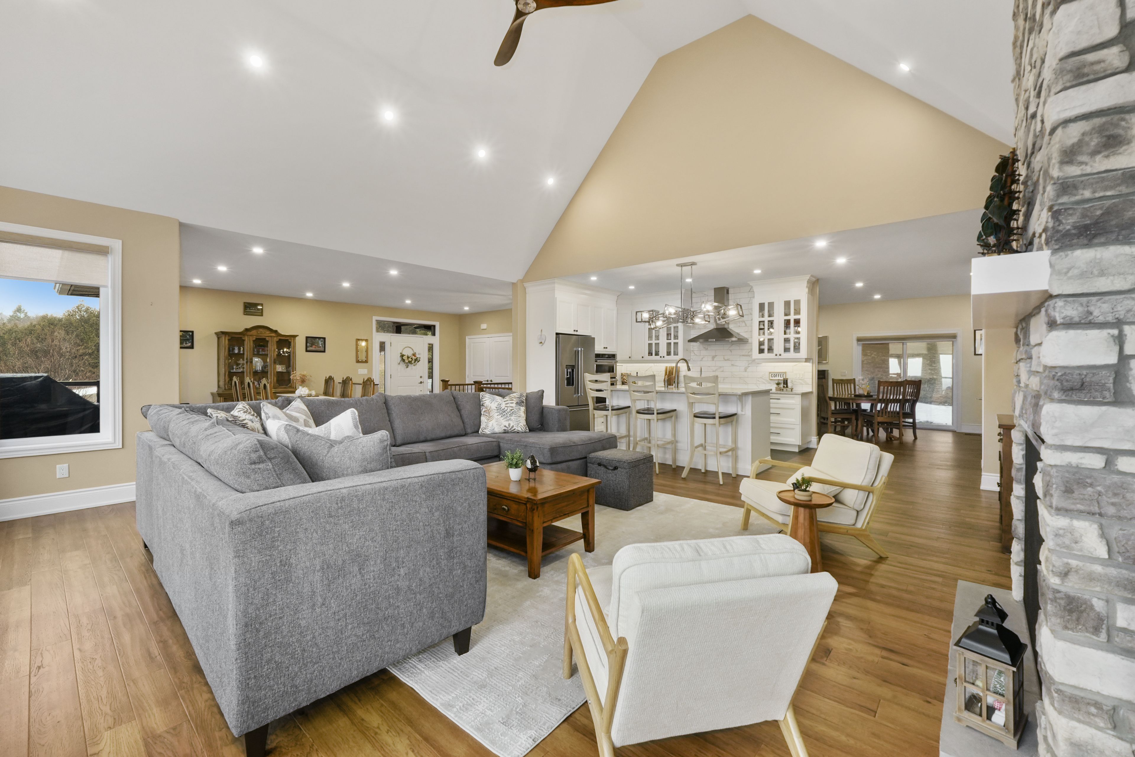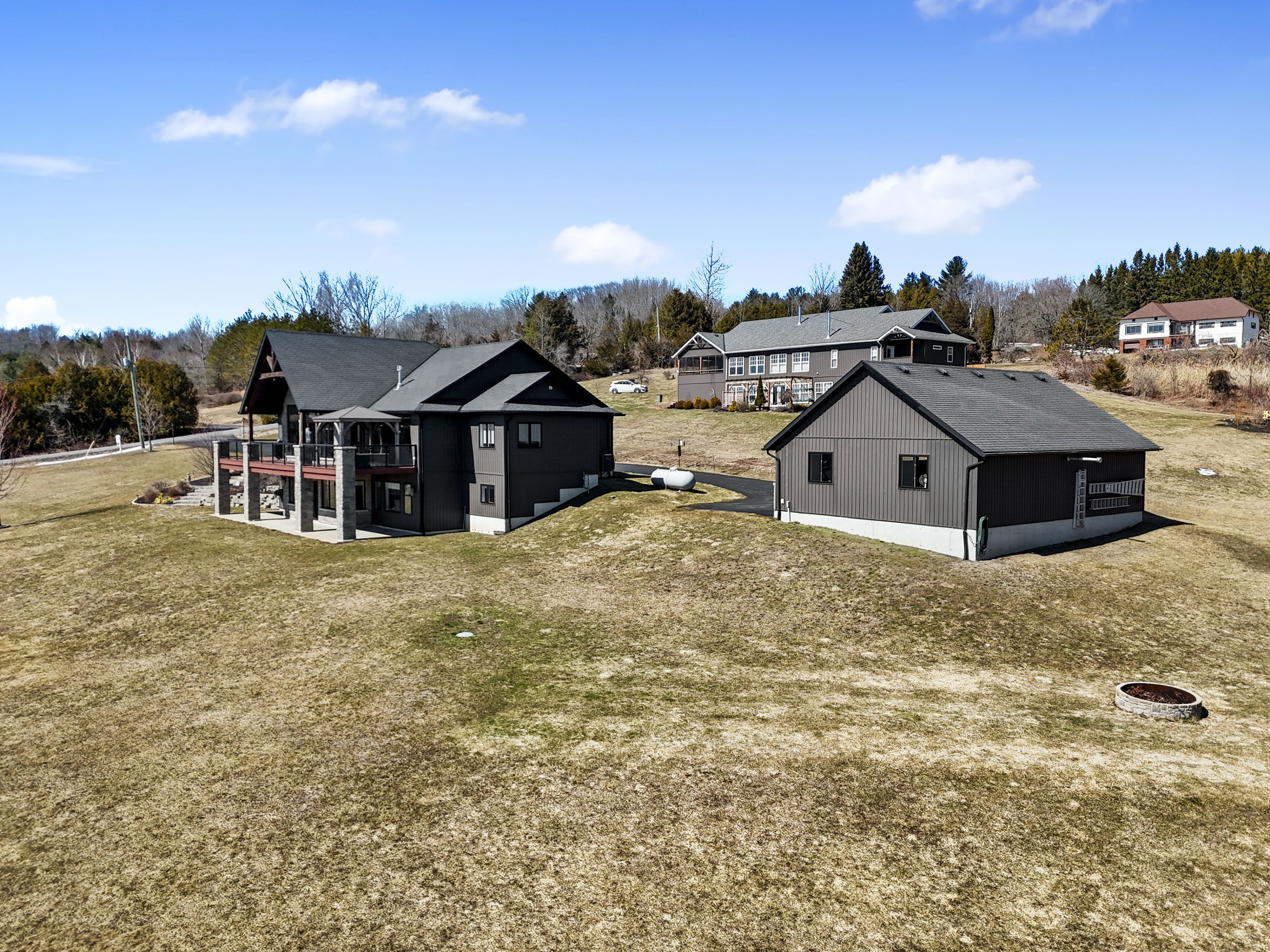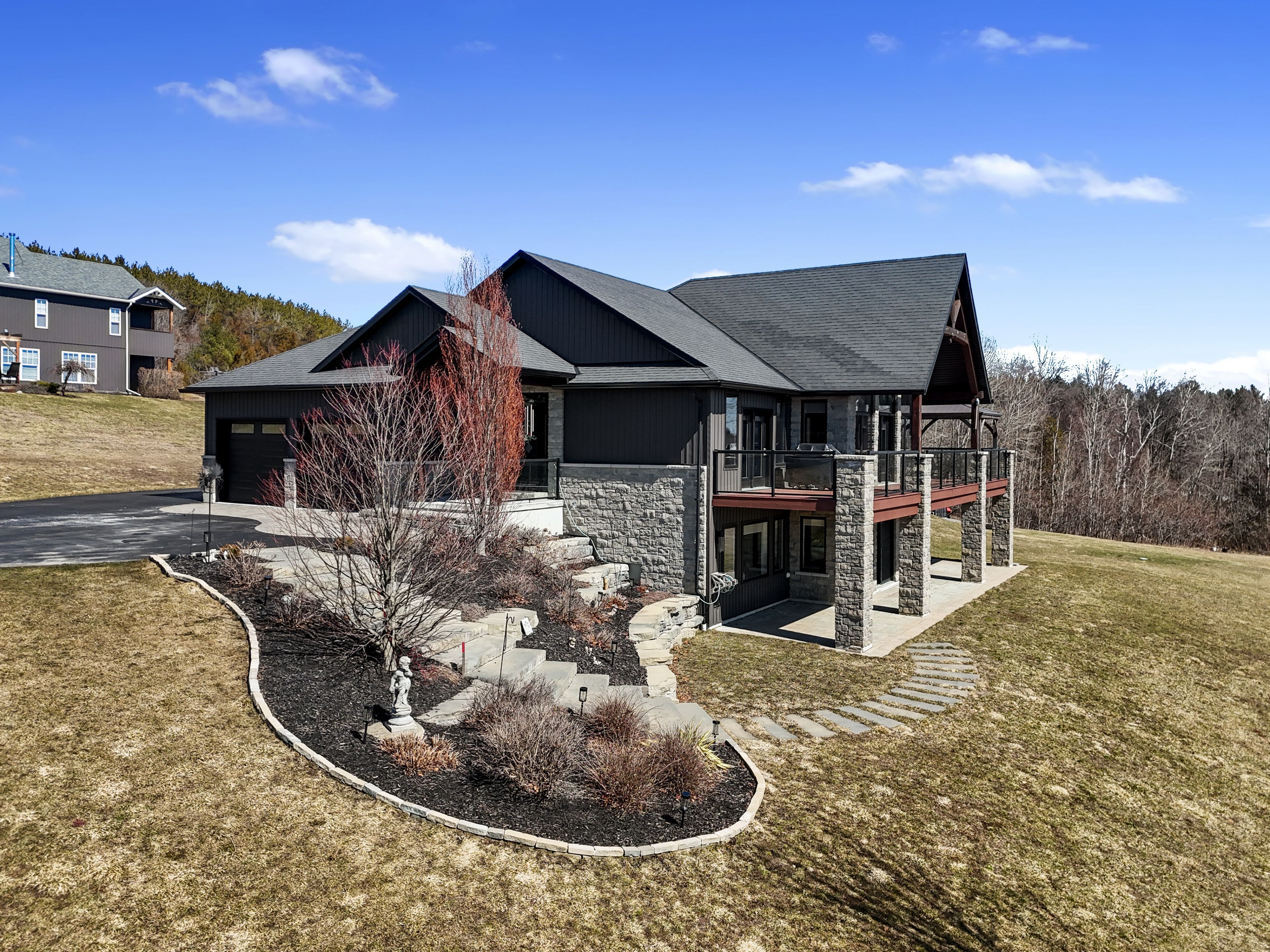 Featuring panoramic views of lake ontario, this beautifully designed bungalow offers space, privacy, and lifestyle in equal measure. The main floor welcomes you with a bright, open-concept living, kitchen, and dining area, where a dramatic vaulted ceiling and cozy fireplace create a warm, inviting focal point for everyday living and entertaining. Large windows fill the space with natural light. The thoughtful layout keeps family and guests comfortably connected, and multiple walk-outs to the deck allow conversation to flow effortlessly from indoors to out, creating the perfect setting for summer evenings overlooking the beautiful gardens and lake beyond. The kitchen is designed for both style and function, complemented by a convenient walk-in pantry that offers excellent storage and organization. Designed for convenience, the main level also features two bedrooms, including the spacious primary suite, a second full bathroom, and main floor laundry, making day-to-day living easy and functional. The primary suite is a true retreat, complete with its own walk-out to the deck and a generous ensuite featuring a large corner jacuzzi tub, separate glass shower, and comfortable in-floor heating for added everyday luxury. Closets throughout the home are thoughtfully designed with built-in organizers for practical and efficient storage. The lower level has in-floor heating throughout and offers exceptional flexibility with a large recreation area complete with a wet bar, dedicated media room perfect for movie nights or game days, two spacious bedrooms, an office nook, and another bathroom. Car enthusiasts will appreciate the attached, heated two-car garage complete with epoxy flooring and a substantial heated detached garage, totalling five garage spaces. With nearby cycling trails, apple orchards, and presqu'ile provincial park, plus the convenience of being just minutes from the 401, this property blends rural tranquillity with the very best of northumberland county living.