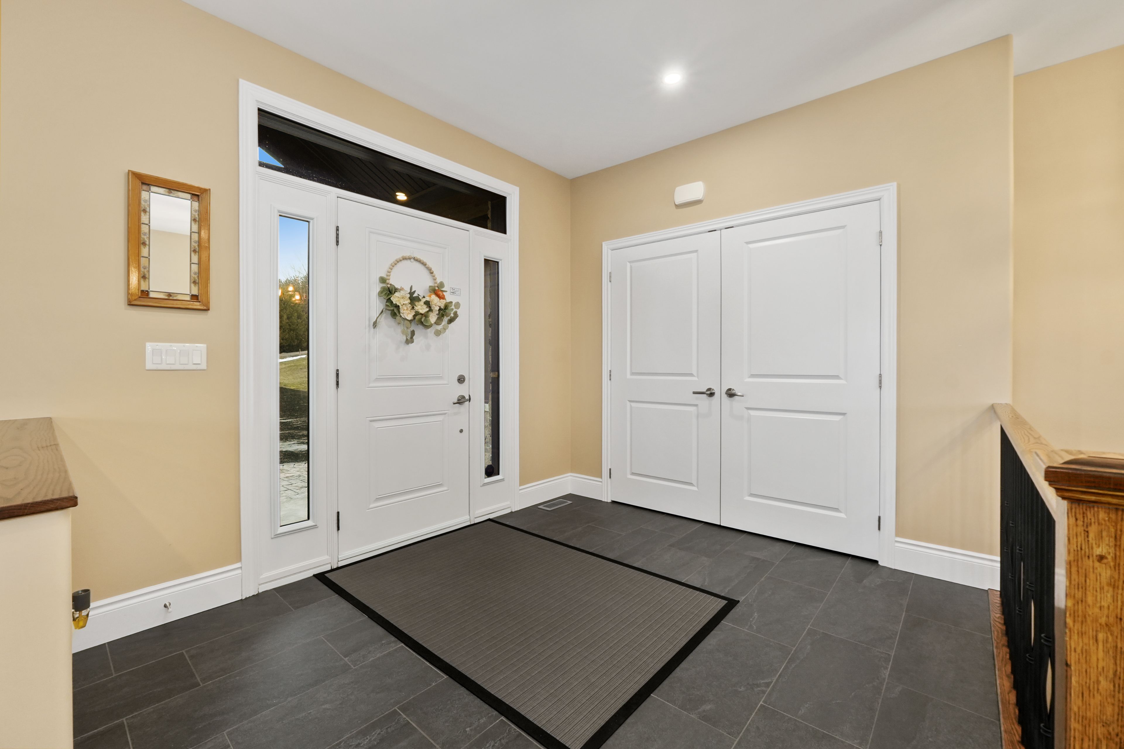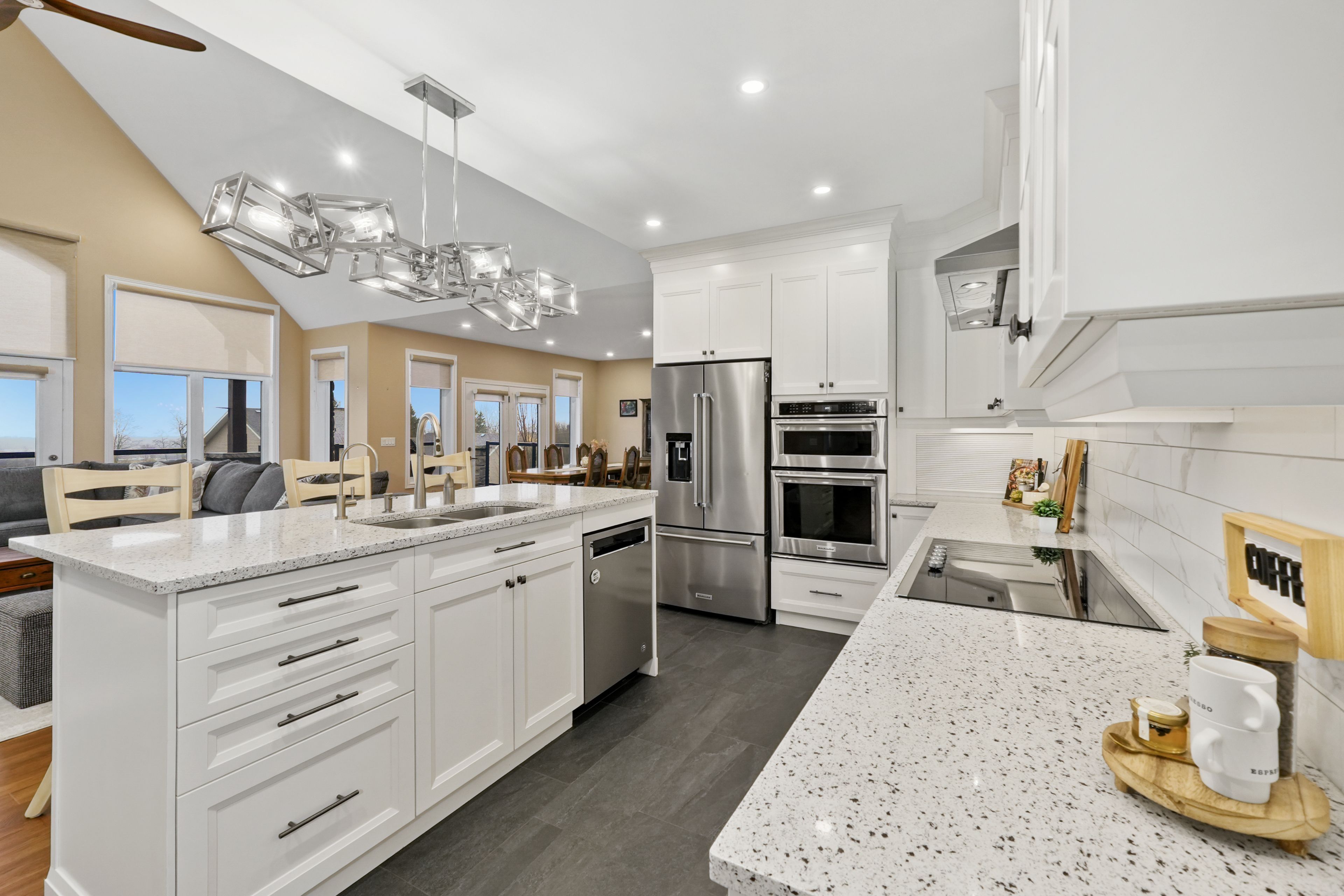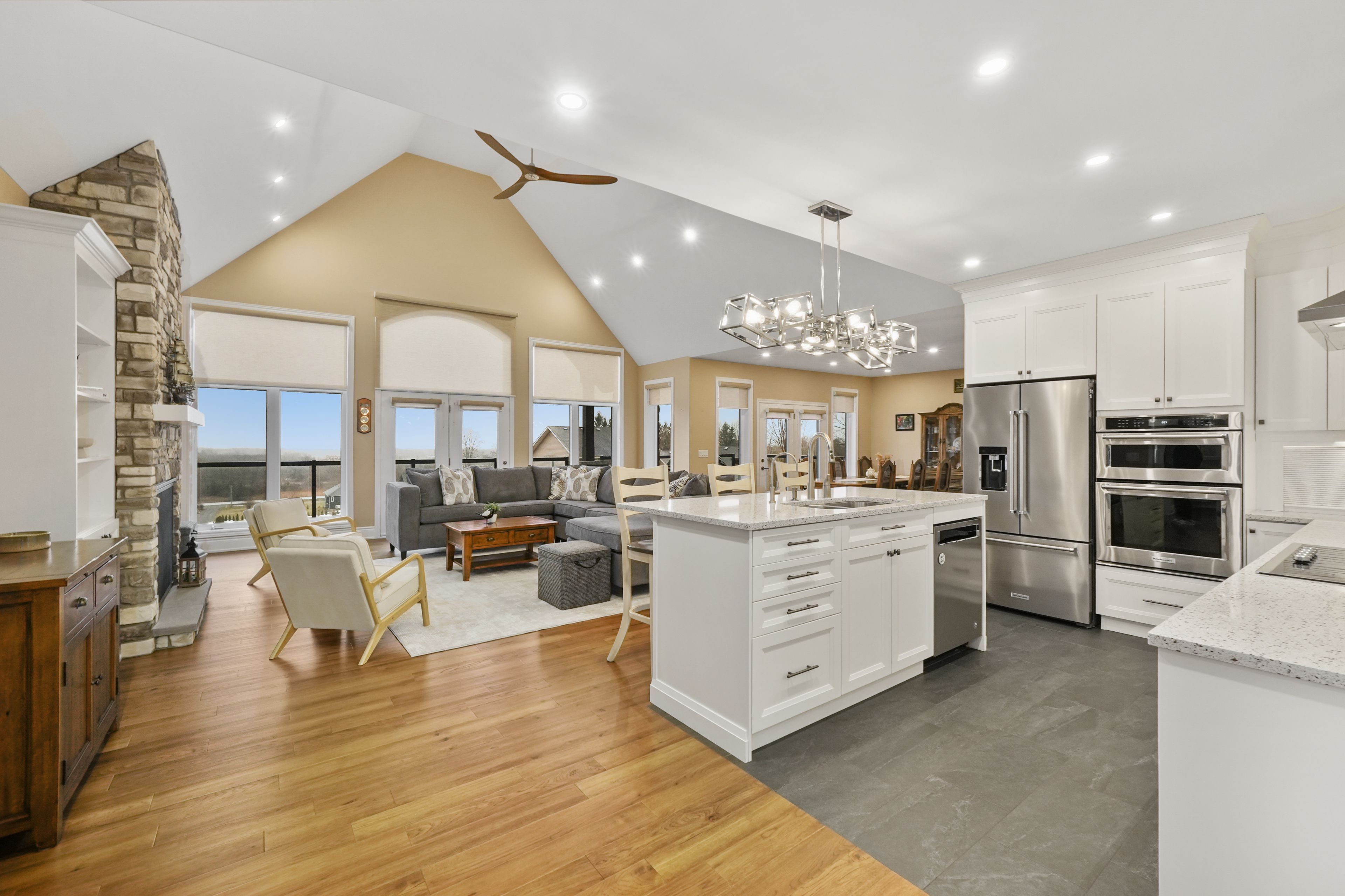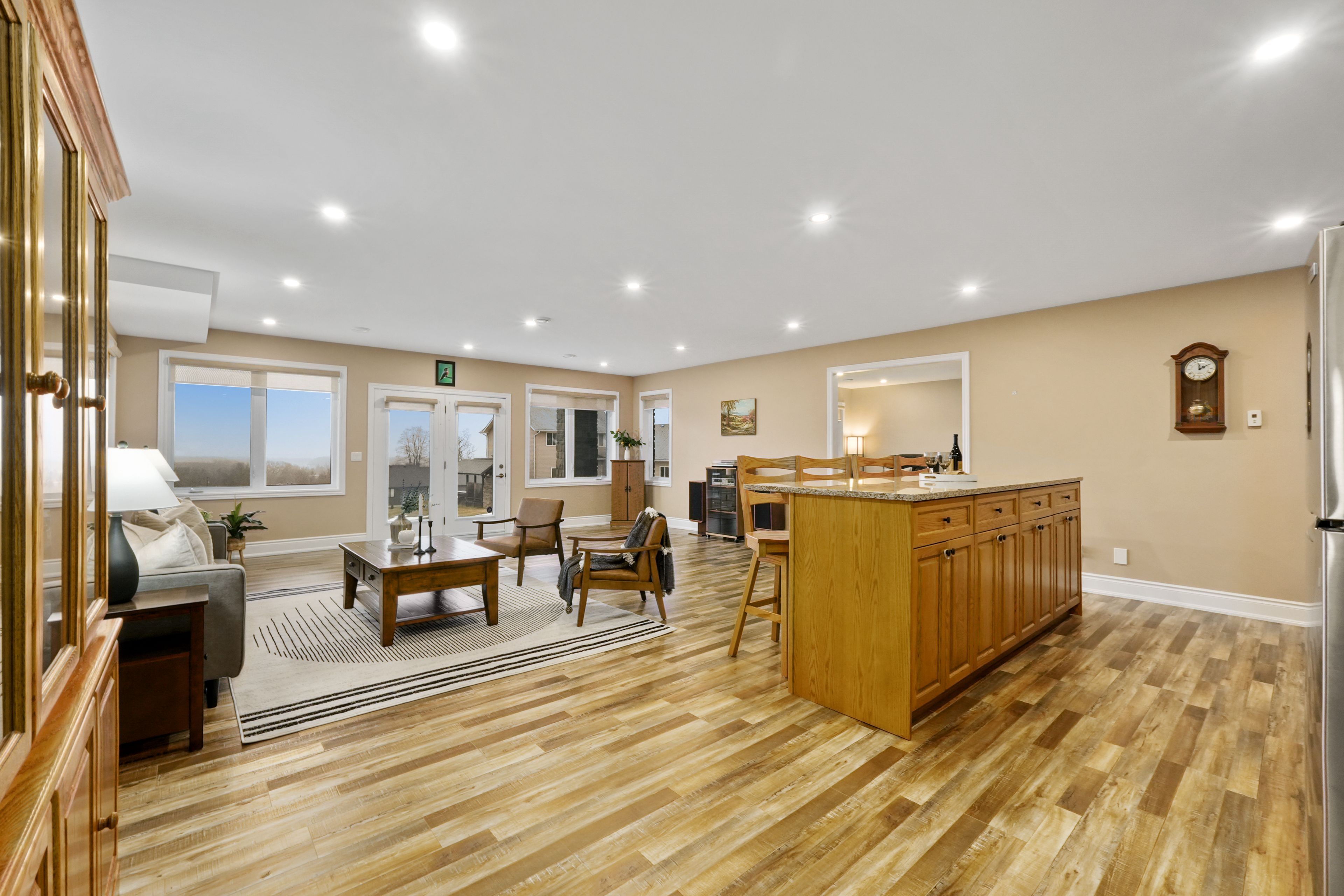 Featuring panoramic views of lake ontario, this beautifully designed bungalow offers space, privacy, and lifestyle in equal measure. The main floor welcomes you with a bright, open-concept living, kitchen, and dining area, where a dramatic vaulted ceiling and cozy fireplace create a warm, inviting focal point for everyday living and entertaining. Large windows fill the space with natural light. The thoughtful layout keeps family and guests comfortably connected, and multiple walk-outs to the deck allow conversation to flow effortlessly from indoors to out, creating the perfect setting for summer evenings overlooking the beautiful gardens and lake beyond. The kitchen is designed for both style and function, complemented by a convenient walk-in pantry that offers excellent storage and organization. Designed for convenience, the main level also features two bedrooms, including the spacious primary suite, a second full bathroom, and main floor laundry, making day-to-day living easy and functional. The primary suite is a true retreat, complete with its own walk-out to the deck and a generous ensuite featuring a large corner jacuzzi tub, separate glass shower, and comfortable in-floor heating for added everyday luxury. Closets throughout the home are thoughtfully designed with built-in organizers for practical and efficient storage. The lower level has in-floor heating throughout and offers exceptional flexibility with a large recreation area complete with a wet bar, dedicated media room perfect for movie nights or game days, two spacious bedrooms, an office nook, and another bathroom. Car enthusiasts will appreciate the attached, heated two-car garage complete with epoxy flooring and a substantial heated detached garage, totalling five garage spaces. With nearby cycling trails, apple orchards, and presqu'ile provincial park, plus the convenience of being just minutes from the 401, this property blends rural tranquillity with the very best of northumberland county living.