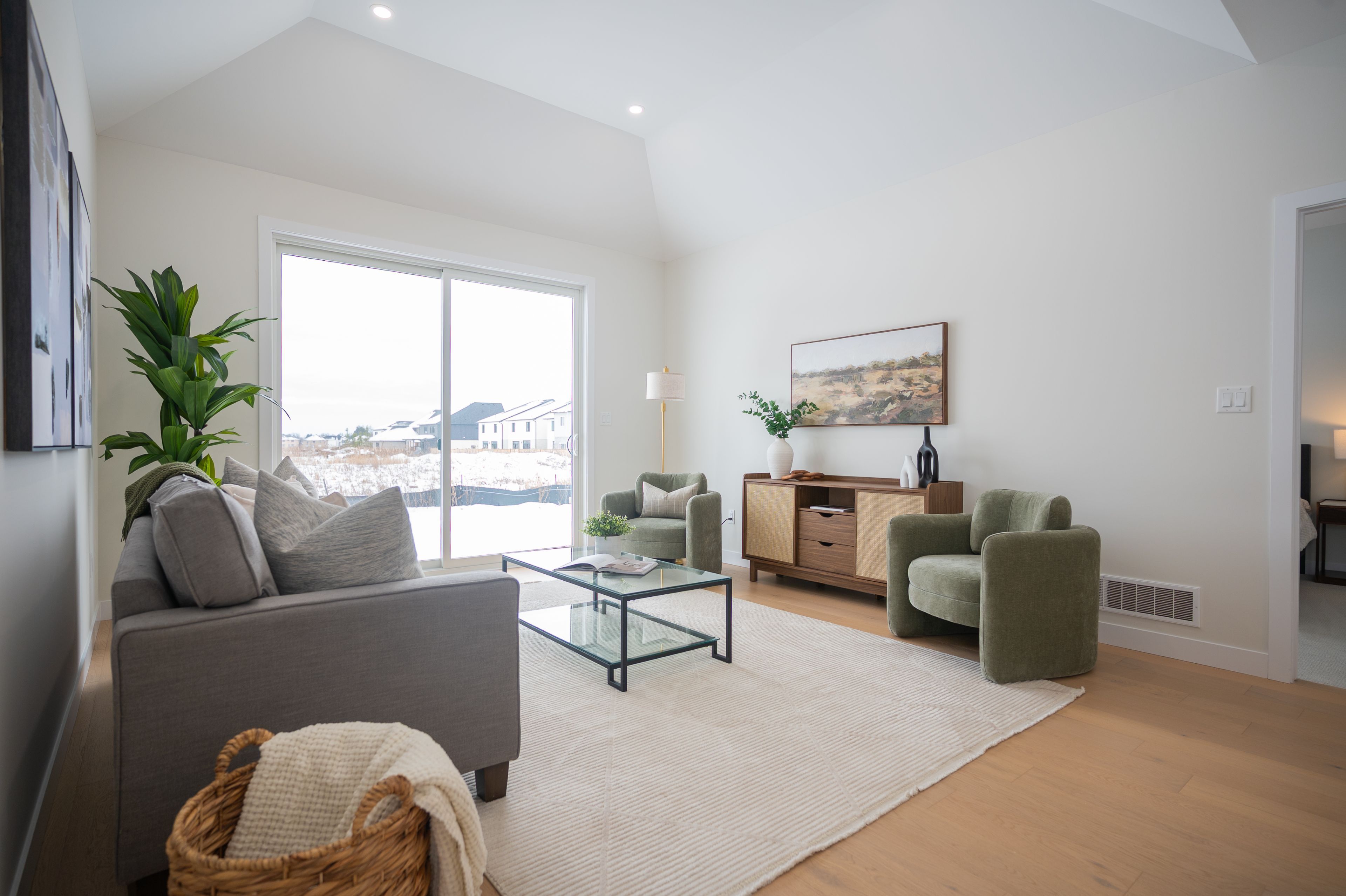 • Open-concept layout with bright kitchen and vaulted ceiling for airy living.