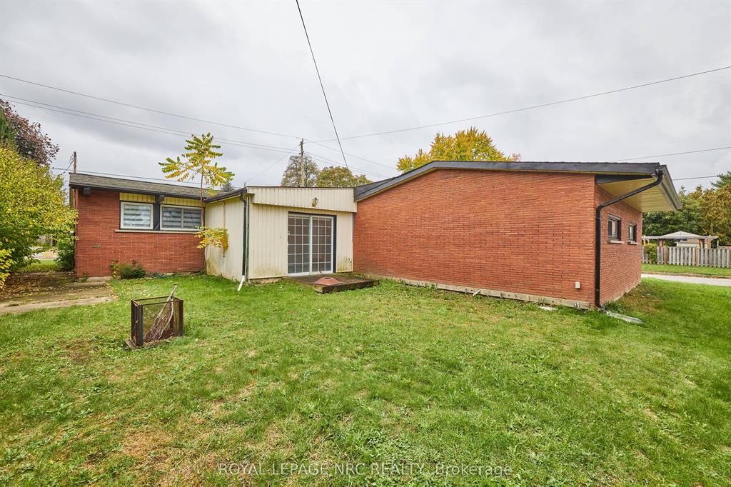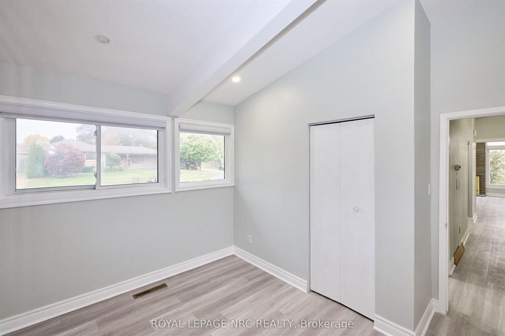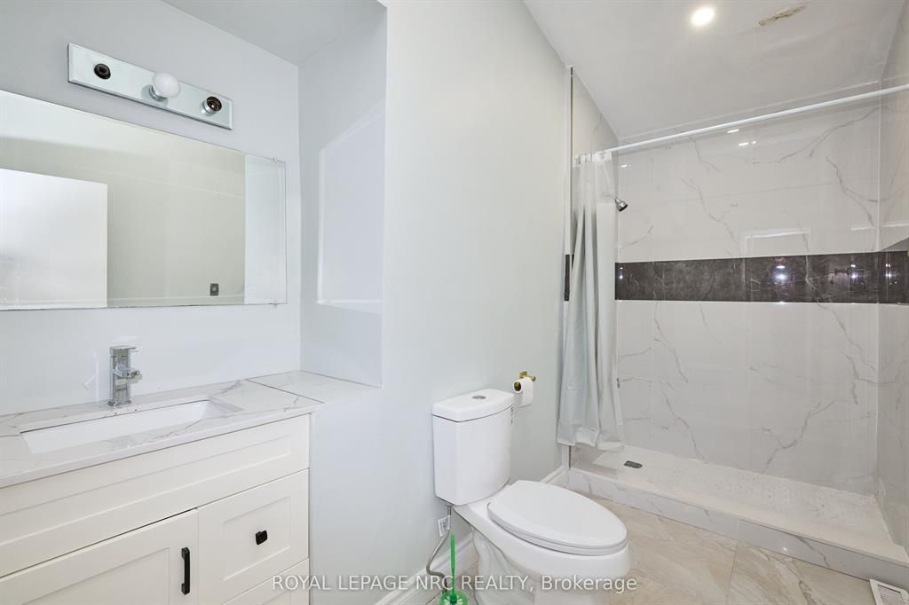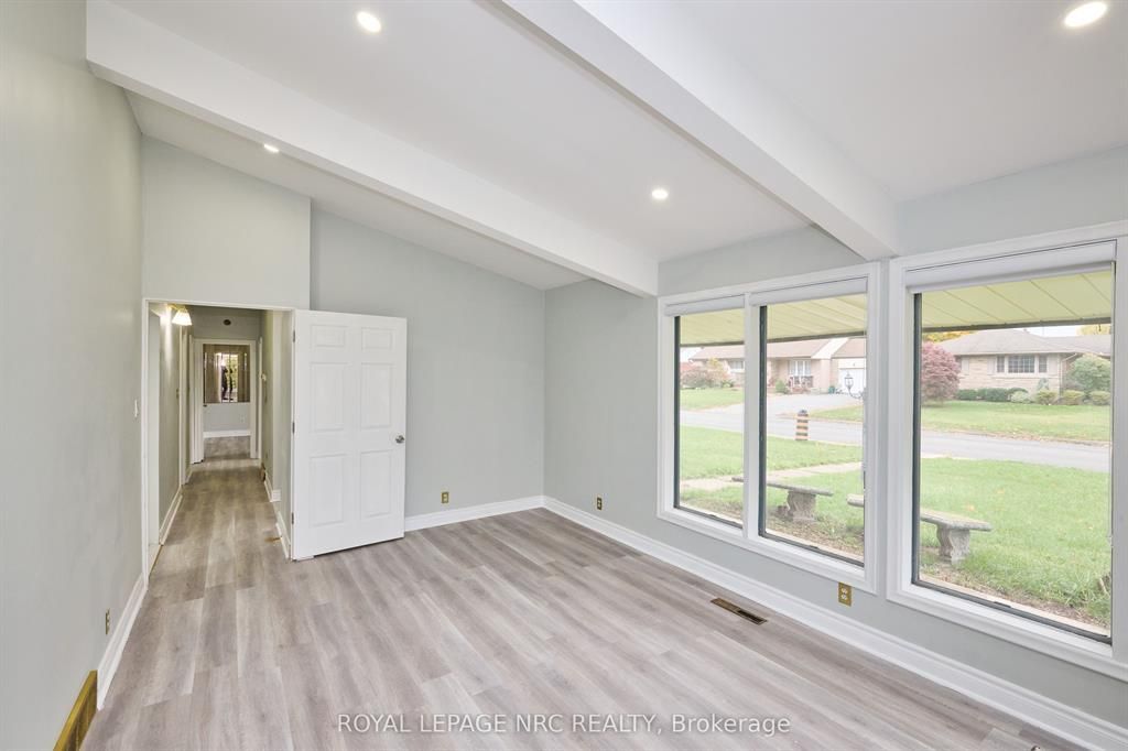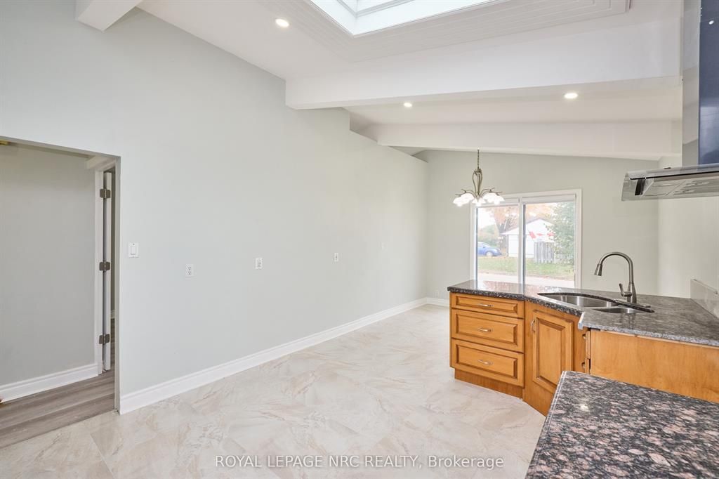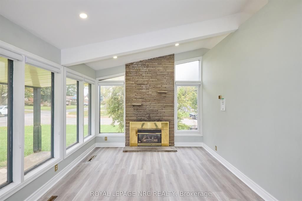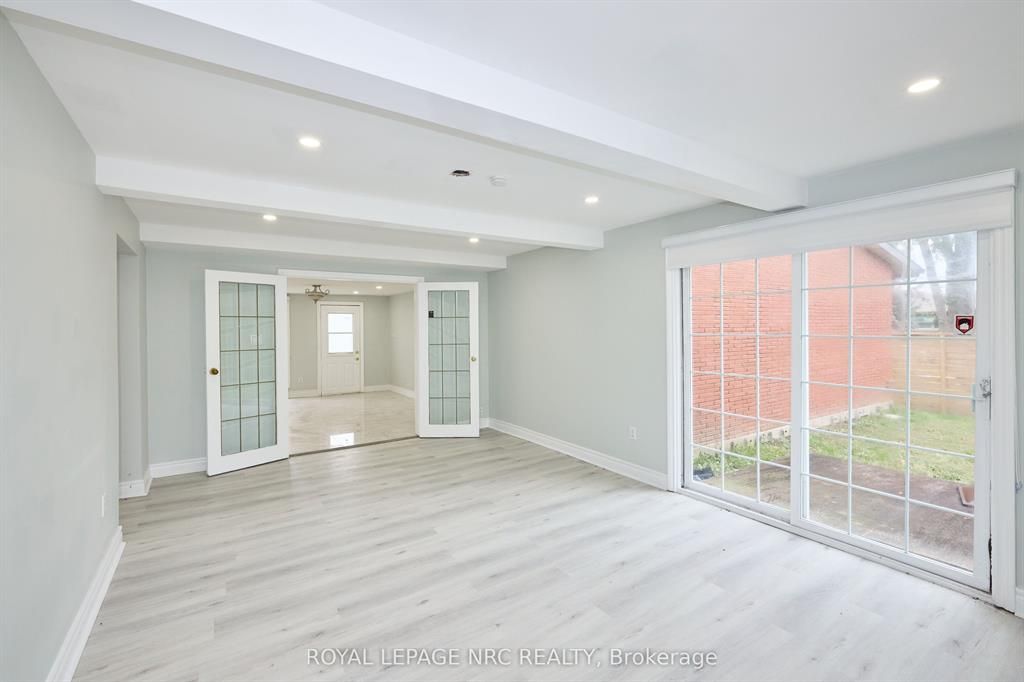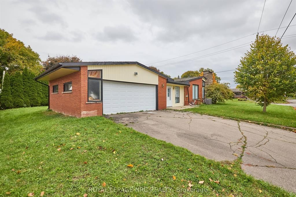 Large 3+2 bedroom bungalow with 2 car garage, located in the heart of stamford center. This unique and spacious layout features a kitchen skylight and vaulted ceilings. A large dining area with french doors leads to a family room and bedroom with updated laminate flooring. Patio doors off the family room lead to a private backyard deck with a fenced-in backyard. An attached living room with vaulted ceilings and plenty of windows offers natural light. A brick reclaimed ceiling height, gas fireplace, and four-piece bathroom are also included. The main four-piece bathroom, large living room, and two bedrooms are located on the main floor. This bungalow is within walking distance of shopping, restaurants, and schools.